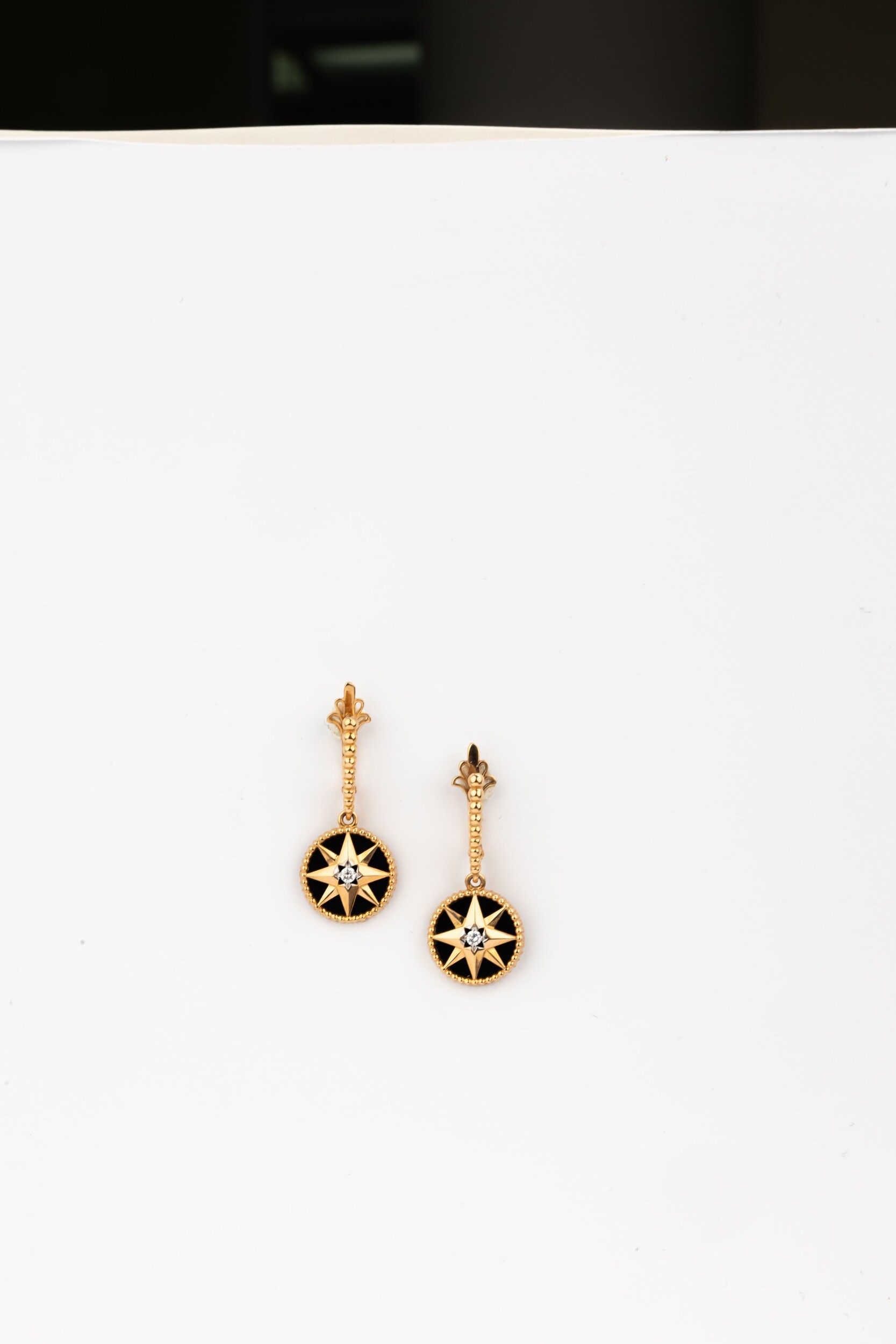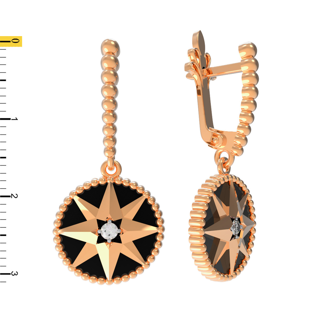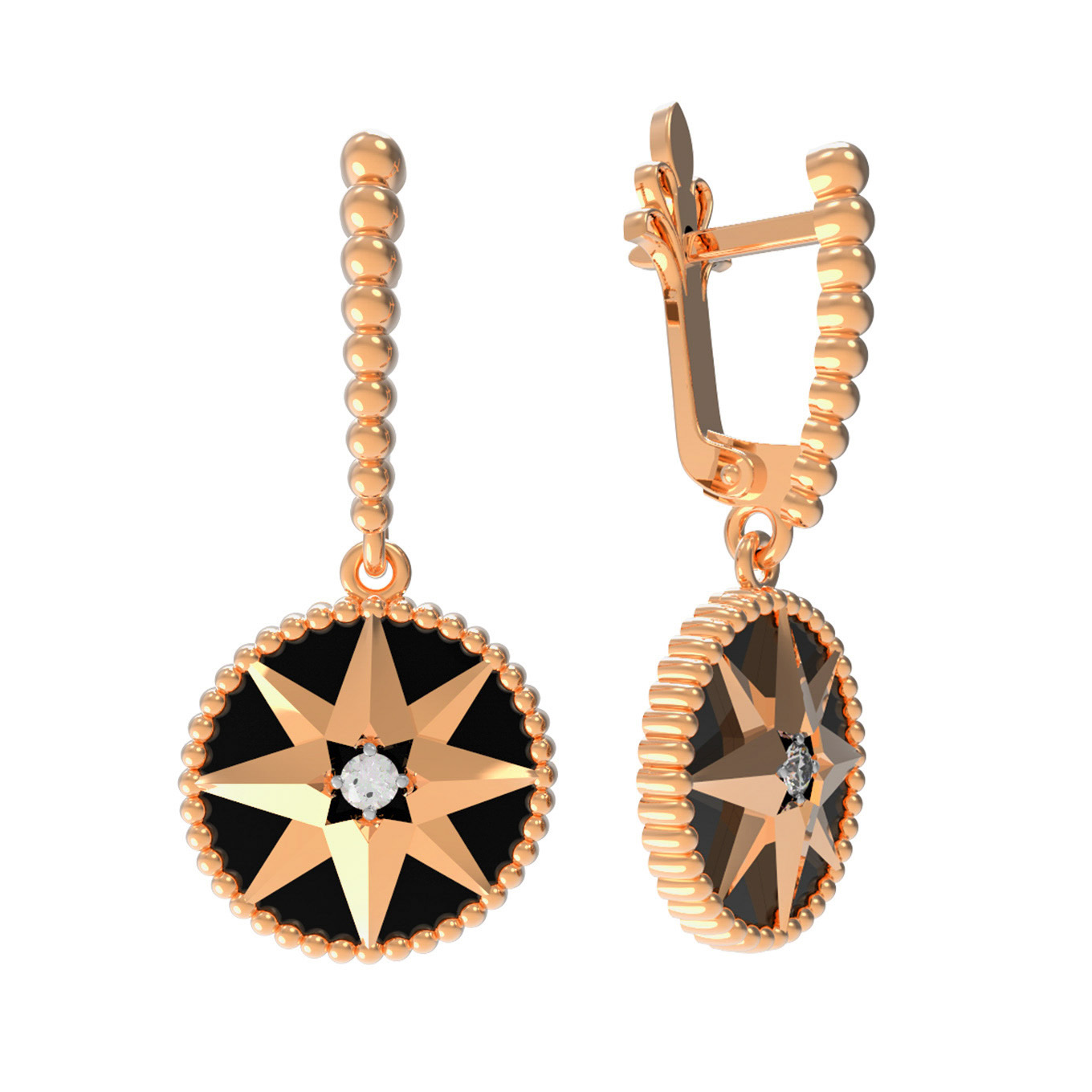 Основным элементом дизайна является выразительная тематика звезд, которая придает украшению особую глубину и символизм. В центре композиции расположены вставки из черного оникса, создающие эффектный контраст с золотой оправой. Изящный акцент добавляют четыре круглых фианита с белым цветом вставок, которые мягко переливаются при каждом движении. Сочетание черного и белого цвета вставок, обрамленных красным золотом, создает гармоничный и завершенный образ.