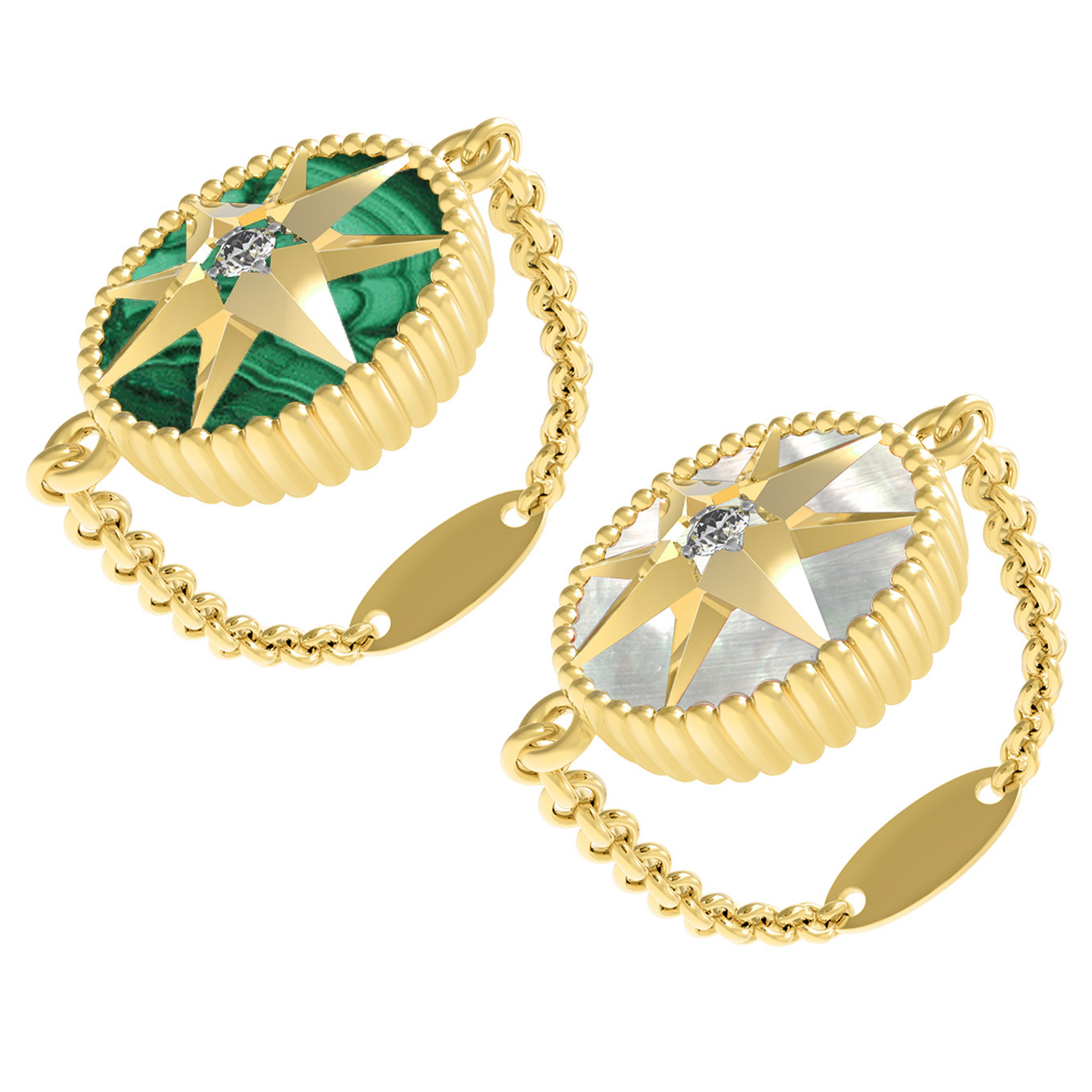 Декоративная часть кольца выполнена с использованием благородного малахита и нежного перламутра. Зеленый цвет малахита и мягкое сияние перламутра создают завораживающий контраст, дополненный блеском 24 вставок фианита круглой формы. Лимонный оттенок золота гармонично связывает все элементы композиции, превращая украшение в настоящий арт-объект. Такая игра фактур делает кольцо акцентным, при этом сохраняя элегантность.