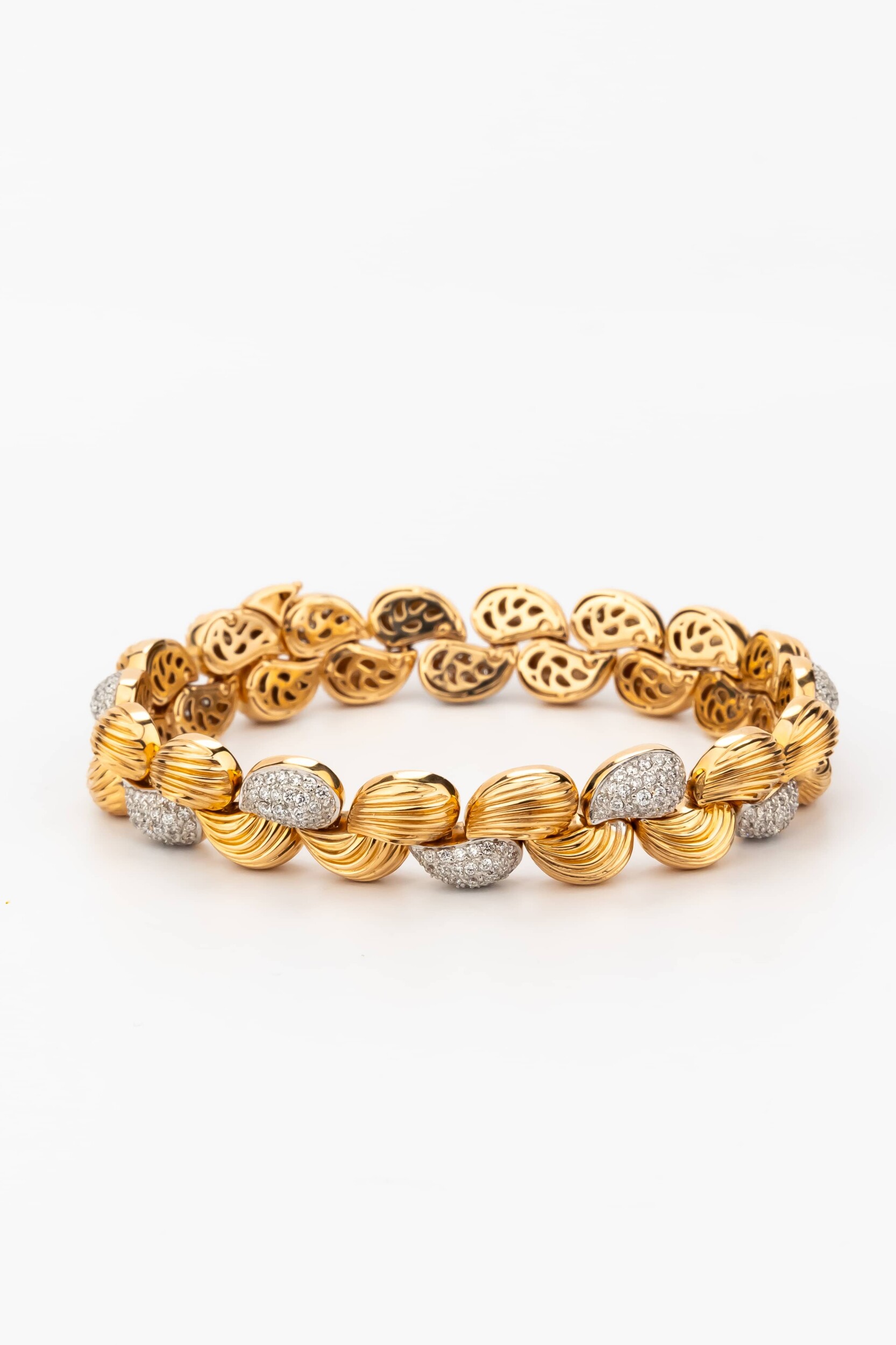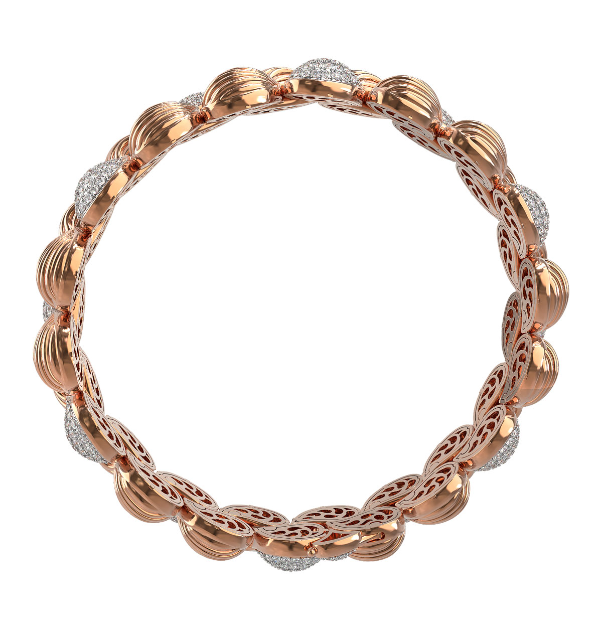 Особое внимание привлекает инкрустация: 389 бриллиантов круглой формы с классическим белым цветом вставок рассыпаны по поверхности браслета, словно капли утренней росы. Такое внушительное количество камней обеспечивает невероятное сияние при любом освещении, превращая украшение в настоящий шедевр ювелирного искусства. Сложная художественная ажурная обработка внутренней части звеньев придает изделию дополнительную изысканность.