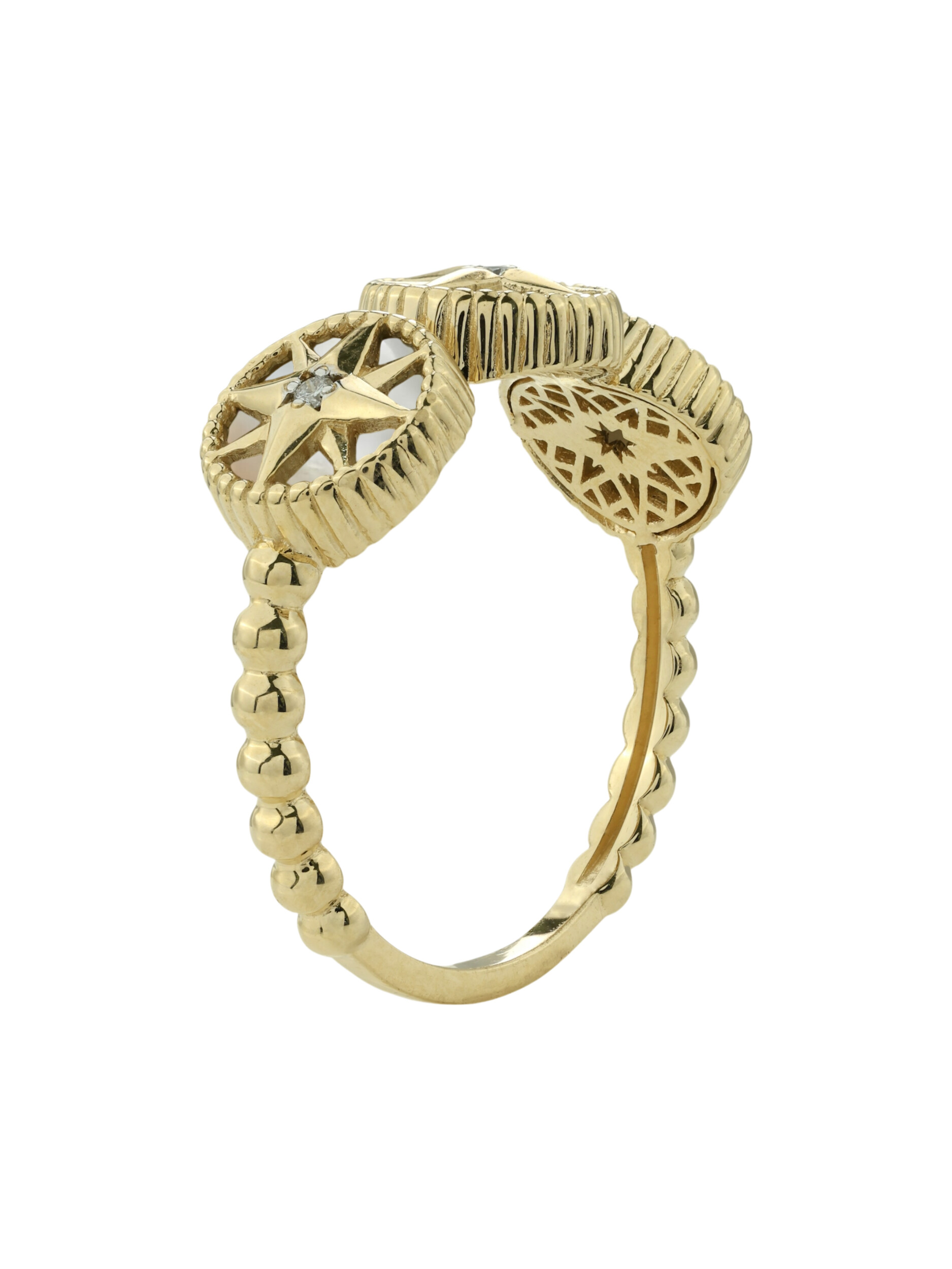 Центральная часть композиции украшена четырьмя вставками круглой формы: сияющими бриллиантами, которые добавляют изделию премиального блеска. Каждая деталь тщательно проработана, создавая гармоничный и сбалансированный визуальный ряд. Данное кольцо из коллекции De Luxe — Звёзды — Бриллианты станет идеальным выбором как для женщин, так и для мужчин, предпочитающих выразительные аксессуары со смыслом. Изделие органично дополнит вечерний наряд или станет эффектным завершением повседневного стиля.