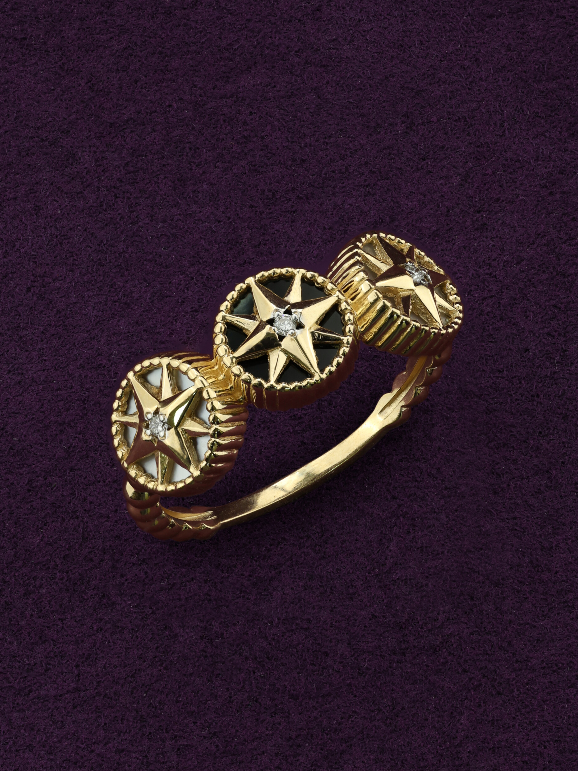 Роскошное кольцо из лимонного золота 585 пробы — яркий акцент, способный преобразить любой образ. Дизайн украшения, выполненный в стилистике звезд, притягивает внимание своей детализацией и оригинальным сочетанием материалов. Ювелиры использовали контрастный дуэт черного оникса и нежного перламутра, которые подчеркивают глубину и благородство лимонного оттенка металла.