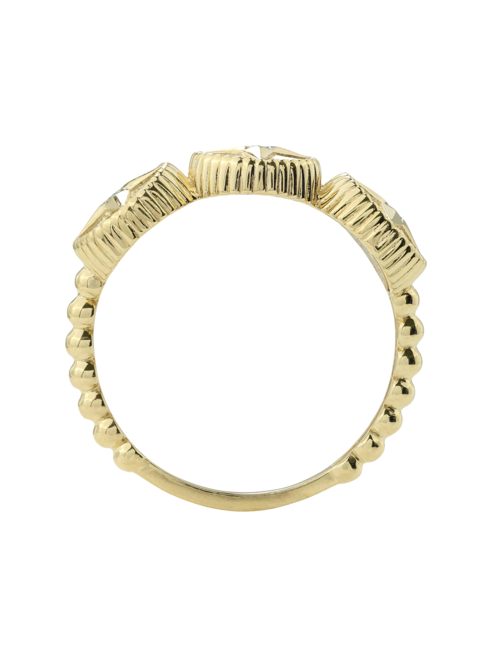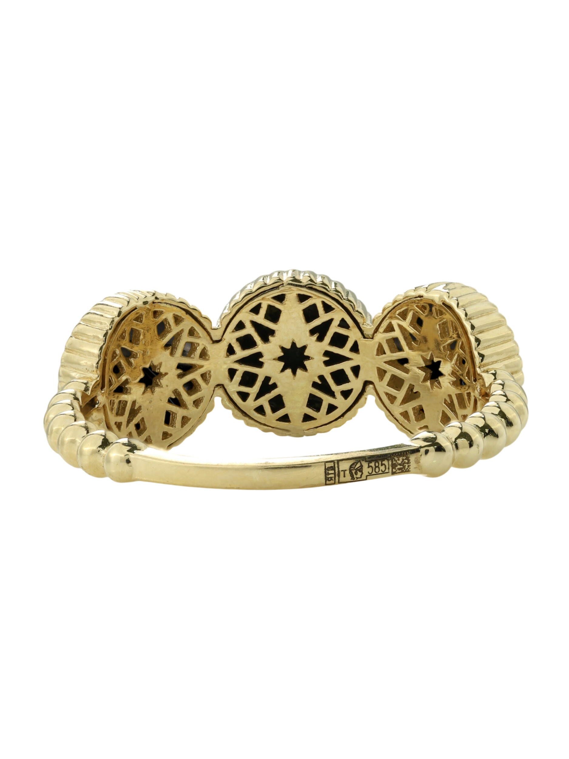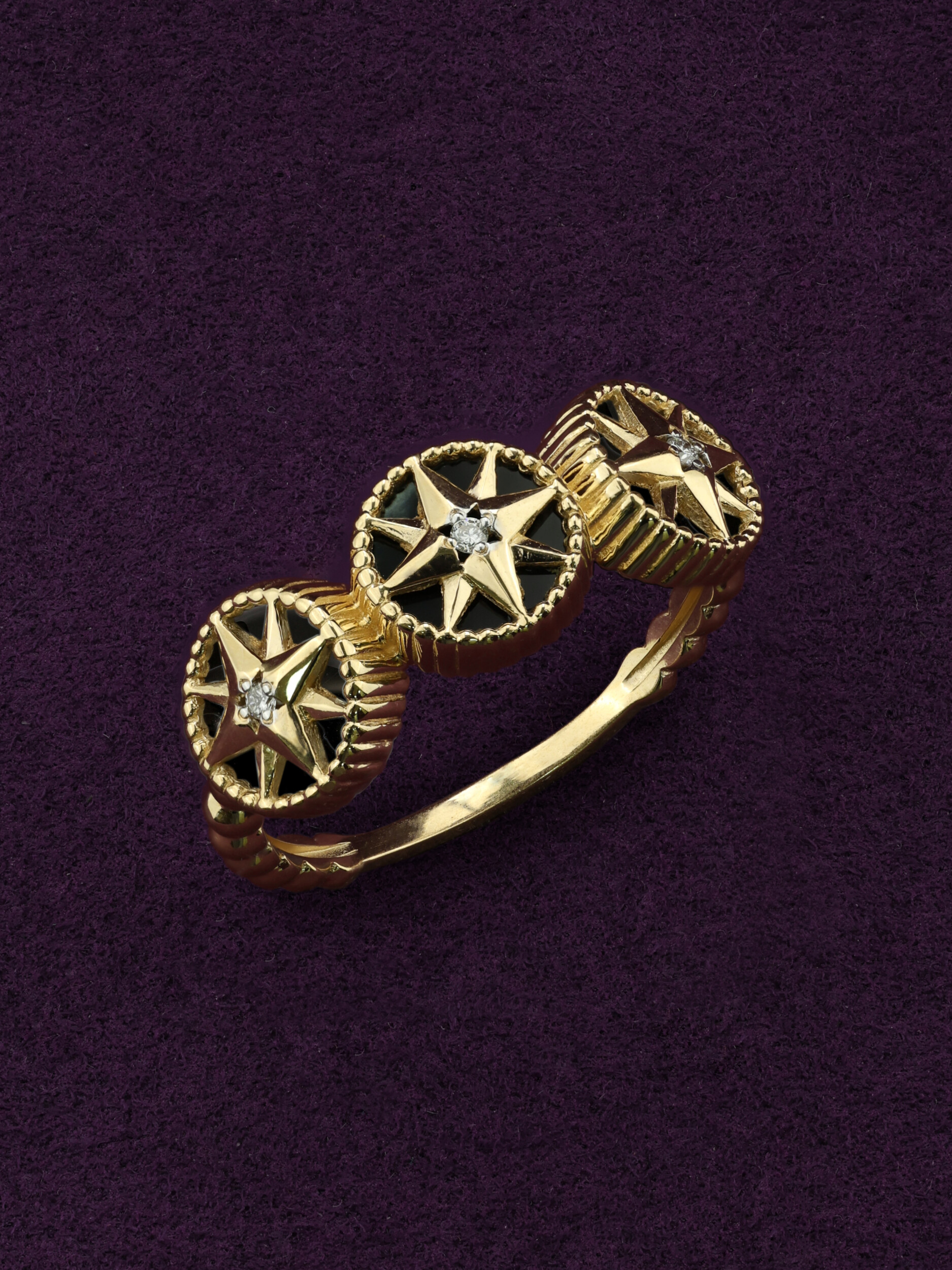 Элегантное кольцо из лимонного золота 585 пробы станет символом вашего безупречного стиля. Ювелирное изделие из серии De Luxe — Звёзды — Бриллианты привлекает внимание своим утонченным дизайном в форме звезд, который придает украшению магическое очарование и глубину. Центральным акцентом композиции выступает гармоничное сочетание теплых оттенков благородного металла и контрастных вставок.