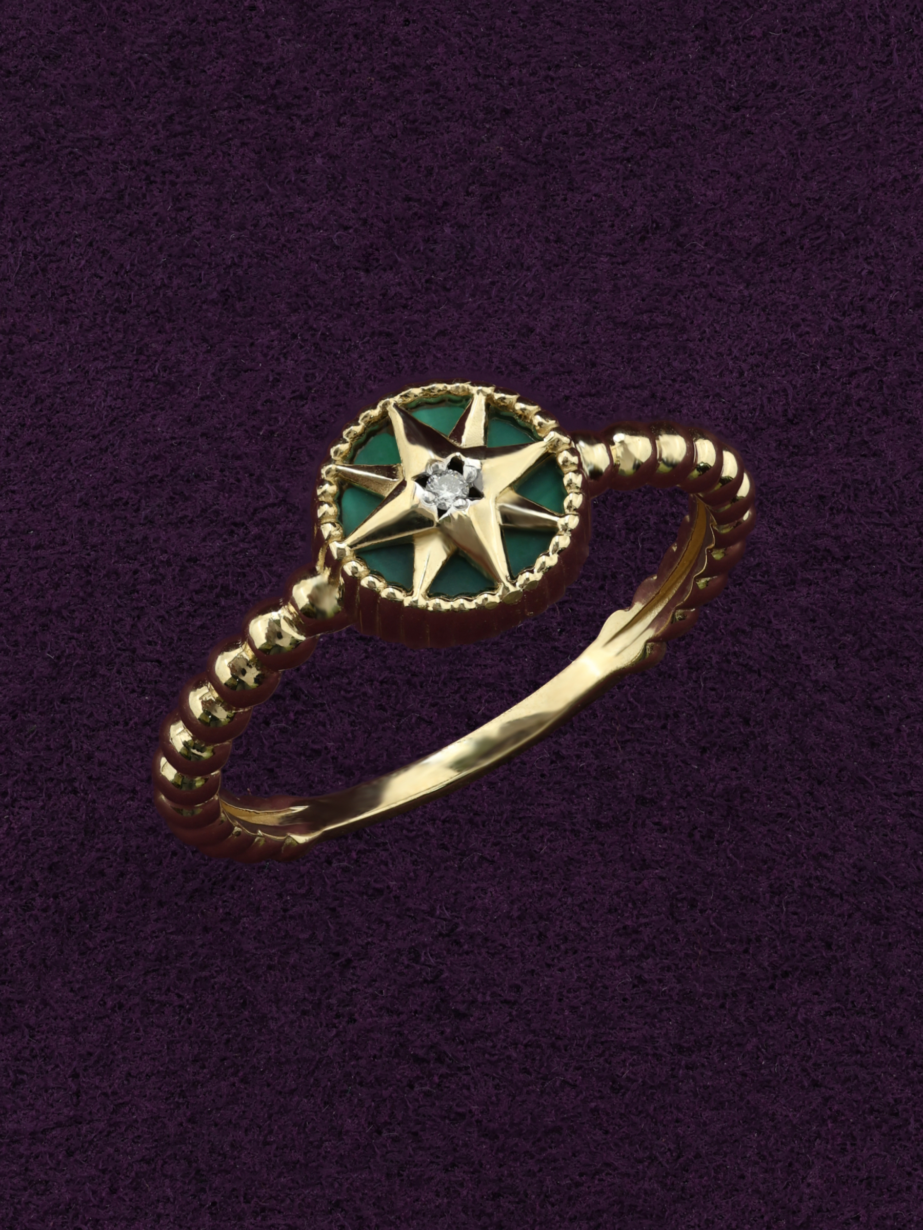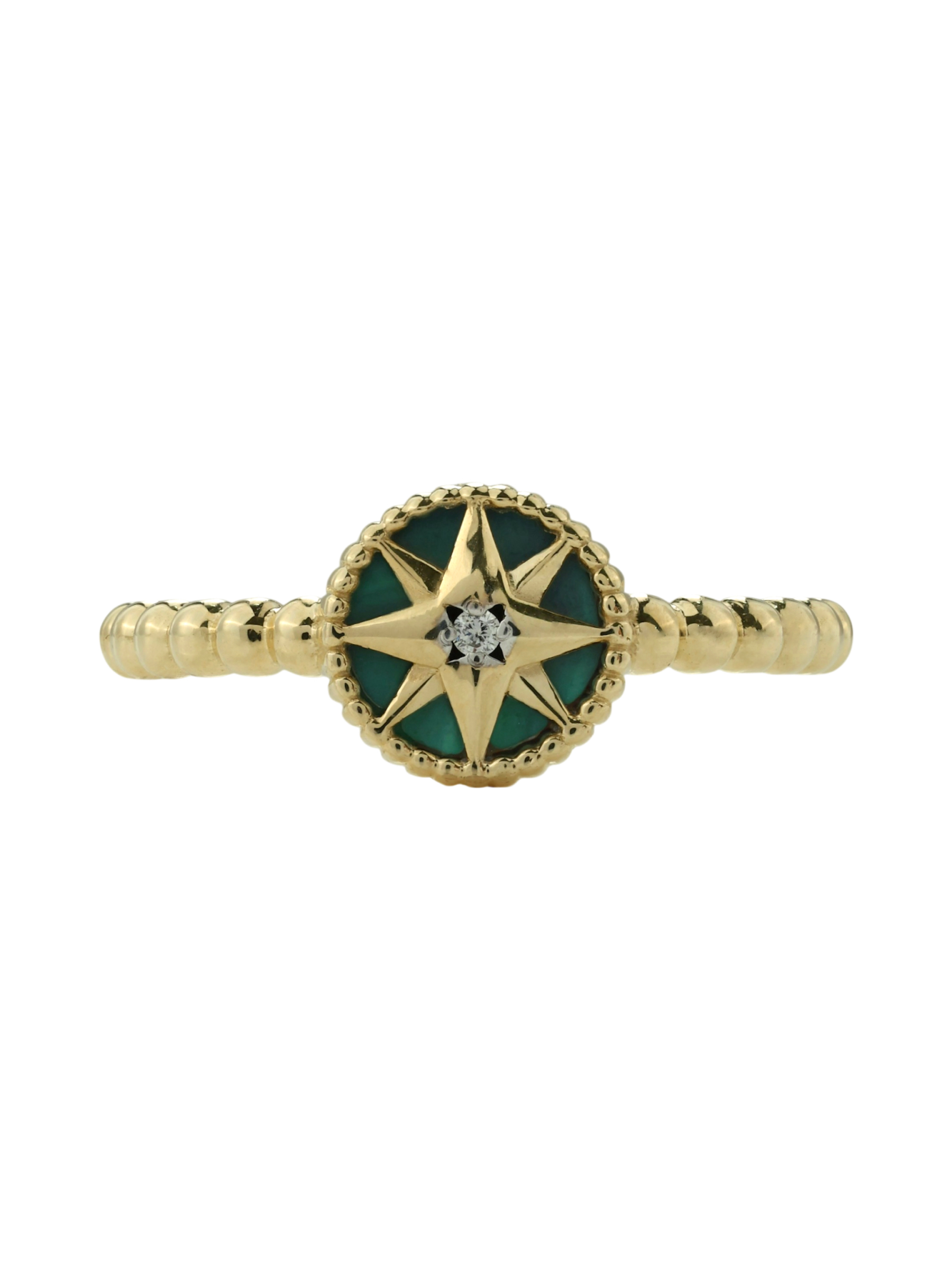 Это кольцо из коллекции De Luxe — Звёзды — Бриллианты отличается изысканным исполнением. Гладкая, фактурная шинка и декоративная оправа вокруг вставки делают изделие узнаваемым. Две вставки — бриллиант и малахит — подобраны с особым вниманием к качеству. Украшение универсально и подходит как для женщин, так и для мужчин, предпочитающих лаконичные ювелирные изделия с характером.