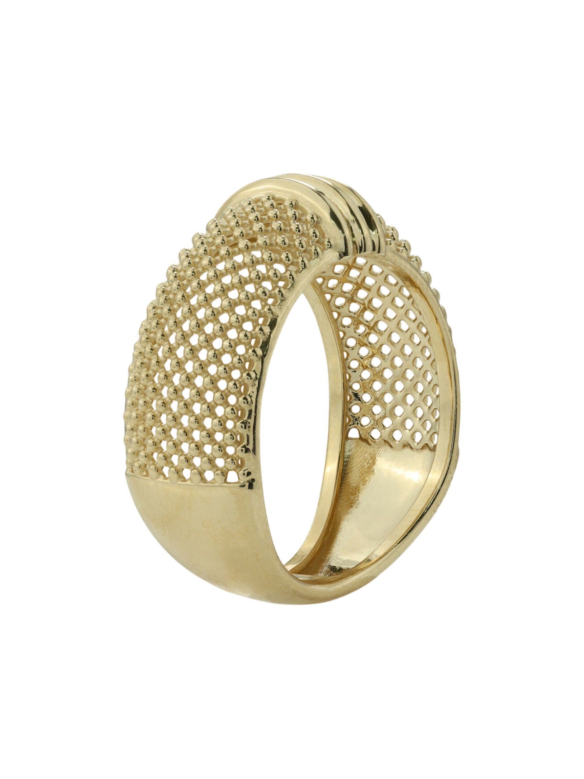 Кольцо из лимонного золота 585 пробы из коллекции Vioretty — Firenze — воплощение утонченного итальянского стиля. Это украшение притягивает взгляд своей фактурой: широкая шинка декорирована изысканным сетчатым узором, который эффектно контрастирует с гладкими полированными вставками. Лимонный оттенок золота придает изделию особое благородство и яркость, подчеркивая статус и безупречный вкус владельца.