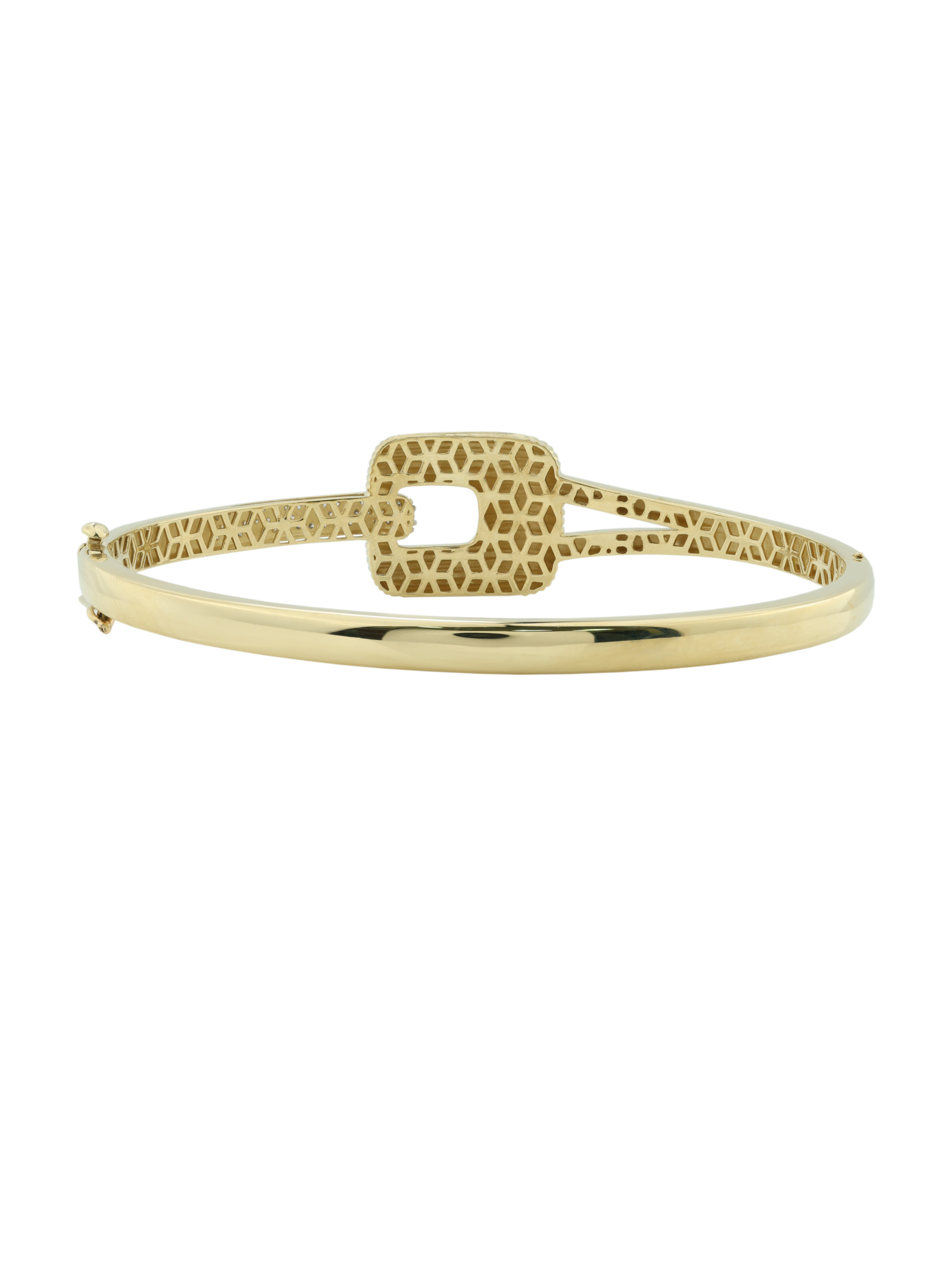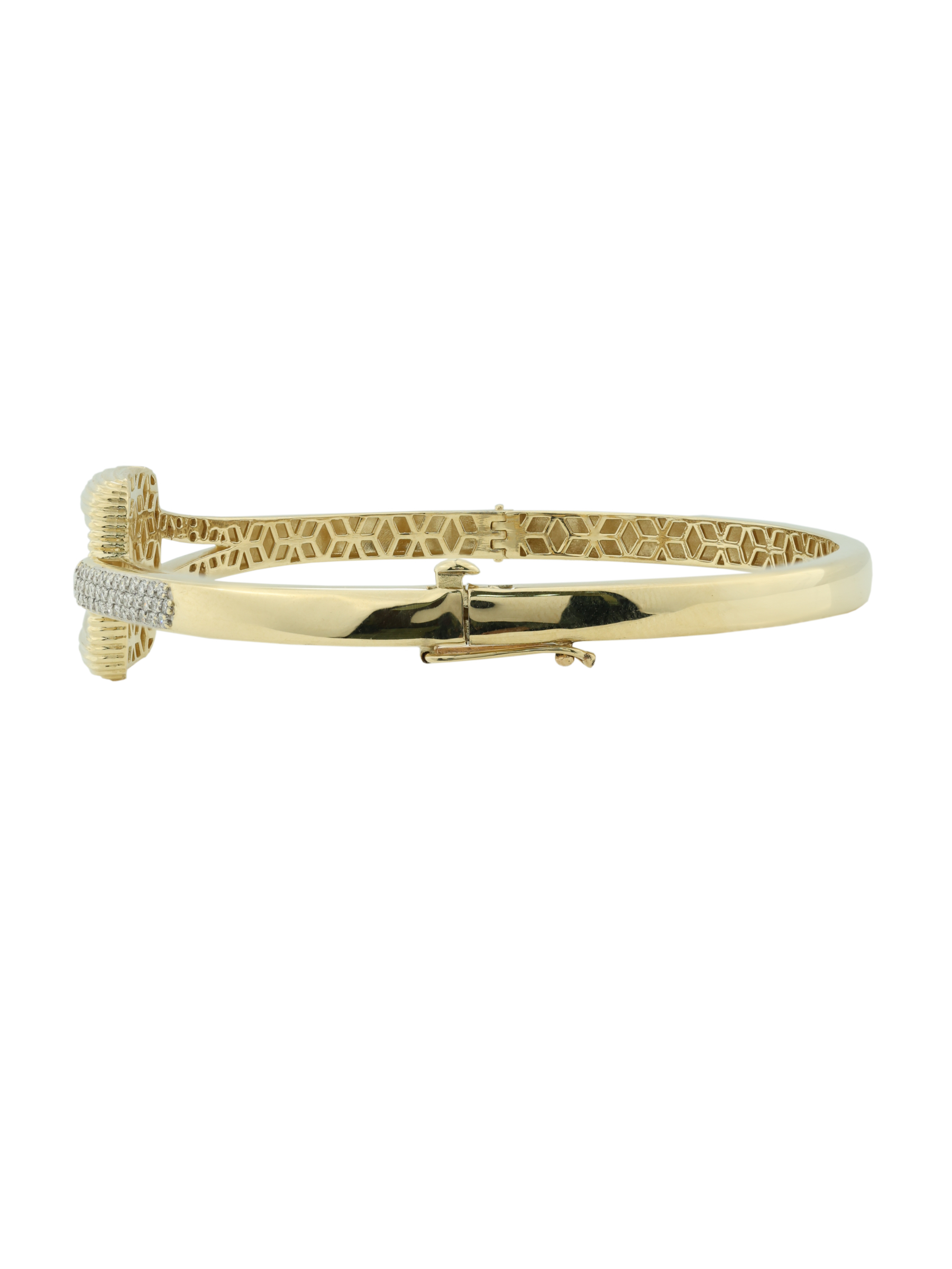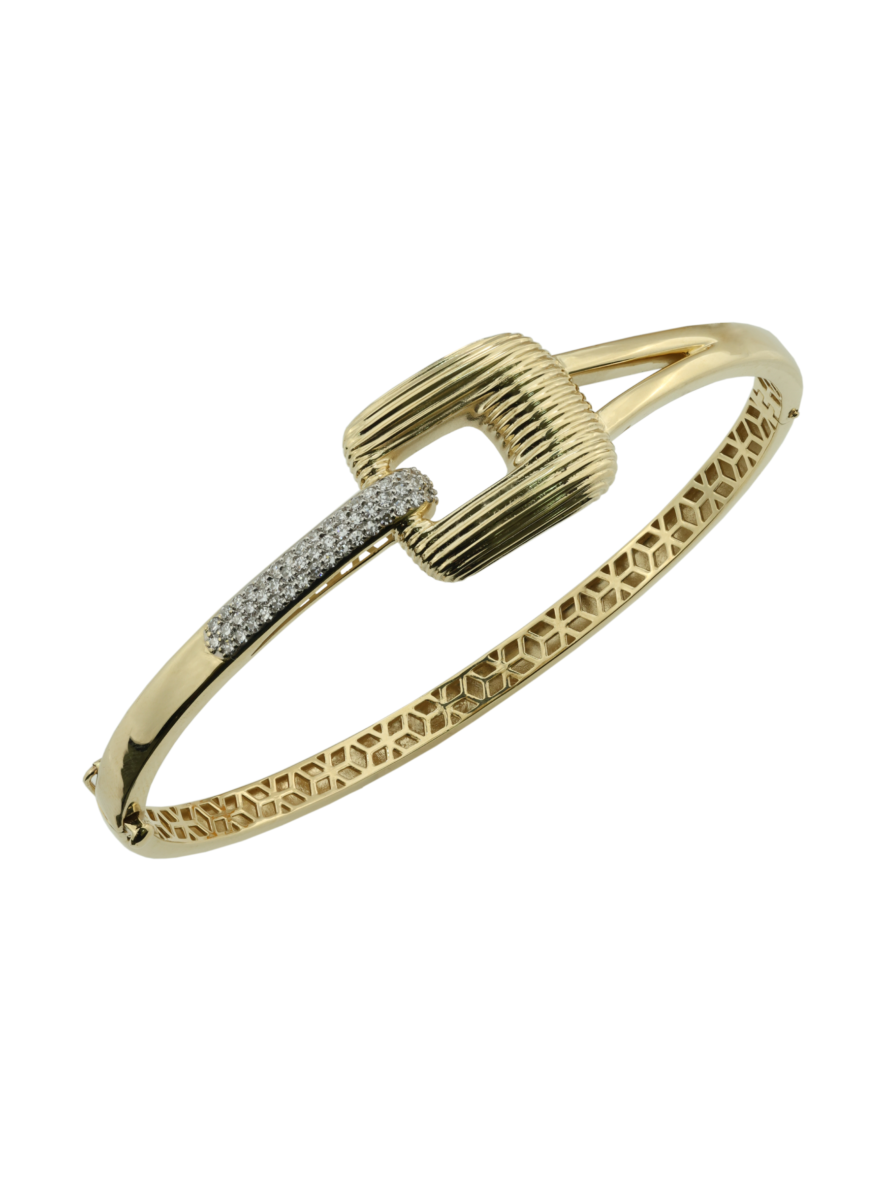 Центральным элементом композиции выступает акцентная вставка, украшенная россыпью драгоценных камней. Браслет инкрустирован 51 бриллиантом круглой огранки, которые обладают благородным белым цветом и завораживающим блеском при каждом движении. Изящное сочетание лимонного золота и сияющих вставок создает гармоничный и завершенный образ.