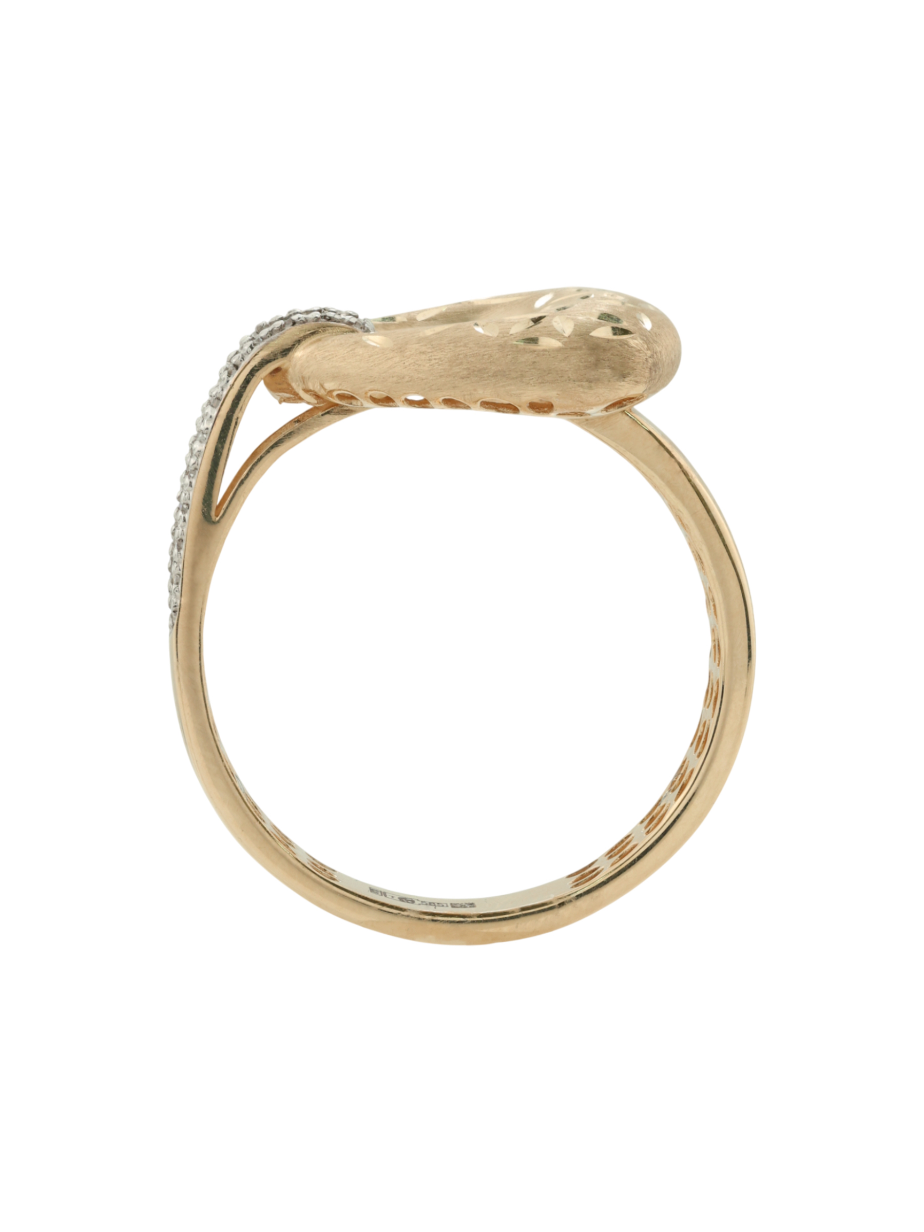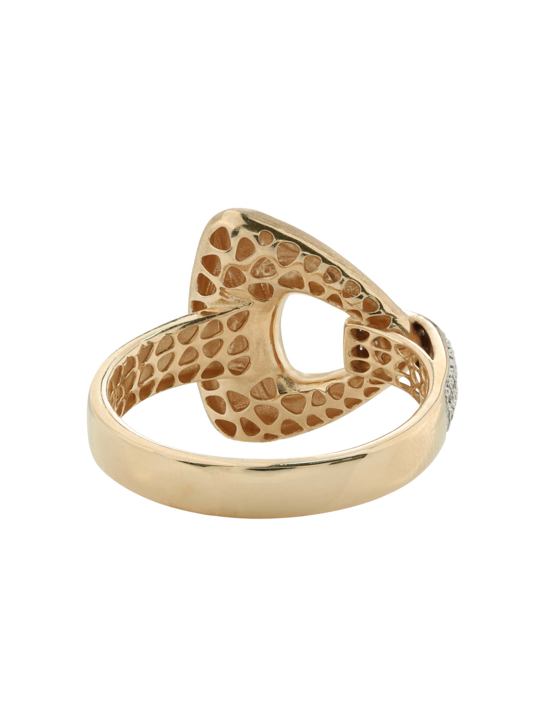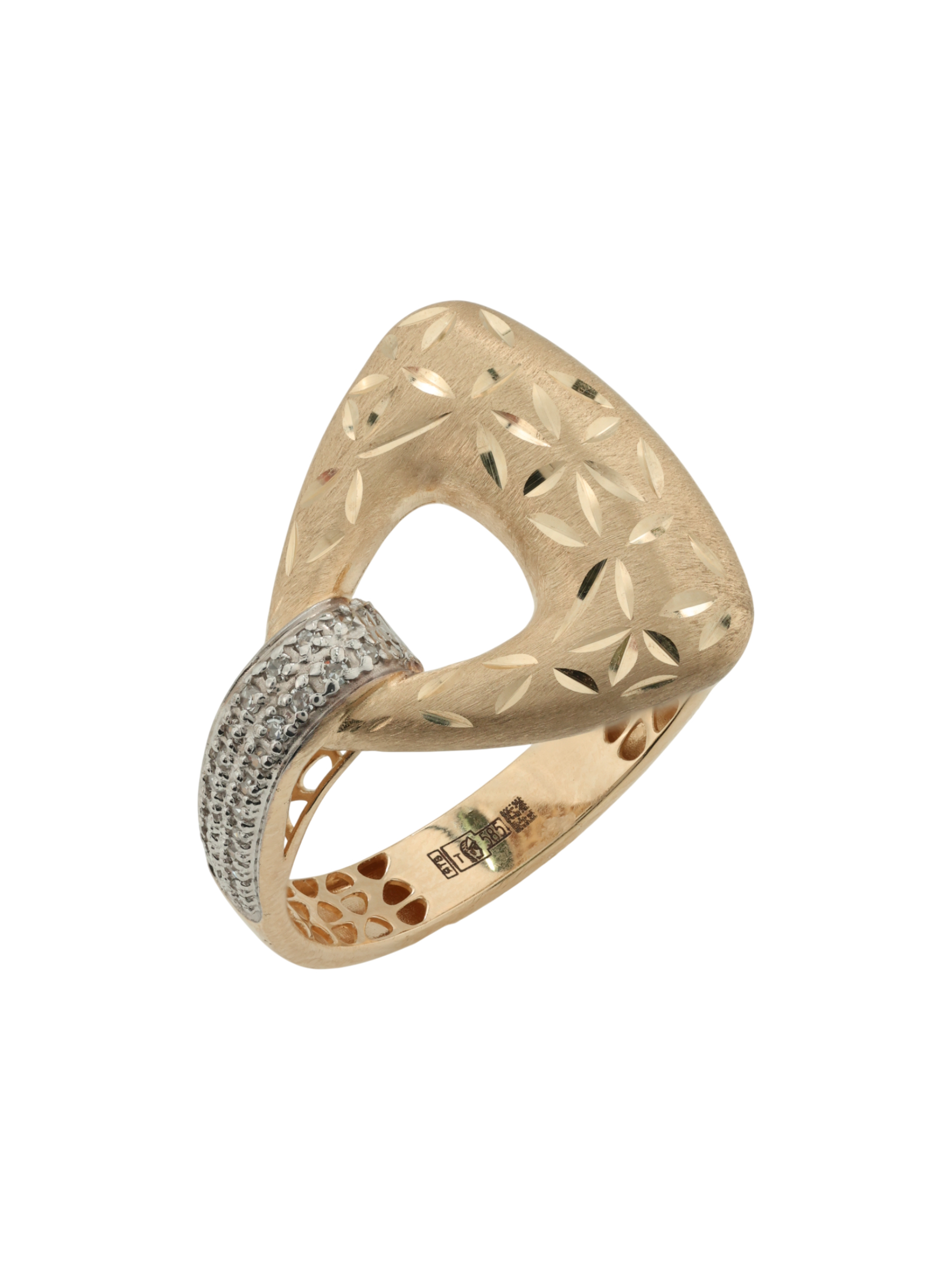 Центральным элементом дизайна является массивная декоративная часть треугольной формы с изящным узором, напоминающим цветочные лепестки. Эффект матовой поверхности контрастирует с блеском металла, создавая уникальную игру света. Широкая шинка кольца инкрустирована 26 круглыми бриллиантами с белыми вставками, которые добавляют изделию сияния и благородства. Это украшение универсально — оно подходит как для женщин, так и для мужчин, подчеркивая индивидуальность владельца.