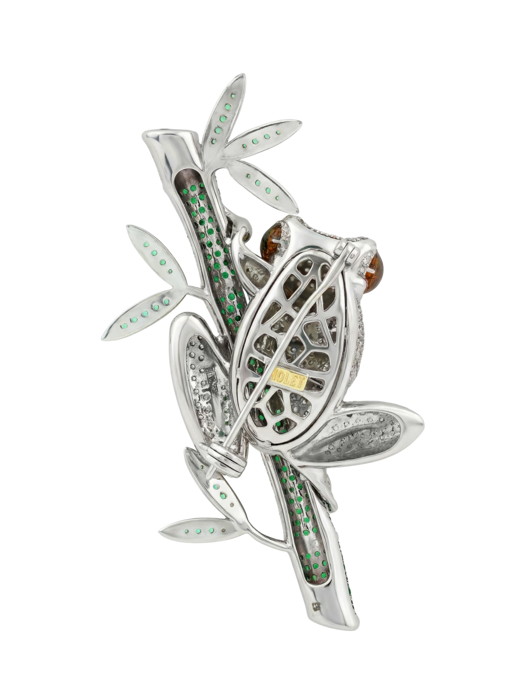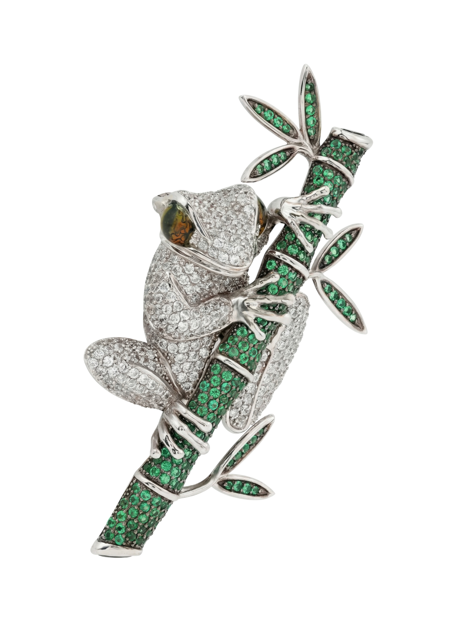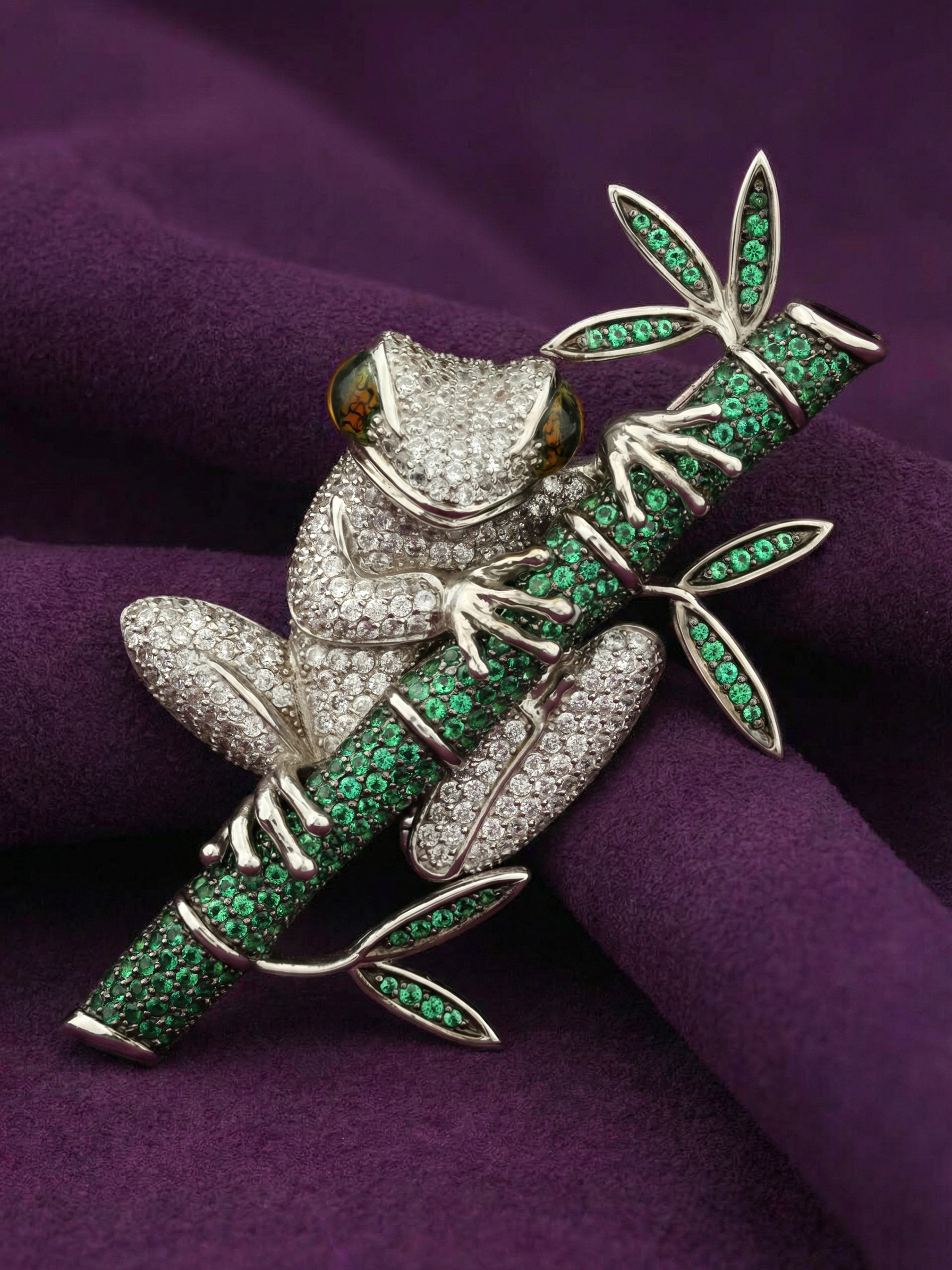 Эксклюзивная брошь из белого золота 585 пробы из коллекции De Luxe — Лягушки станет ярким акцентом в вашем гардеробе. Это ювелирное изделие воплощает мастерство работы с деталями: композиция в виде лягушки на бамбуке выполнена с потрясающей точностью, превращая украшение в настоящий предмет искусства. Художественное исполнение подчеркивается сочетанием фактур и драгоценных материалов, создавая глубокий визуальный эффект.