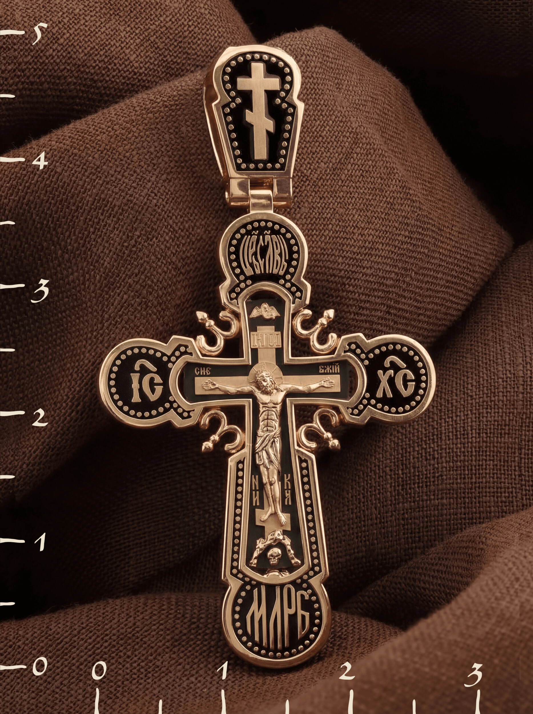 На лицевой стороне креста изображено Распятие Господа и Спасителя нашего Иисуса Христа. Крест- символ спасения и искупления рода человеческого, знамение победы над смертью и адом. Иисус Христос, как искупительная жертва освобождения человечества от власти греха, умер крестной смертью и в третий день воскрес. Над вершиной Распятия помещена надпись «Царь Славы» и изображение Духа Святого в виде голубя, сходящего с небес. На верхней табличке, выше головы Иисуса, расположена надпись, составленная Понтием Пилатом — «IНЦI». Она означает «Иисус Назорей, Царь Иудейский». Надпись «IС» « ХС» означает Иисус Христос и помещается на разных сторонах поперечной перекладины креста. Ниже — слово «НИКА», что означает «победитель». Надпись «МЛРБ» — «место лобное рай бысть» означает, что место лобное стало раем, помещается в нижней части креста. Крест стоит на горе камней, символизирующих Голгофу. В ее основании различается череп — это голова Адама. На православном кресте Христос не умирает, а свободно простирает руки, ладони Иисуса открыты, будто он хочет обнять все человечество, даря им свою любовь и открывая путь к вечной жизни. На кулонном кольце помещен крест.