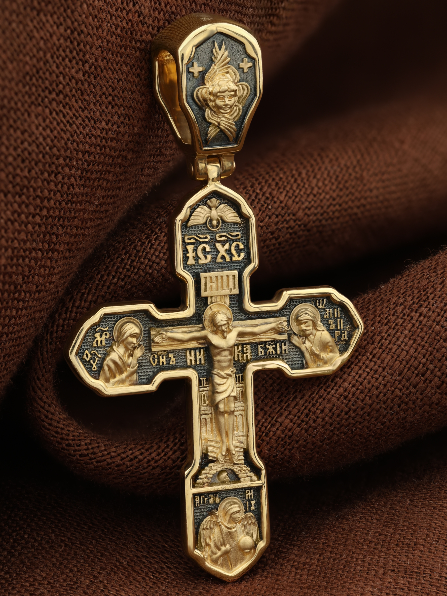 На лицевой стороне изображено Распятие Господа Иисуса Христа, над вершиной которого помещены титлы Его святого имени — «ИС ХС». Под основной перекладиной надписи — «НИКА», что в переводе с греческого означает «победитель», и словосочетание «СЫН БОЖИЙ», что означает божественную природу Иисуса Христа. С двух сторон Христу предстоят Пресвятая Богородица и св. Андрей Первозванный. Внизу — образ Архангела Михаила, могучего защитника от злых сил. Это он низверг дьявола и встал во главе ангелов для борьбы с бесовскими силами. Его имя означает «Кто яко Бог?».