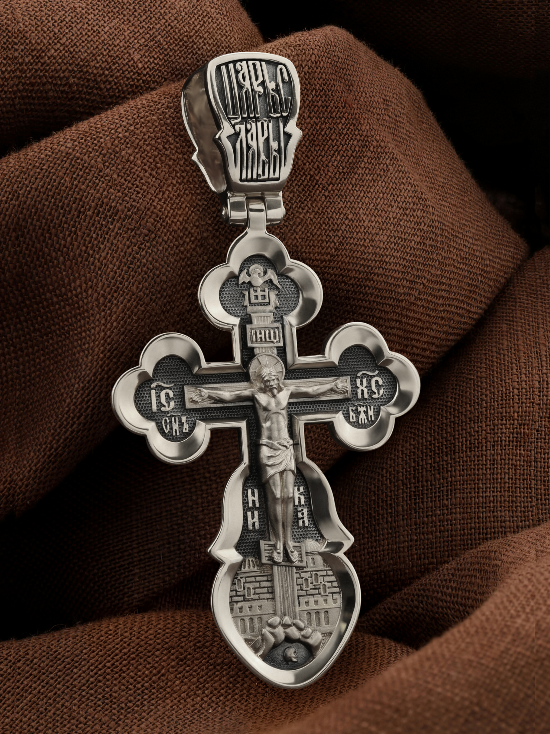 Распятие сопровождается иконографическими надписями, прославляющими Господа Иисуса Христа. На боковых оконечностях размещены инициалы святого имени Спасителя «IС ХС» и надпись «Сын Божий», обозначающая Его божественную природу. На подножии Креста можно прочитать надпись «НИКА» (Победитель) — символ победы Господа над смертью. Венчает лицевую сторону образ Святого Духа в виде голубя.