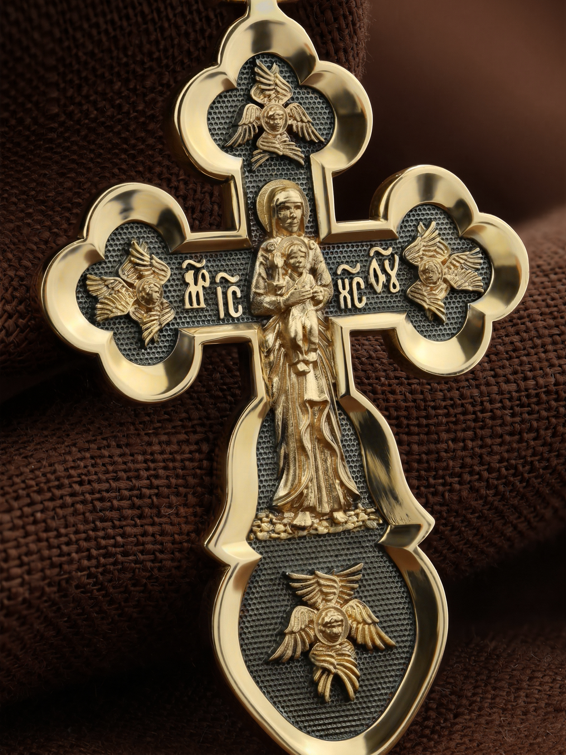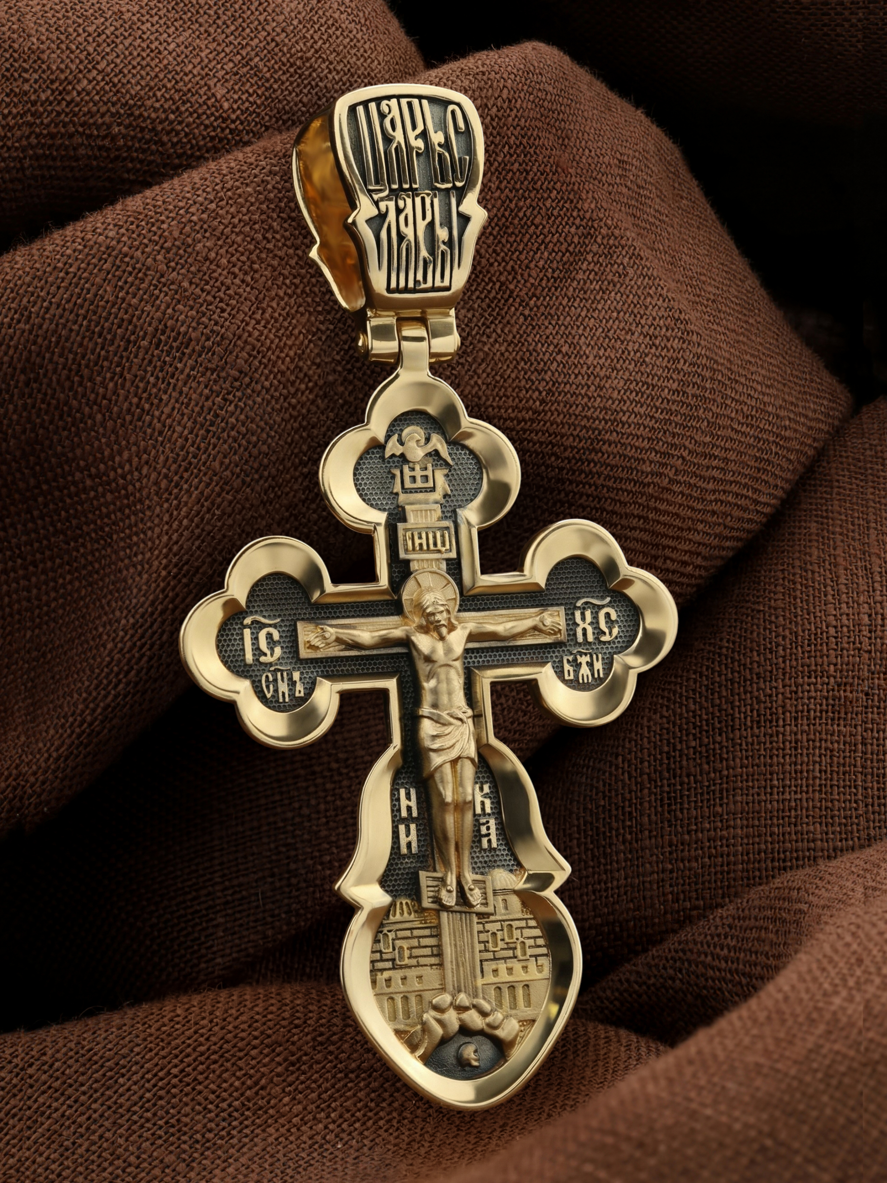 Распятие сопровождается иконографическими надписями, прославляющими Господа Иисуса Христа. На боковых оконечностях размещены инициалы святого имени Спасителя «IС ХС» и надпись «Сын Божий», обозначающая Его божественную природу. На подножии Креста можно прочитать надпись «НИКА» (Победитель) — символ победы Господа над смертью. Венчает лицевую сторону образ Святого Духа в виде голубя.
