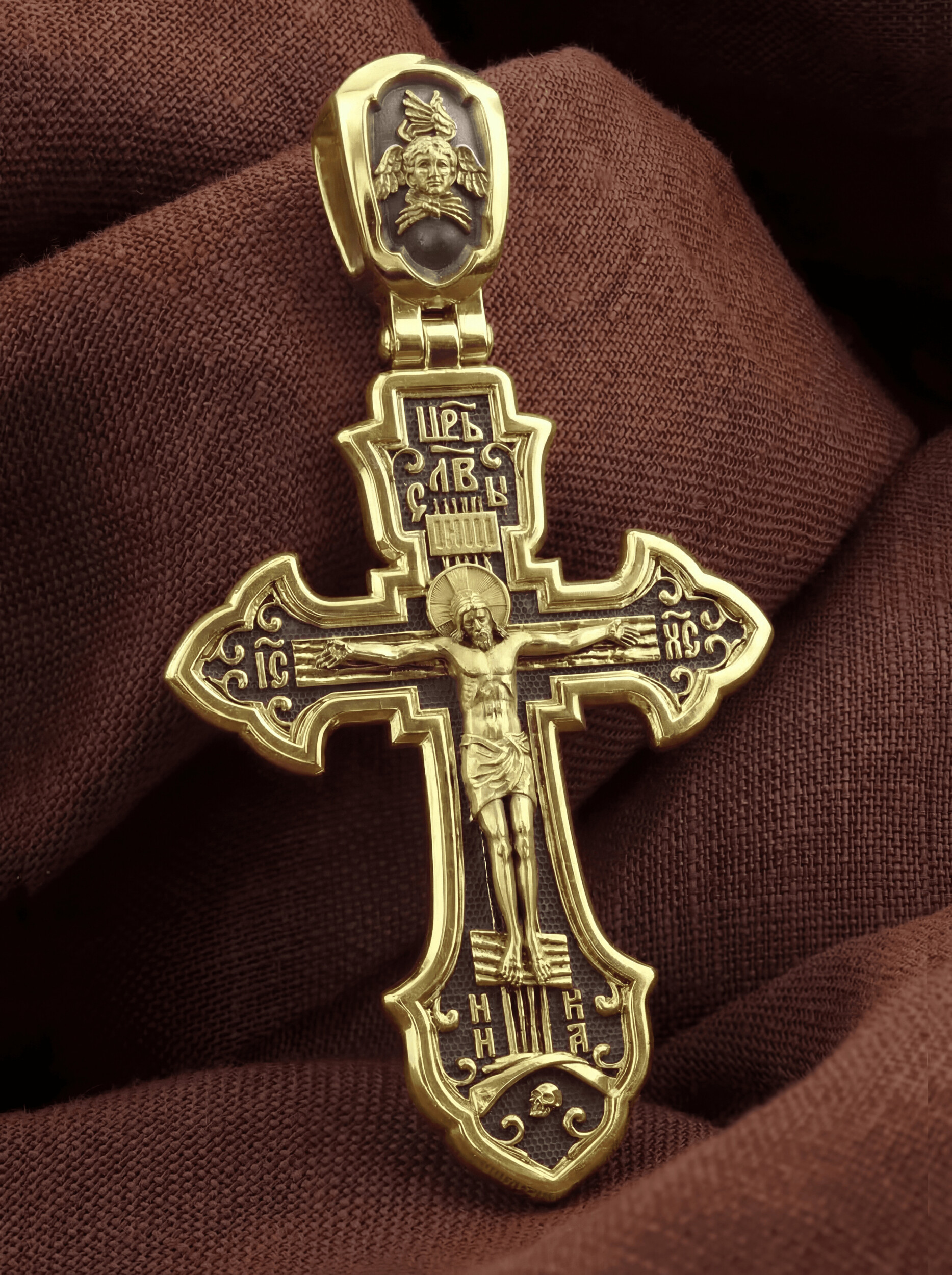 На лицевой стороне этого креста центральную часть занимает икона Распятия Христа — образ жертвы, принесенной Господом за грехи людей. Именно ко Христу, сошедшему на землю ради нашего спасения, возносятся все молитвы. Рядом с Его образом помещены слова — «НИКА» и «Царь Славы». Эти слова характеризуют Господа как Великого Архиерея, победителя смерти. Также Распятие сопровождается надписями, олицетворяющими Христа — это святое имя Христа «IC» (Иисус) «ХС» (Христос). Венчает лицевую сторону креста надпись «Царь Славы». На кулонном кольце помещено изображение Спаса Нерукотворного.
