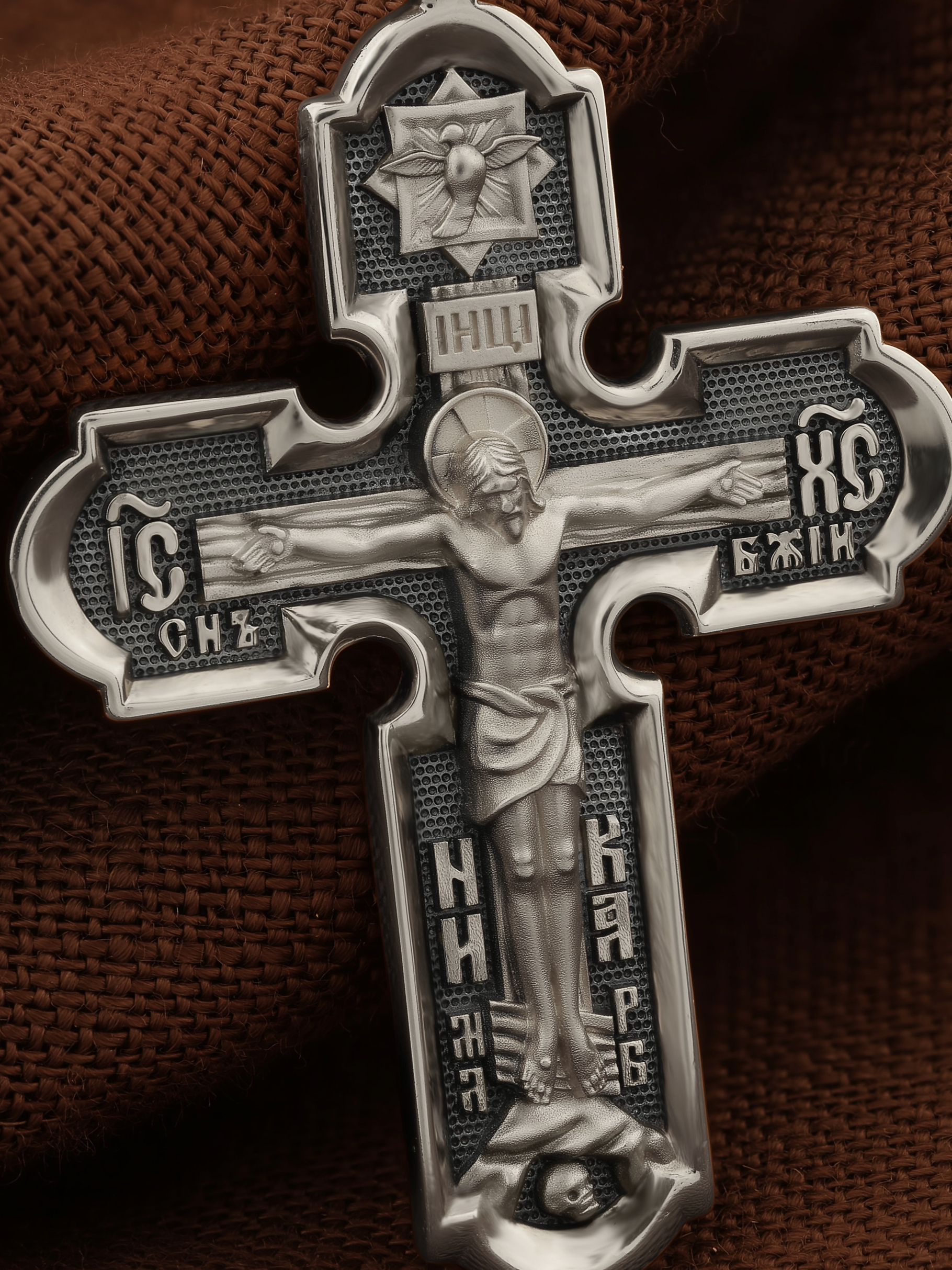 На лицевой стороне креста изображено Распятие Господа и Спасителя нашего Иисуса Христа. Христос, подвергнутый на кресте мучительной казни, своими страданиями искупил нас от древнего греха и даровал нам жизнь вечную. На верхней табличке, выше головы Иисуса, расположена надпись, составленная Понтием Пилатом — «IНЦI». Она означает «Иисус Назорей, Царь Иудейский». Надпись «IС» « ХС» означает Иисус Христос и словосочетание «СЫН БОЖИЙ», что означает божественную природу Иисуса Христа. В нижней части креста находятся надписи «НИКА» и «МЛРБ». В переводе с греческого, слово «НИКА» означает «победитель». Надпись «МЛРБ» — «место лобное рай бысть» — означает, что место лобное стало раем. Крест стоит на горе камней, символизирующих Голгофу. Под подножием Креста изображена покоящаяся голова (череп) Адама.