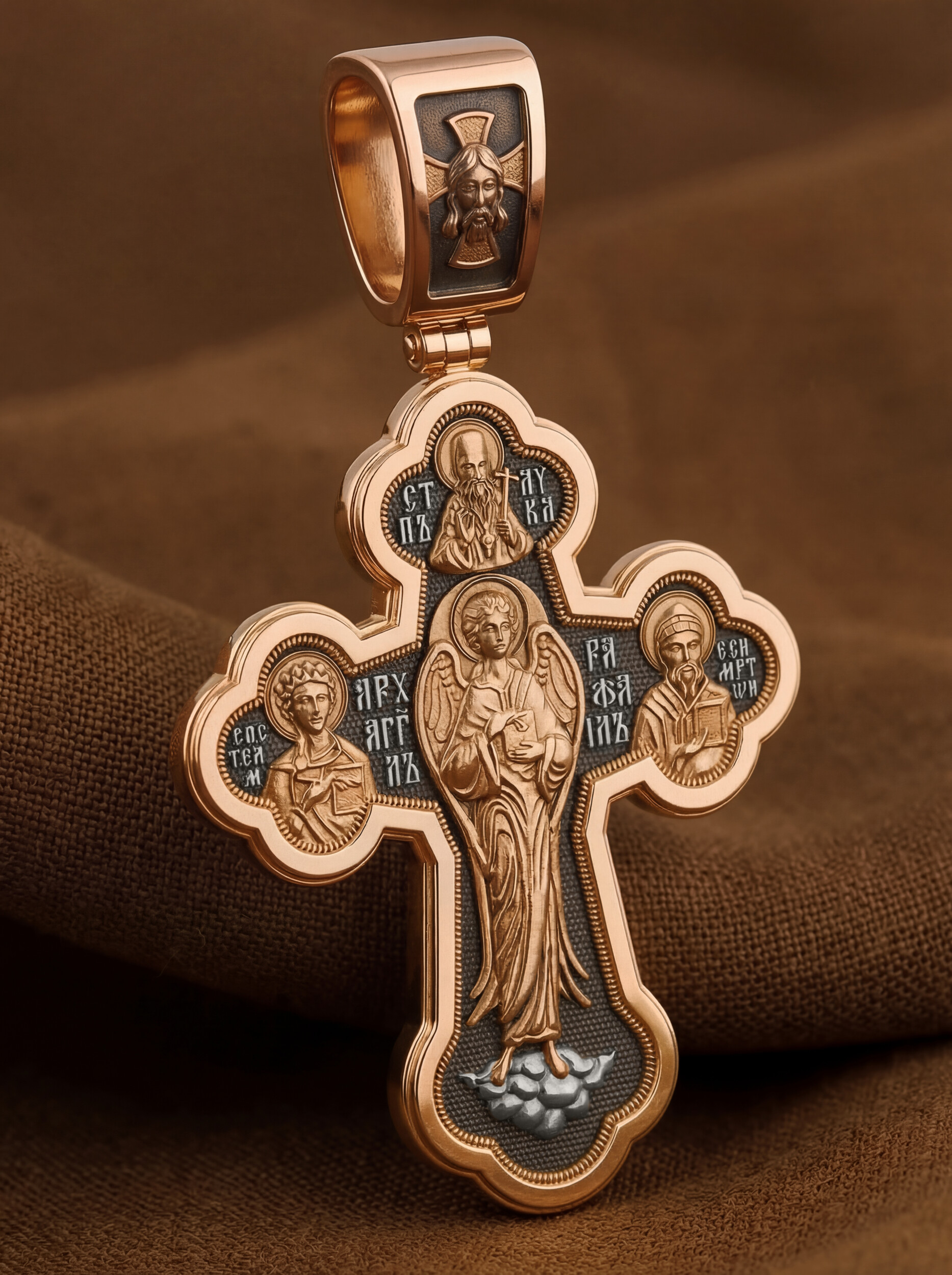 В центре на обороте креста изображен могущественный Архангел Рафаил (Исцеление Божие) — целитель человеческих недугов, путеводитель и врач Божий. Он один из семи высших архангелов, самых близких к Богу. Вокруг Рафаила помещены иконы великих целителей, которых Церковь почитает как чудотворцев. Слева — Великомученик Пантелеимон Целитель — безмездный врач, который за свою глубокую, сострадательную любовь к людям был награжден Богом великой целительной силой. Святой воскрешал людей и исцелял именем Христа любые болезни. Справа — Святитель Спиридон Тримифунтский — один из самых почитаемых святых в Греции. Почитается он и в России как великий целитель всяческих недугов, помощник в бизнесе, покровитель христианских семей. В оглавии оборота креста помещена икона новопрославленного Святого Луки, архиепископа Симферопольского и Крымского.