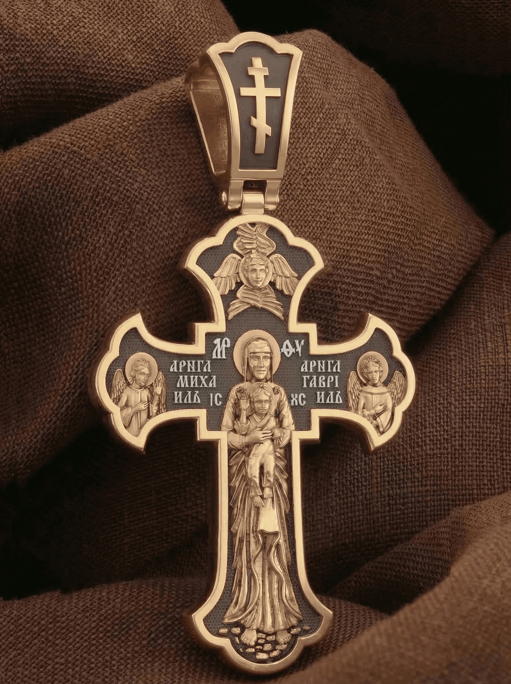 На обратной стороне креста в полный рост изображена Валаамская икона Божией Матери, над которой раскрыл свои крылья серафим. Этот образ написал в 1878 году иеромонах Валаамского монастыря о. Алипий. Валаамскую икону прославили многие чудеса, ее считают целительницей при разных недугах. Перед этим образом Богородицу молят в первую очередь об укреплении веры, просят даровать смирение, твердость в соблюдении заповедей Христовых и об исцелении. Богородице предстоят два архангела, Михаил и Гавриил.