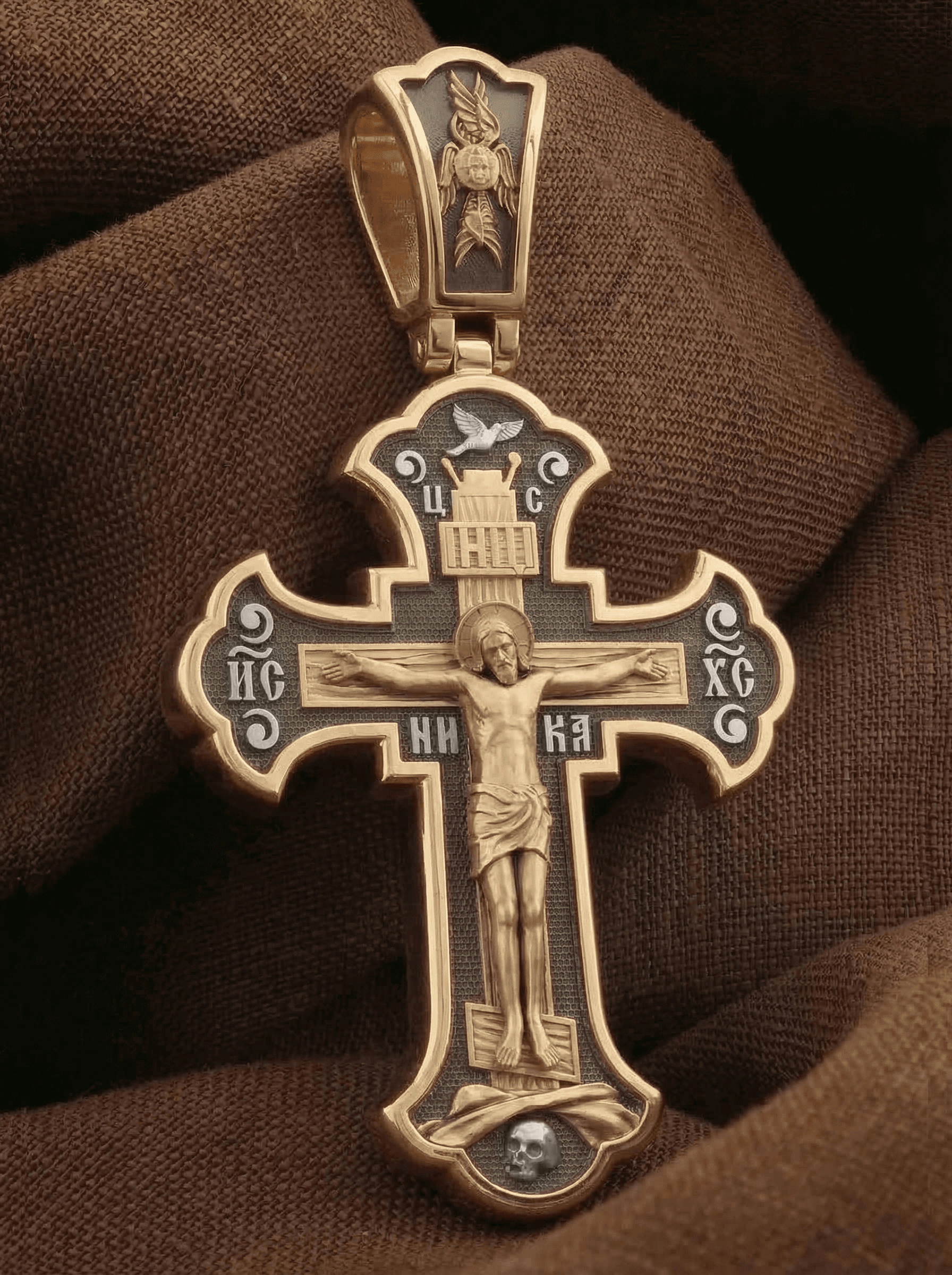 На лицевой стороне этого креста центральную часть занимает икона Распятия Христа — образ жертвы, принесенной Господом за грехи людей. Именно ко Христу, сошедшему на землю ради нашего спасения, возносятся все молитвы. Пресвятая Богородица, ангелы и святые — помощники Господа в деле спасения и заступники за людей перед Богом. «Оружием великим Христовым» именует Церковь крест, потому что, претерпев страдания и умерев, Господь победил смерть и лишил дьявола его власти над миром. Поэтому рядом с титлами Святого имени Христа написано «НИКА», что значит «победитель».