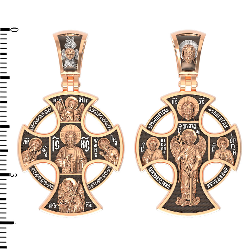 В центре лицевой стороны изображена ипостась Сына Божьего в окружении Пресвятой Богородицы и св. пророка и Предтечи Господня Иоанна Крестителя, которые имеют особое дерзновение перед Богом молиться за всех людей. Над образом Иисуса Христа изображен архангел Михаил, в нижней части креста — архангел Гавриил. В руках у Иисуса Христа находится Новый Завет. В кулонное кольцо помещено изображение Спаса Нерукотворного, образ Спасителя, который Он запечатлел на плате и передал для исцеления больному проказой царю Эдессы.
