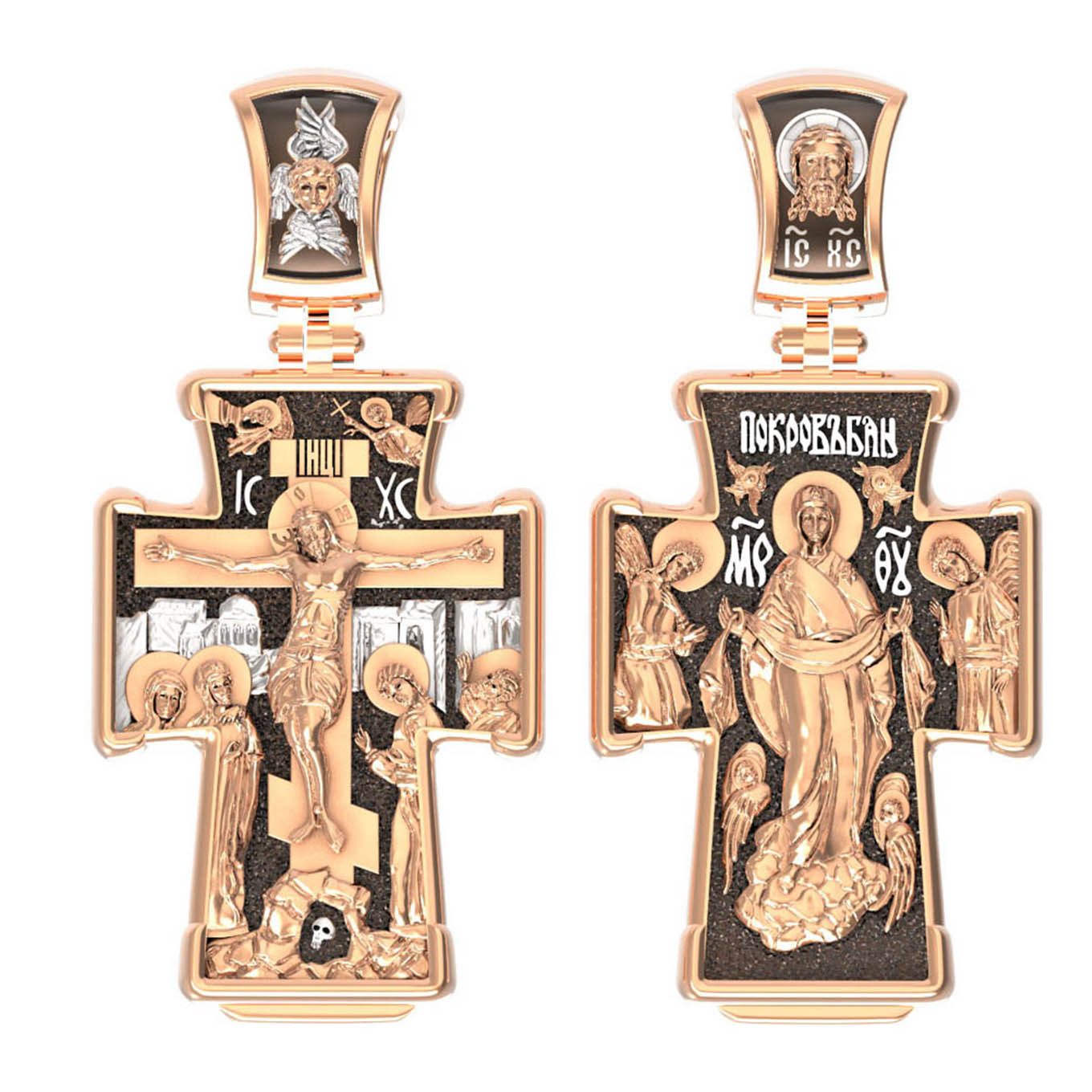 На обороте креста изображена икона Покрова Пресвятой Богородицы. Праздник Покрова Божией Матери является воспоминанием чуда, которое произошло во Влахнернской церкви 1 (14) октября 910 года: Пресвятая Богородица явилась верующим над алтарем храма и распростерла над ними Свое покрывало. В этот день Божия Матерь открыла людям, что Она является Ходатаицей за них перед Богом. Богородица простирает Свой молитвенный покров над всеми православными христианами и умоляет Сына Своего о даровании вечного спасения каждому человеку.