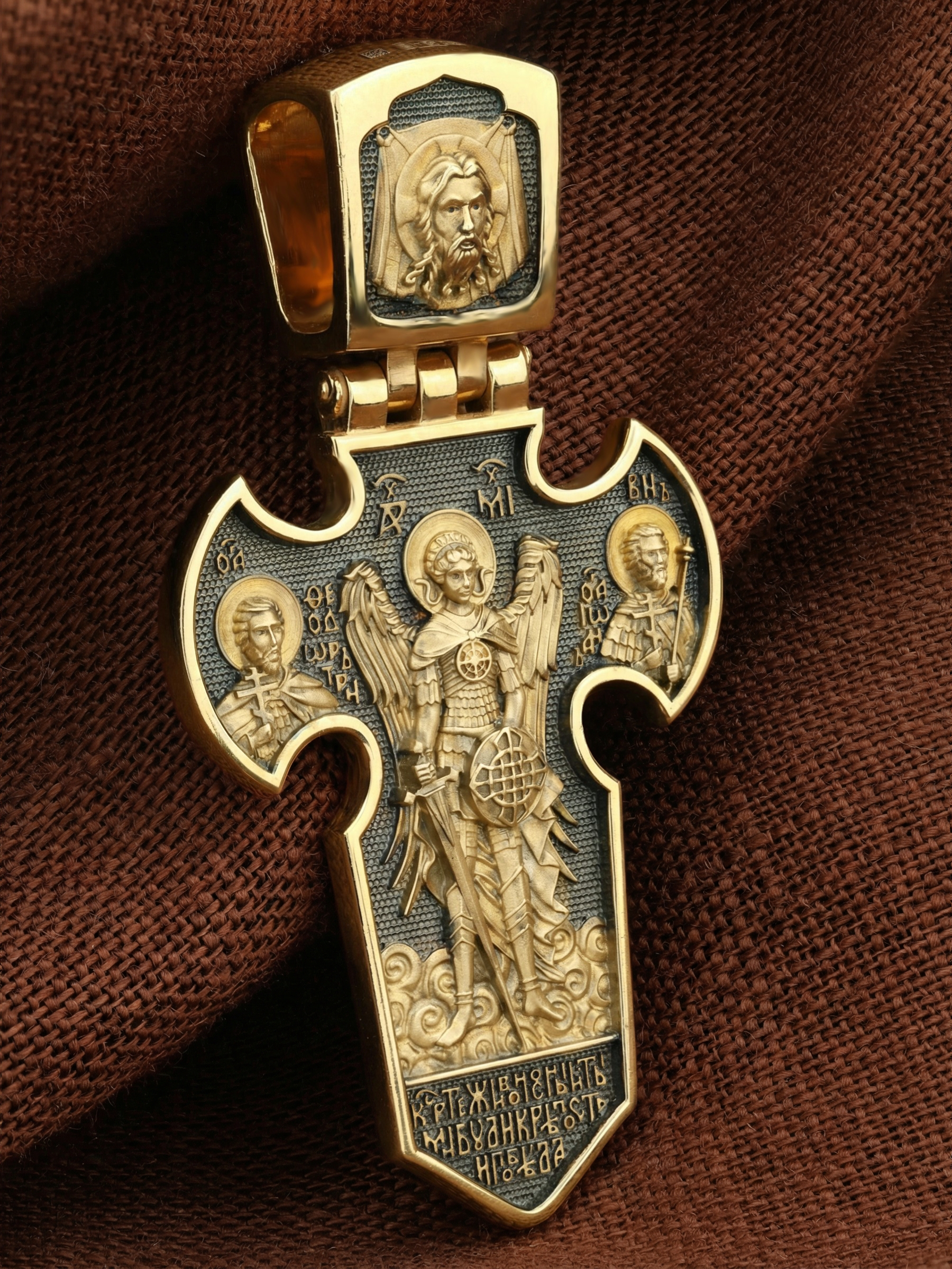 Оборот креста открывается величественной фигурой Архангела Михаила, архистратига Небесного воинства. Его имя означает «Кто яко Бог?», так как он самый могучий и грозный враг зла. С двух сторон от Архистратига Михаила предстоят еще два воина дружины Христовой: великомученик Феодор Тирон и мученик Иоанн Воин. В основании креста молитвенное обращение из Канона, написанного в XIV веке святым монахом Григорием Синаитом: «Кресте Живоносный, ты ми буди крепость и победа». Это молитва воина, восставшего против зла с любовью к ближнему, верой в Бога и надеждой на неизменную помощь Его Небесного Воинства.