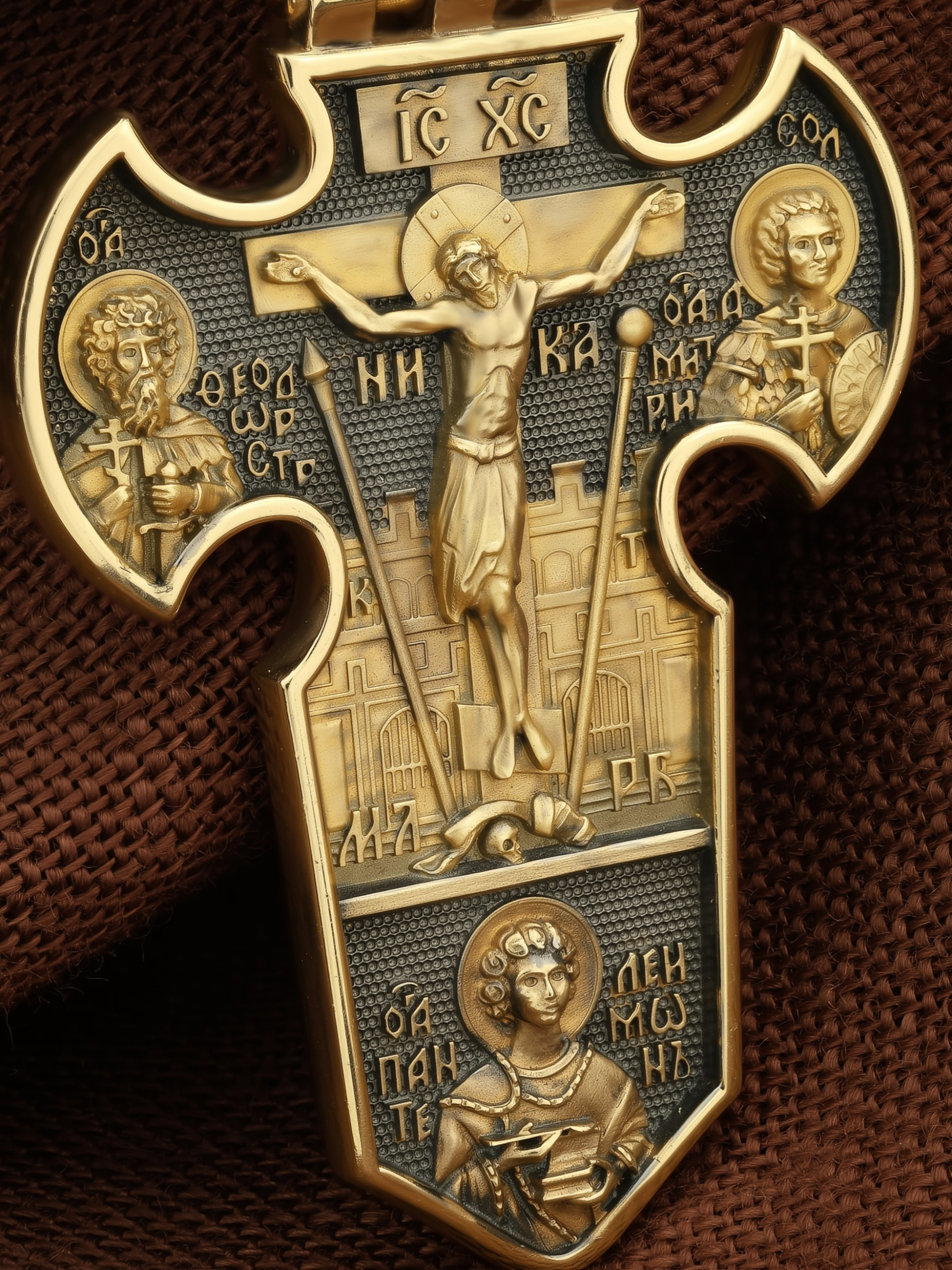 С двух сторон от Распятия расположены образы воинов-великомучеников Феодора Стратилата и Димитрия Солунского. В нижней части Воинского креста помещено изображение вмч. и целителя Пантелеимона, святого врача-бессребреника, который почитался не только как врачеватель ран, но и как помощник на поле брани.
