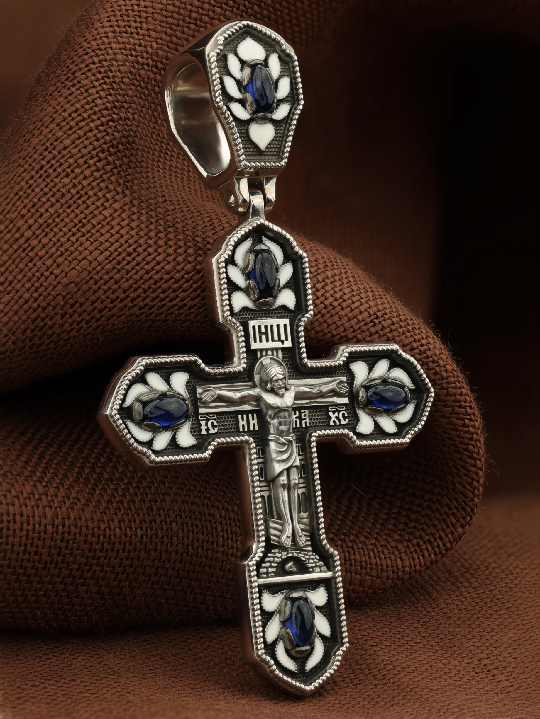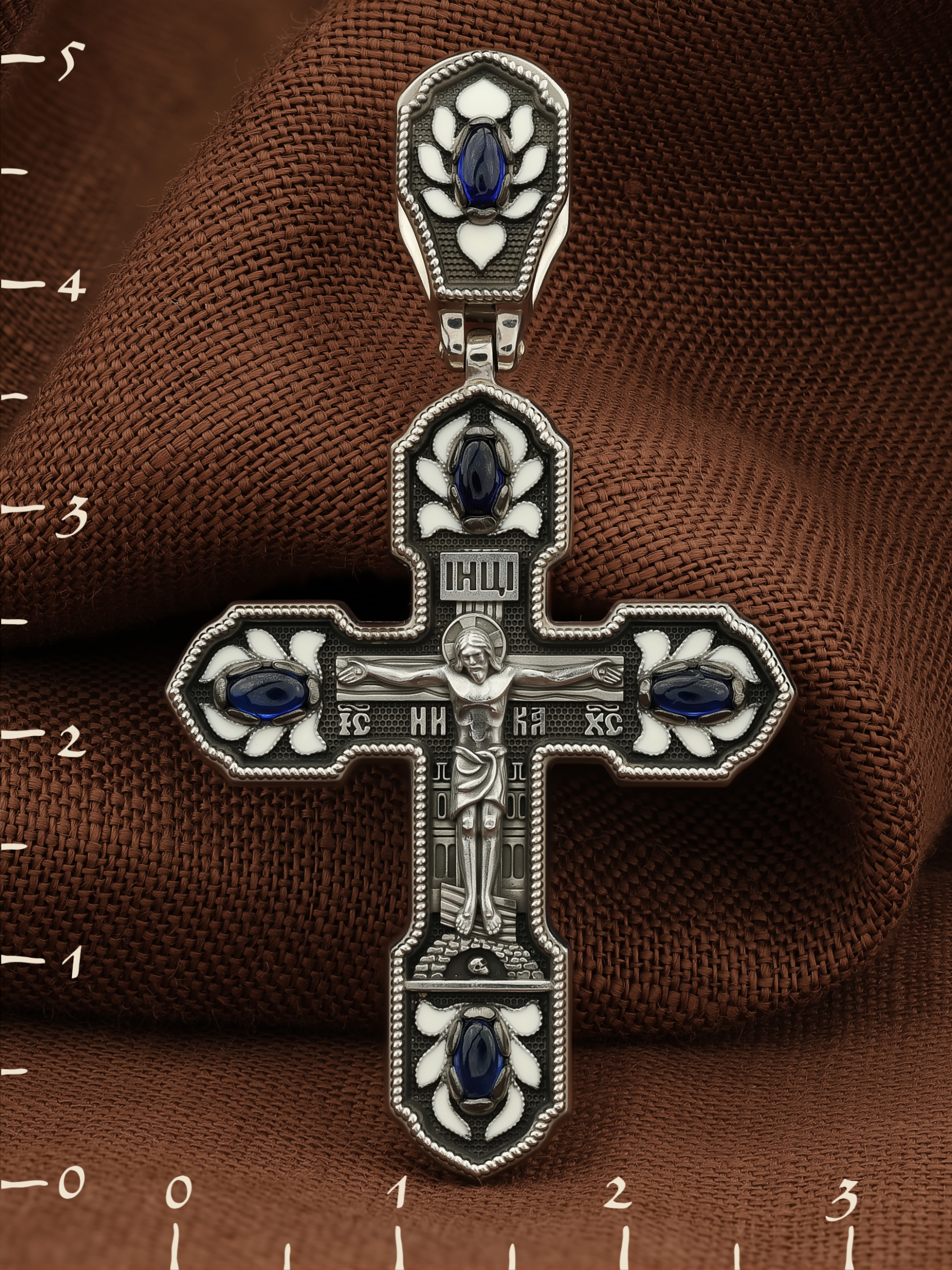 Крест из белого золота c эмалью и сапфиром