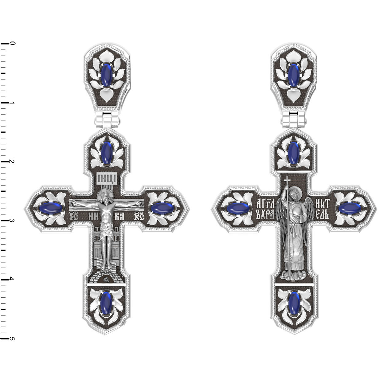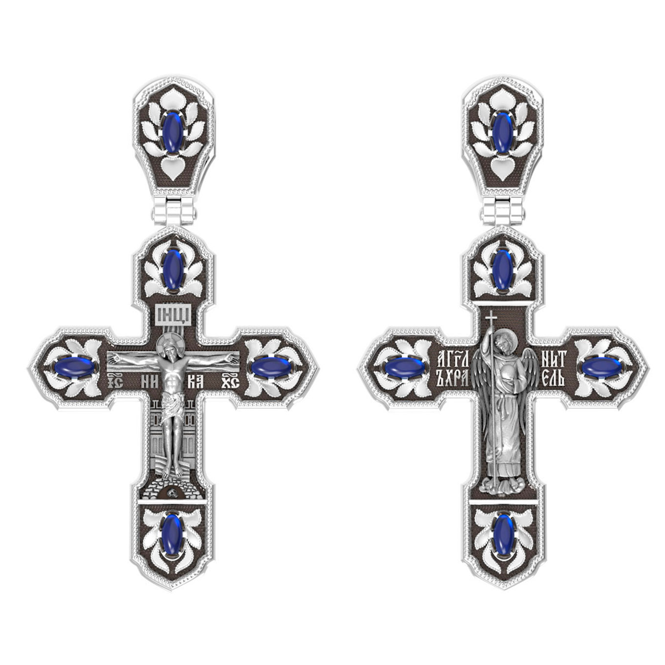Крест из белого золота 585 пробы c эмалью и сапфиром