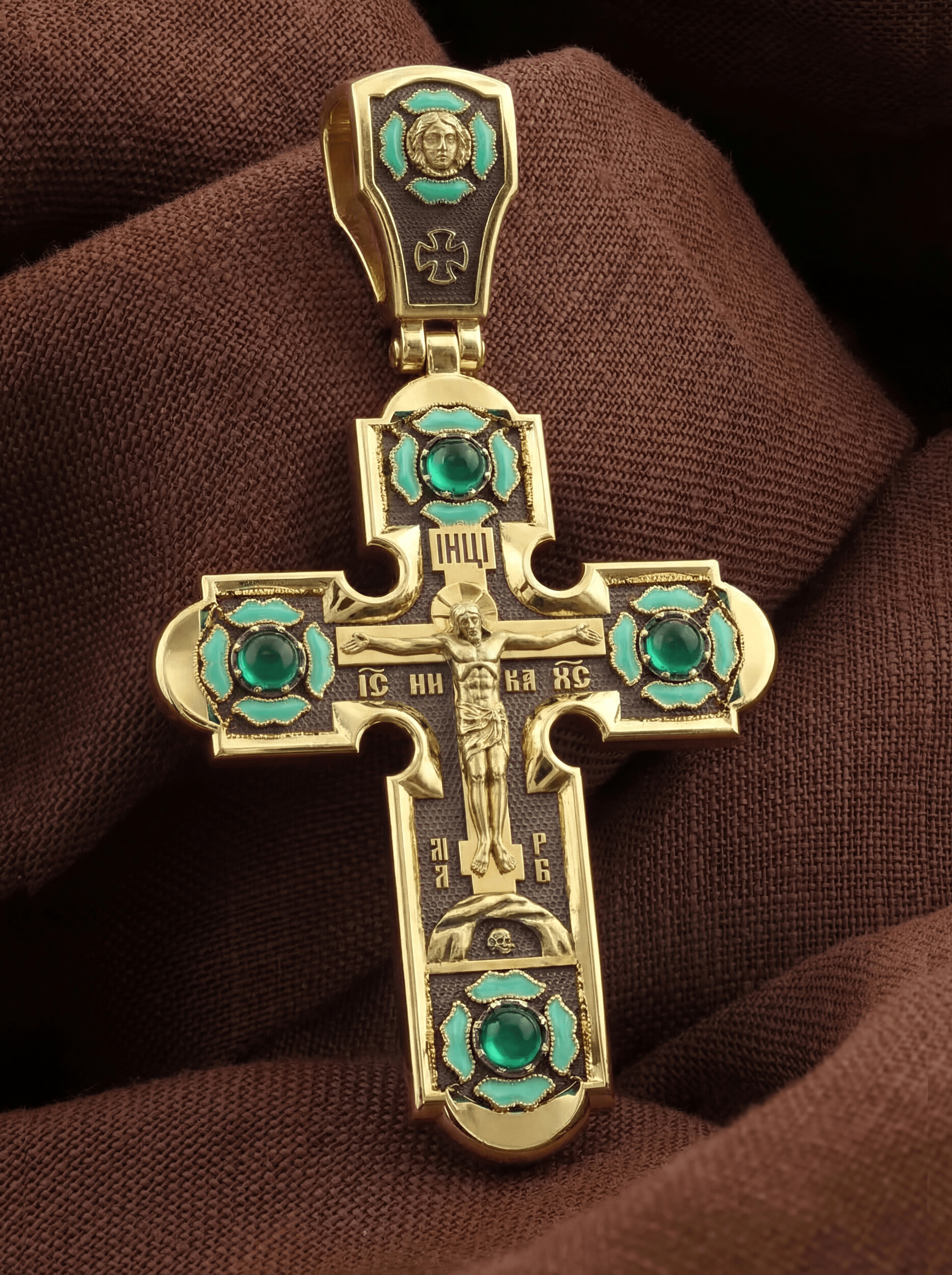 На лицевой стороне креста изображено Распятие Господа и Спасителя нашего Иисуса Христа. Христос, подвергнутый на кресте мучительной казни, своими страданиями искупил нас от древнего греха и даровал нам жизнь вечную. На верхней табличке, выше головы Иисуса, расположена надпись, составленная Понтием Пилатом — «IНЦI». Она означает «Иисус Назорей, Царь Иудейский». Надпись «IС» « ХС» означает Иисус Христос и слово «НИКА», что означает «победитель», помещаются на разных сторонах поперечной перекладины креста. В нижней части креста находится надпись «МЛРБ» — «место лобное рай бысть» означает, что место лобное стало раем. Крест стоит на горе камней, символизирующих Голгофу. Под подножием Креста изображена покоящаяся голова (череп) Адама, грехи которого Христос омыл Своею Кровью. Христос в Своей Божественной любви, над которой смерть не властна и которая, страдая, и не страдает в обычном смысле, простирает к людям со Креста Свои объятия, в которые призывается и привлекается весь мир.