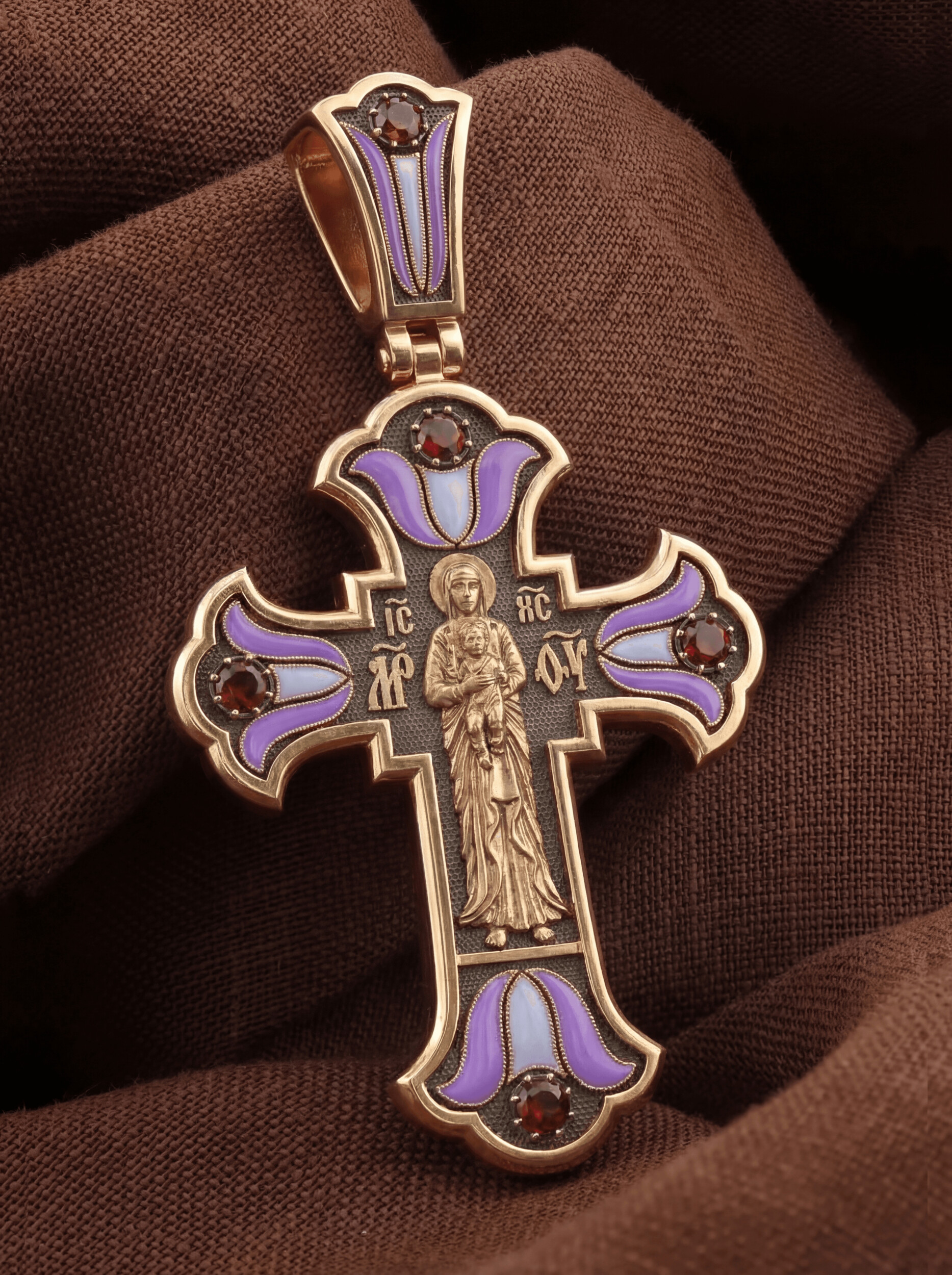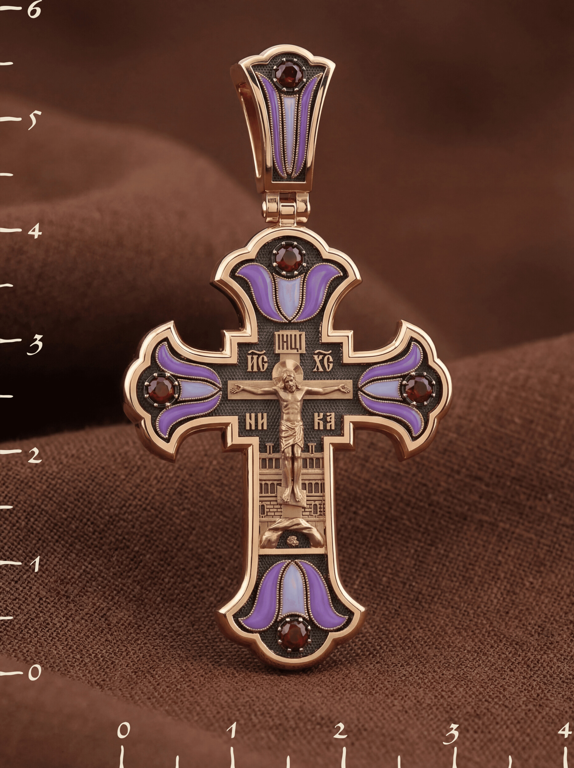 На лицевой стороне креста изображено Распятие Господа и Спасителя нашего Иисуса Христа. Христос, подвергнутый на кресте мучительной казни, своими страданиями искупил нас от древнего греха и даровал нам жизнь вечную. На верхней табличке, выше головы Иисуса, расположена надпись, составленная Понтием Пилатом — «IНЦI». Она означает «Иисус Назорей, Царь Иудейский». Надписи «IС» « ХС» означает Иисус Христос и слово «НИКА», что означает «победитель», помещается на разных сторонах поперечной перекладины креста. За крестом высится Иерусалимская стена, в знак того, что Господь был распят вне стен города. Крест стоит на горе камней, символизирующих Голгофу. Под подножием Креста изображена покоящаяся голова (череп) Адама, грехи которого Христос омыл Своею Кровью.