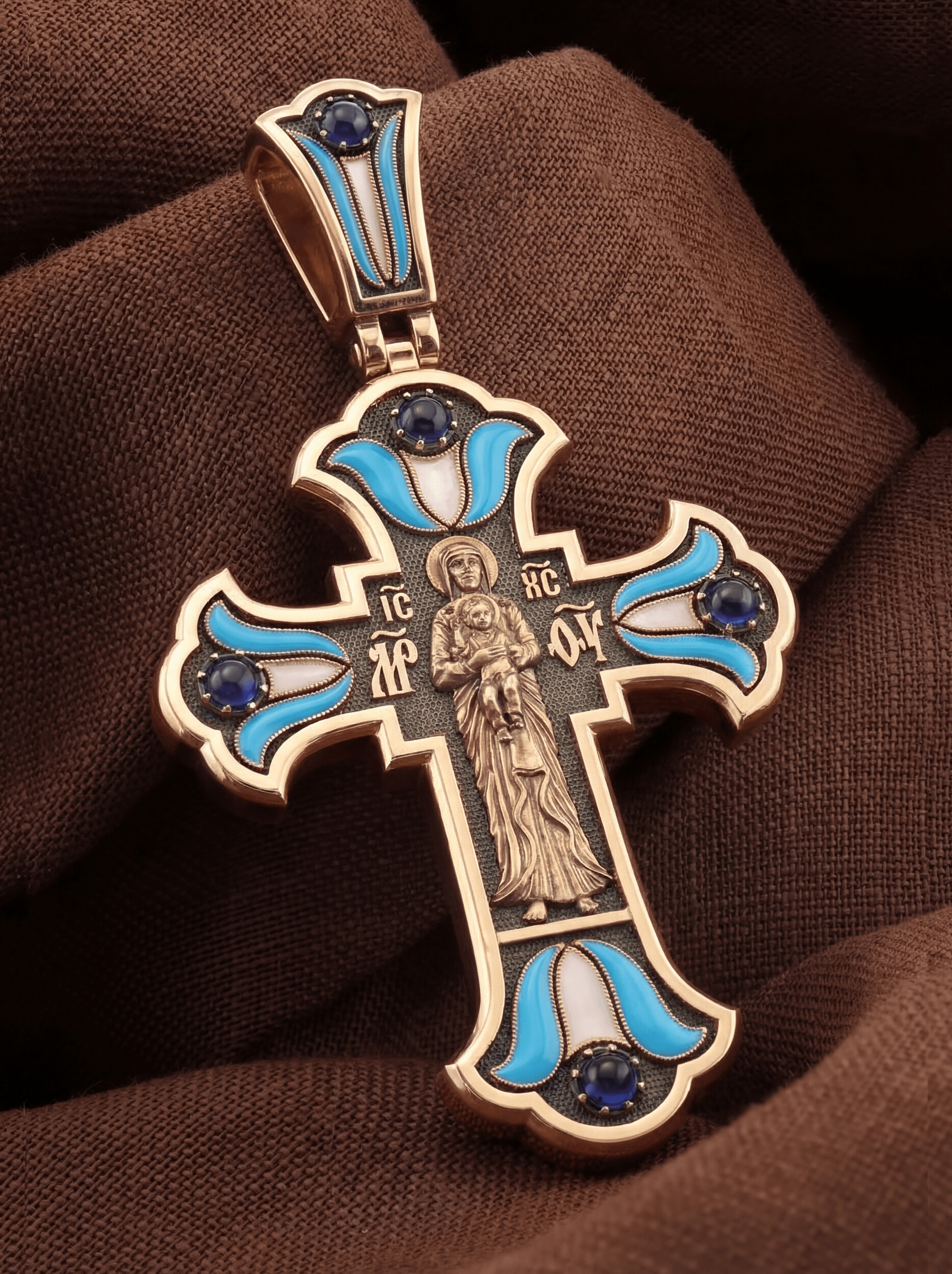На лицевой стороне креста изображено Распятие Господа и Спасителя нашего Иисуса Христа. Христос, подвергнутый на кресте мучительной казни, своими страданиями искупил нас от древнего греха и даровал нам жизнь вечную. На верхней табличке, выше головы Иисуса, расположена надпись, составленная Понтием Пилатом — «IНЦI». Она означает «Иисус Назорей, Царь Иудейский». Надписи «IС» « ХС» означает Иисус Христос и слово «НИКА», что означает «победитель», помещается на разных сторонах поперечной перекладины креста. За крестом высится Иерусалимская стена, в знак того, что Господь был распят вне стен города. Крест стоит на горе камней, символизирующих Голгофу. Под подножием Креста изображена покоящаяся голова (череп) Адама, грехи которого Христос омыл Своею Кровью.