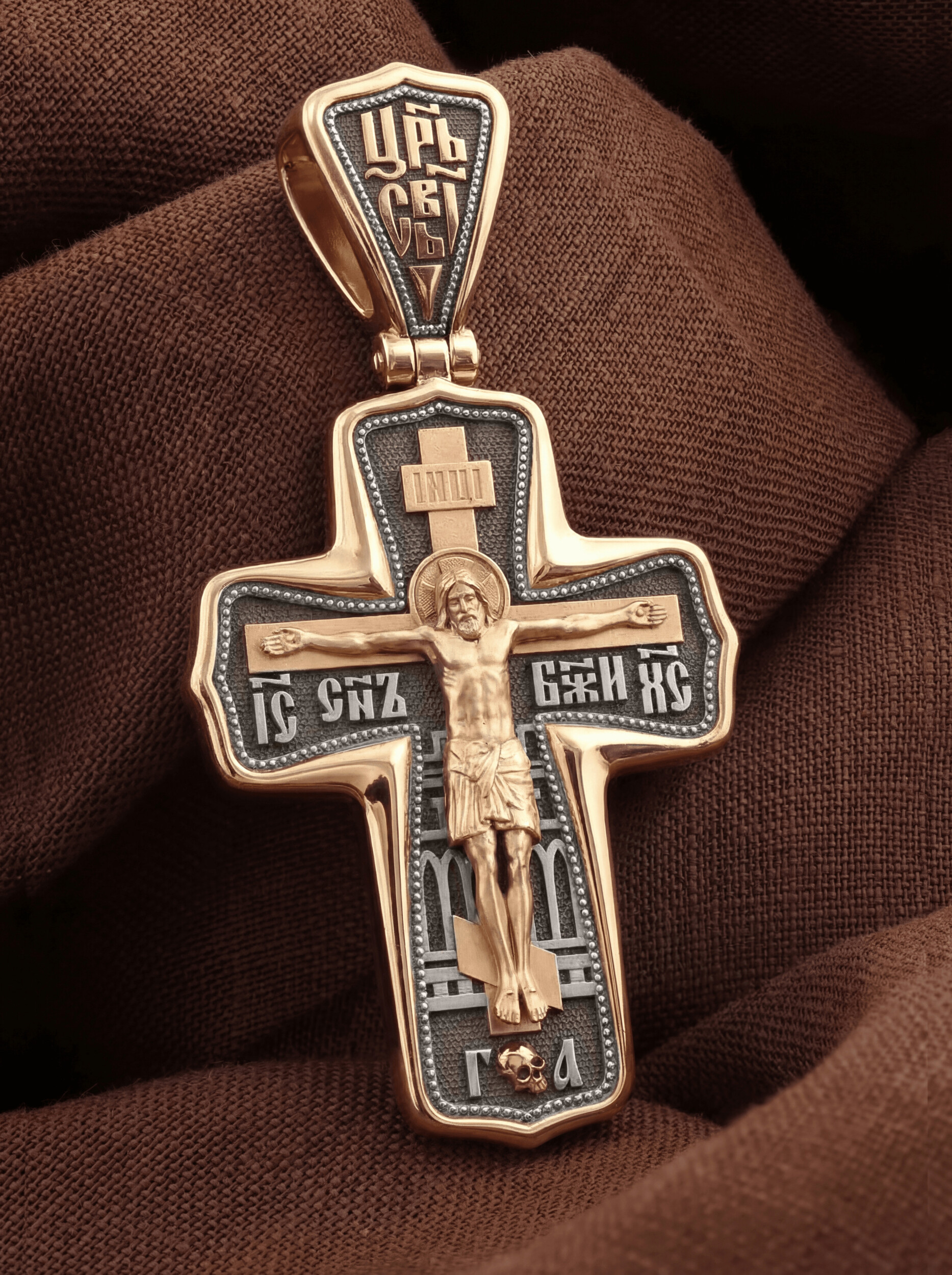На лицевой стороне креста изображено Распятие Господа и Спасителя нашего Иисуса Христа. Крест- символ спасения и искупления рода человеческого, знамение победы над смертью и адом. Он стал символом восстания из мертвых и обретения вечной жизни в Царствии Иисуса Христа, величайшим символом силы и власти Христовой. Иисус Христос, как искупительная жертва освобождения человечества от власти греха, умер крестной смертью и в третий день воскрес. На верхней табличке, выше головы Иисуса, расположена надпись, составленная Понтием Пилатом — «IНЦI». Она означает «Иисус Назорей, Царь Иудейский». На кулонном кольце помещена надпись «Царь Славы». Надпись «IС» « ХС» означает Иисус Христос и помещается на разных сторонах поперечной перекладины креста. Рядом расположена надпись «Сын Божий». За крестом высится Иерусалимская стена. Ниже подножия креста различается череп и надпись «Г.А» — это глава Адамова. На православном кресте Христос не умирает, а свободно простирает руки, ладони Иисуса открыты, будто он хочет обнять все человечество, даря им свою любовь и открывая путь к вечной жизни.