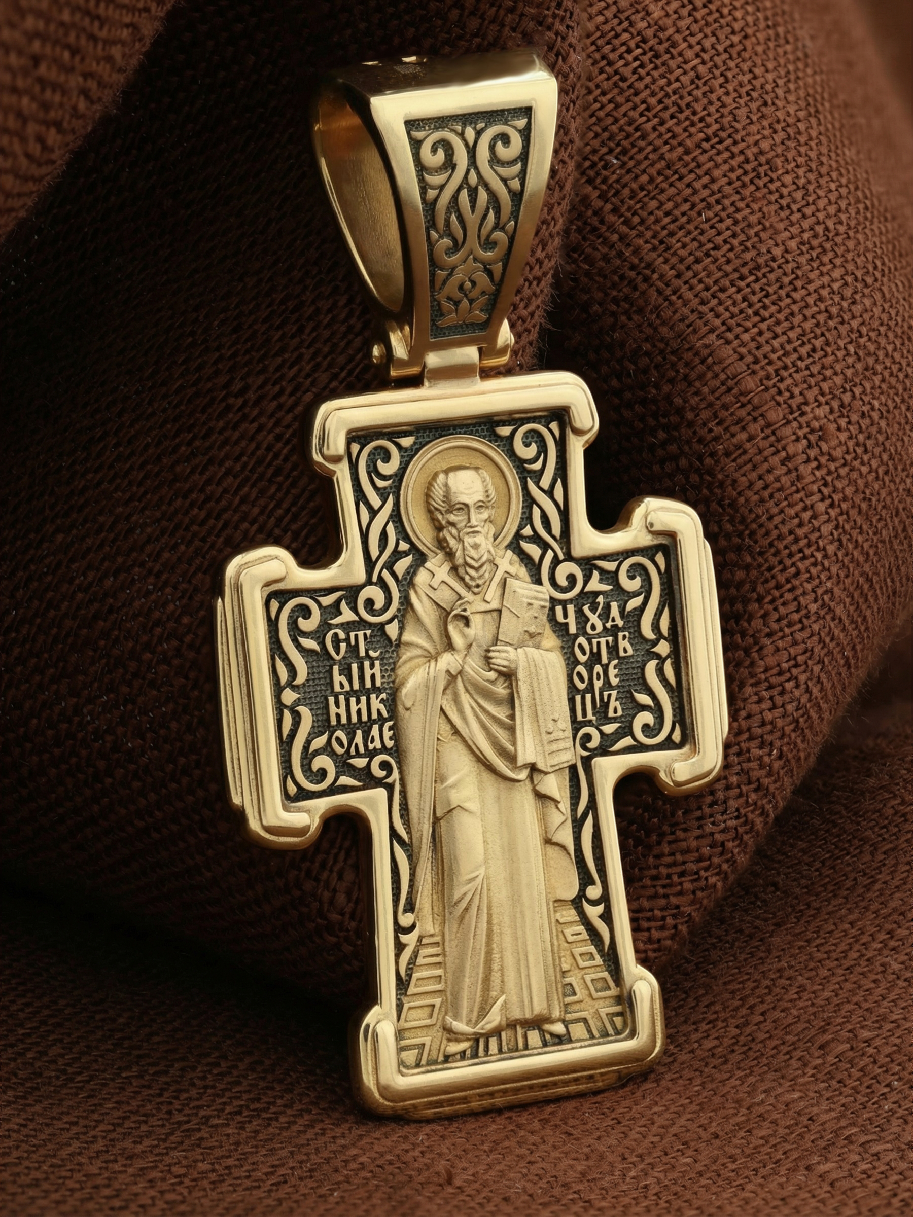 На оборотной стороне креста изображен святитель Николай архиепископ Мир Ликийских, Чудотворец. Он является одним из самых почитаемых святых в православном мире. Святитель Николай родился во второй половине III века в Малой Азии в Ликийском городе Патары. С рождения Божий Угодник проявлял необыкновенные дарования. Сохранилось Предание, что во время крещения он, никем не поддерживаемый, простоял в купели три часа. С детства святитель избегал пустых развлечений, любил молитву, прекрасно учился и проводил свободное время за чтением Священного писания. Приняв сан священника, святитель Николай стал проводить еще более строгую подвижническую жизнь. Вся жизнь святого Николая — это служение Богу. Много великих и преславных чудес сотворил на земле и на море великий Святитель Николай Угодник. Он помогал сущим в бедах, укрощал штормы, спасал от потопления и выносил на сушу из глубины морской, освобождал из плена и приносил освобожденных домой, избавлял от уз и темницы, защищал от посечения мечом, освобождал от смерти и подавал многим различные исцеления, слепым прозрение, хромым хождение, глухим слух, немым дар слова.
