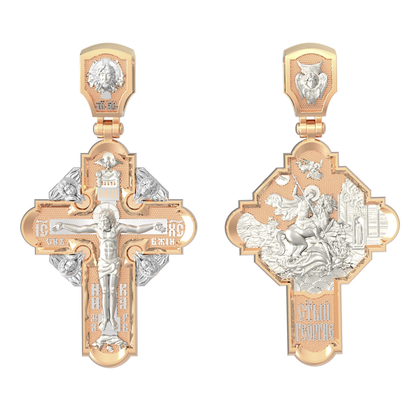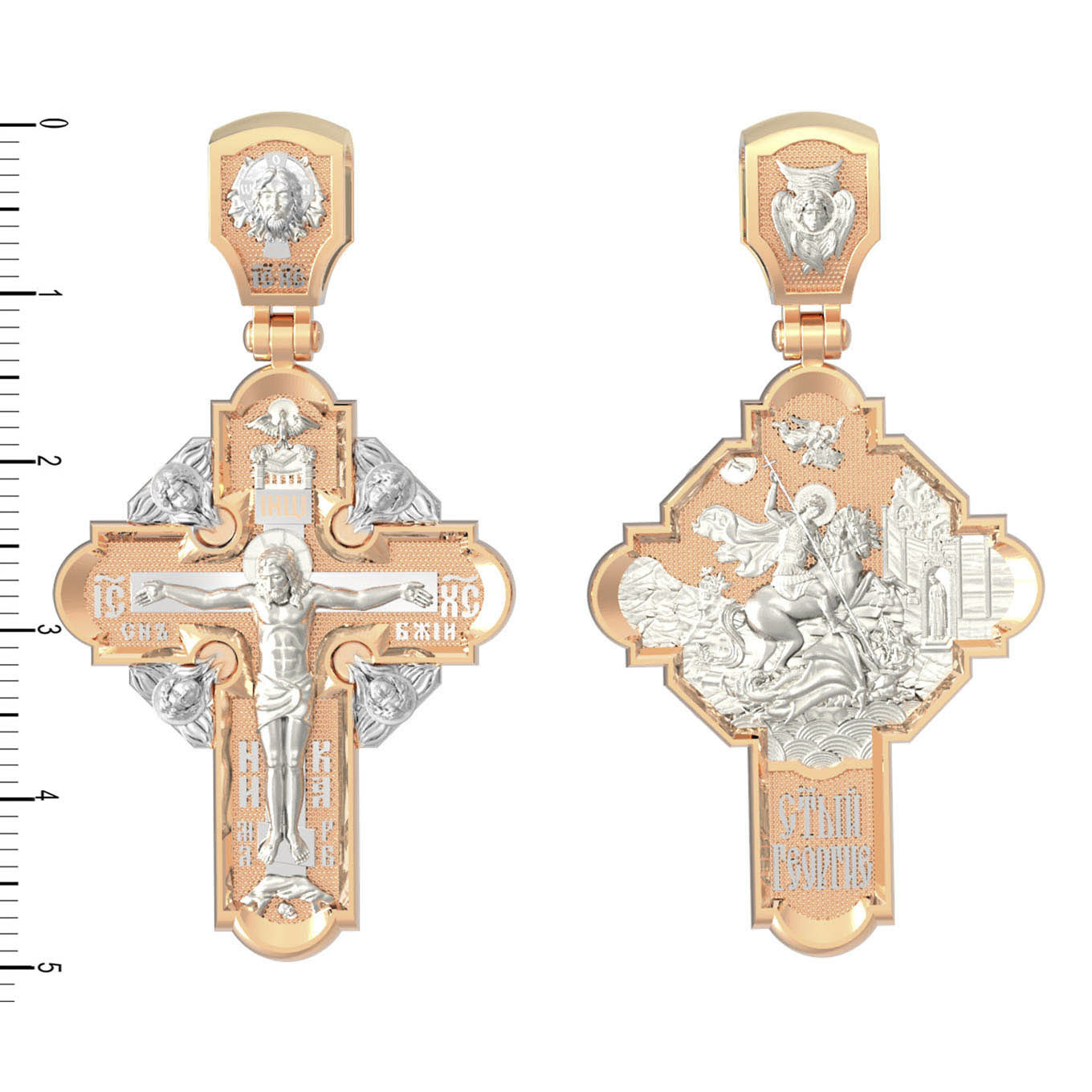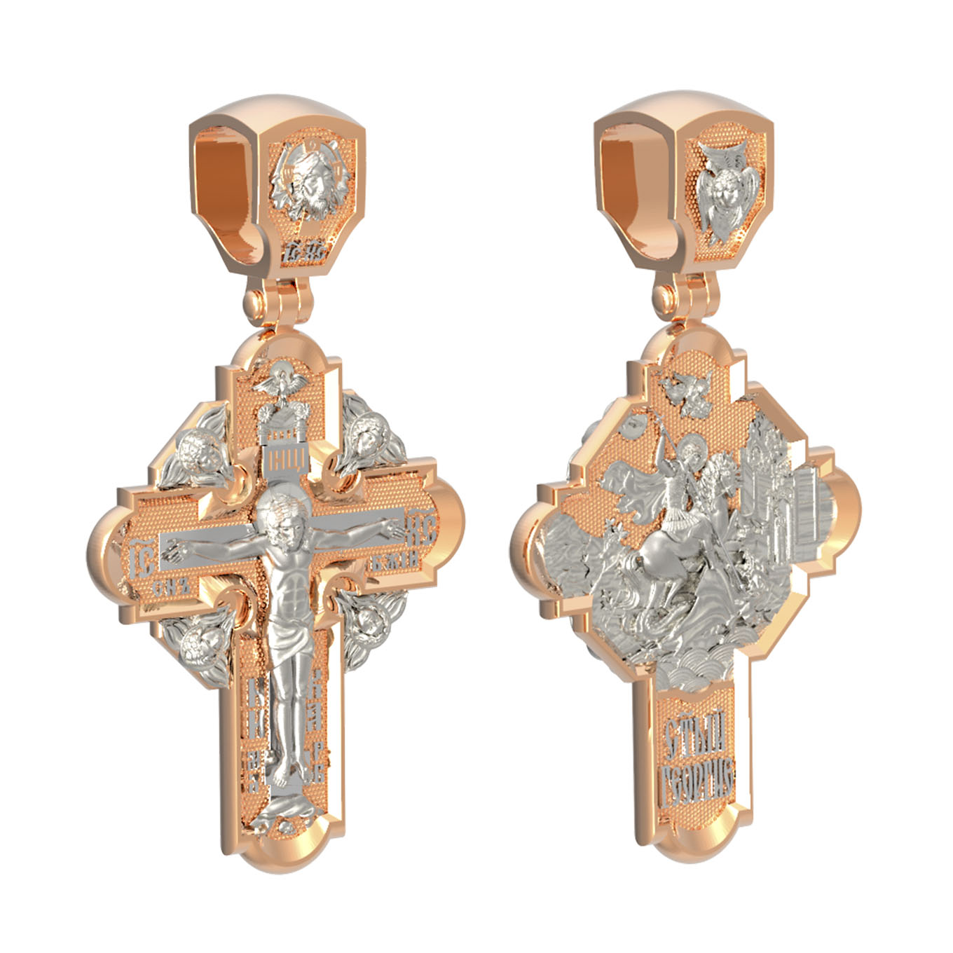 На оборотной стороне креста помещено изображение Святого Великомученика Георгия Победоносца — одного из самых почитаемых и удивительных святых. Георгий родился в Каппадокии (Малая Азия) в семье богатых и знатных горожан. Юношей поступил на службу к римскому императору Диоклетиану, за отличное знание военного дела и проявленную в боях и походах храбрость был приближен к императору и удостоен высокого воинского звания. Во время начавшихся гонений на христиан, перешел на сторону гонимых и, отвергнув человеческий страх, стал ярым проповедником учения Христа. Мучители подвергли опального воеводу жесточайшим восьмидневным пыткам и казнили его (обезглавили) в возрасте около тридцати лет в 303 году. Георгий изображен как воитель, сидящий на вздыбленном коне и поражающий копьем огнедышащего змея. Слева над образом изображена благословляющая Божия десница. Над святым изображен ангел возлагающий на него венец мученика. Змей символизирует собою сатанинские силы. Молитвами вознесенными к Всевышнему и своей непреклонной верой он смог одолеть чудовище. Святой убил змея, спас царскую дочь, принесенную в жертву, и жителей города, их души от влияния дьявола, породив в них надежду и веру в Господа, призывая людей принять христианскую веру. На кулонном кольце изображен шестикрылый Ангел — Серафим.