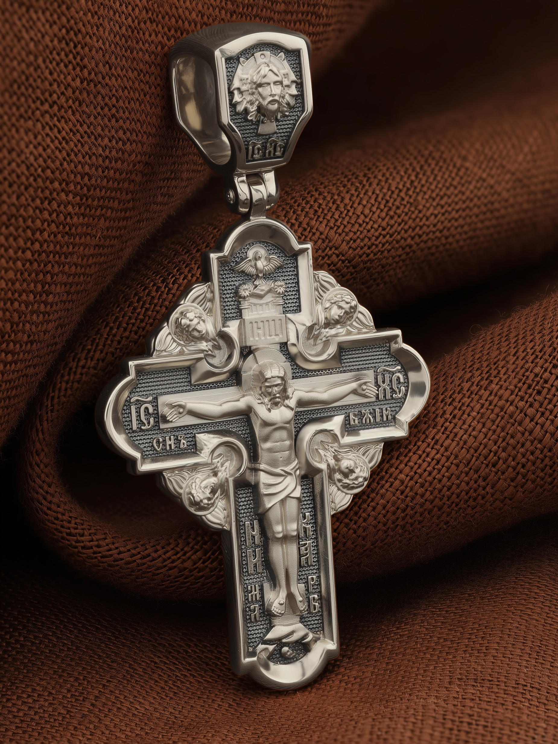На лицевой стороне креста изображено Распятие Господа и Спасителя нашего Иисуса Христа. Крест- символ спасения и искупления рода человеческого, знамение победы над смертью и адом. Верхняя перекладина символизирует титло — табличку, на которой, согласно Евангелию, было начертано: Иисус Назорей Царь Иудейский (IНЦI). Надпись «IC» «ХC», означает Иисус Христос, помещается на разных сторонах поперечной перекладины креста. Ниже перекладины расположено словосочетание «СЫН БОЖИЙ», что означает божественную природу Иисуса Христа. Надпись «МЛРБ» — «место лобное рай бысть» означает, что место лобное стало раем и помещаются в нижней части креста. Рядом — слово «НИКА», что означает «победитель». Возвышение, на котором стоит Крест, символизирует гору Голгофу, на которой произошло Распятие. Под подножием Креста изображена покоящаяся голова (череп) Адама. На кулонном кольце изображен Нерукотворный образ Господа и Спасителя нашего Иисуса Христа, чудесно отпечатавшийся на плате, которым Христос вытер свой лик.