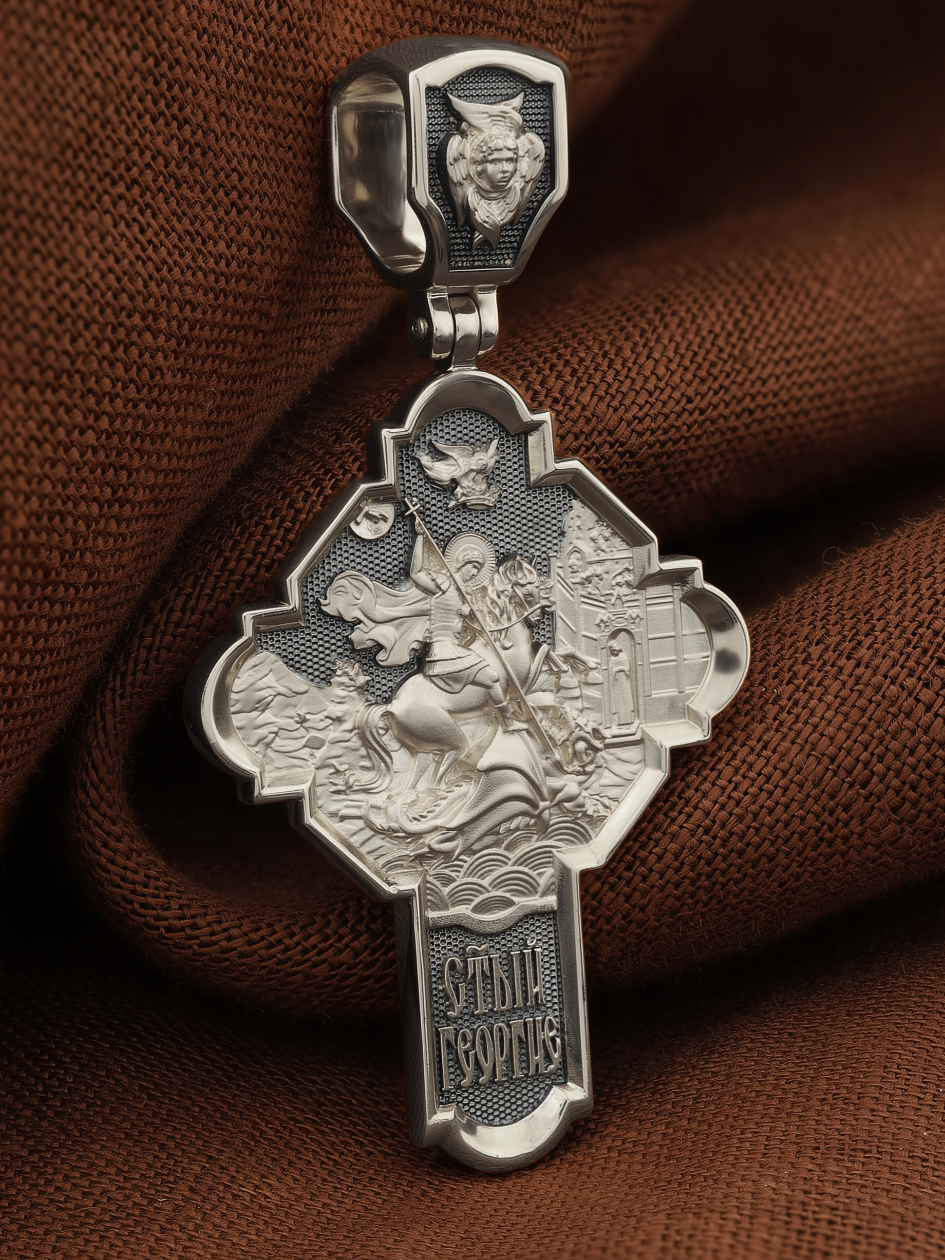 На оборотной стороне креста помещено изображение Святого Великомученика Георгия Победоносца — одного из самых почитаемых и удивительных святых. Георгий родился в Каппадокии (Малая Азия) в семье богатых и знатных горожан. Юношей поступил на службу к римскому императору Диоклетиану, за отличное знание военного дела и проявленную в боях и походах храбрость был приближен к императору и удостоен высокого воинского звания. Во время начавшихся гонений на христиан, перешел на сторону гонимых и, отвергнув человеческий страх, стал ярым проповедником учения Христа. Мучители подвергли опального воеводу жесточайшим восьмидневным пыткам и казнили его (обезглавили) в возрасте около тридцати лет в 303 году. Георгий изображен как воитель, сидящий на вздыбленном коне и поражающий копьем огнедышащего змея. Слева над образом изображена благословляющая Божия десница. Над святым изображен ангел возлагающий на него венец мученика. Змей символизирует собою сатанинские силы. Молитвами вознесенными к Всевышнему и своей непреклонной верой он смог одолеть чудовище. Святой убил змея, спас царскую дочь, принесенную в жертву, и жителей города, их души от влияния дьявола, породив в них надежду и веру в Господа, призывая людей принять христианскую веру. На кулонном кольце изображен шестикрылый Ангел — Серафим.
