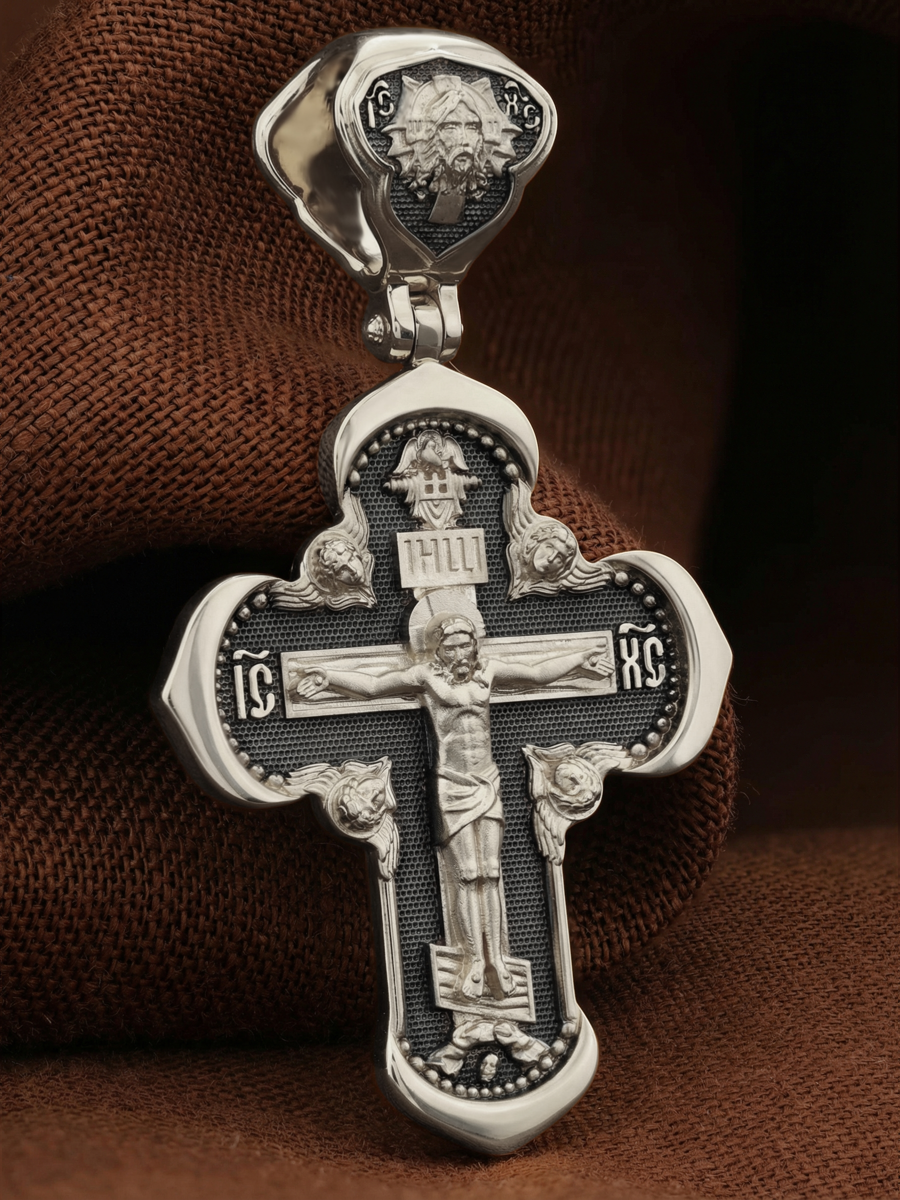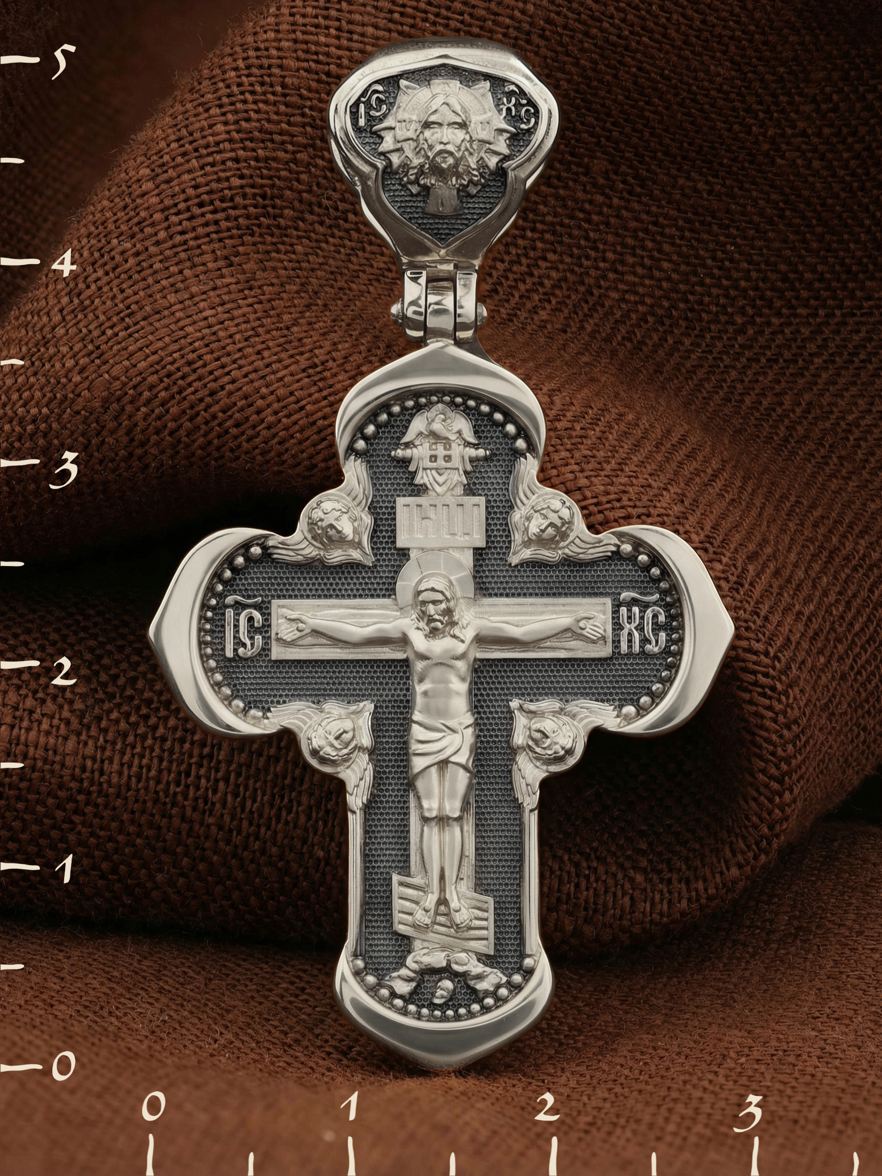 На лицевой стороне креста изображено Распятие Господа и Спасителя нашего Иисуса Христа, отдавшего Себя на смерть, для искупления грехов мира. Крест является символом жертвенной любви Всеблагого Бога к падшим людям, всепобеждающим духовным оружием христиан, основанием и средоточием церковной жизни. Господь сказал: кто хочет идти за Мною, отвергнись себя, и возьми крест свой, и следуй за Мною. (Мк. 8: 34). Над Распятием помещена надпись «Царь Славы». На верхней табличке, выше головы Иисуса, расположена надпись, составленная Понтием Пилатом — «IНЦI». Она означает «Иисус Назорей, Царь Иудейский». Надпись «IC» «ХC», означает Иисус Христос, помещается на разных сторонах поперечной перекладины креста. Возвышение, на котором стоит Крест, символизирует гору Голгофу, на которой произошло Распятие. Под подножием Креста изображена покоящаяся голова (череп) Адама. На кулонном кольце изображен Нерукотворный образ Господа и Спасителя нашего Иисуса Христа, чудесно отпечатавшийся на плате, которым Христос вытер свой лик.