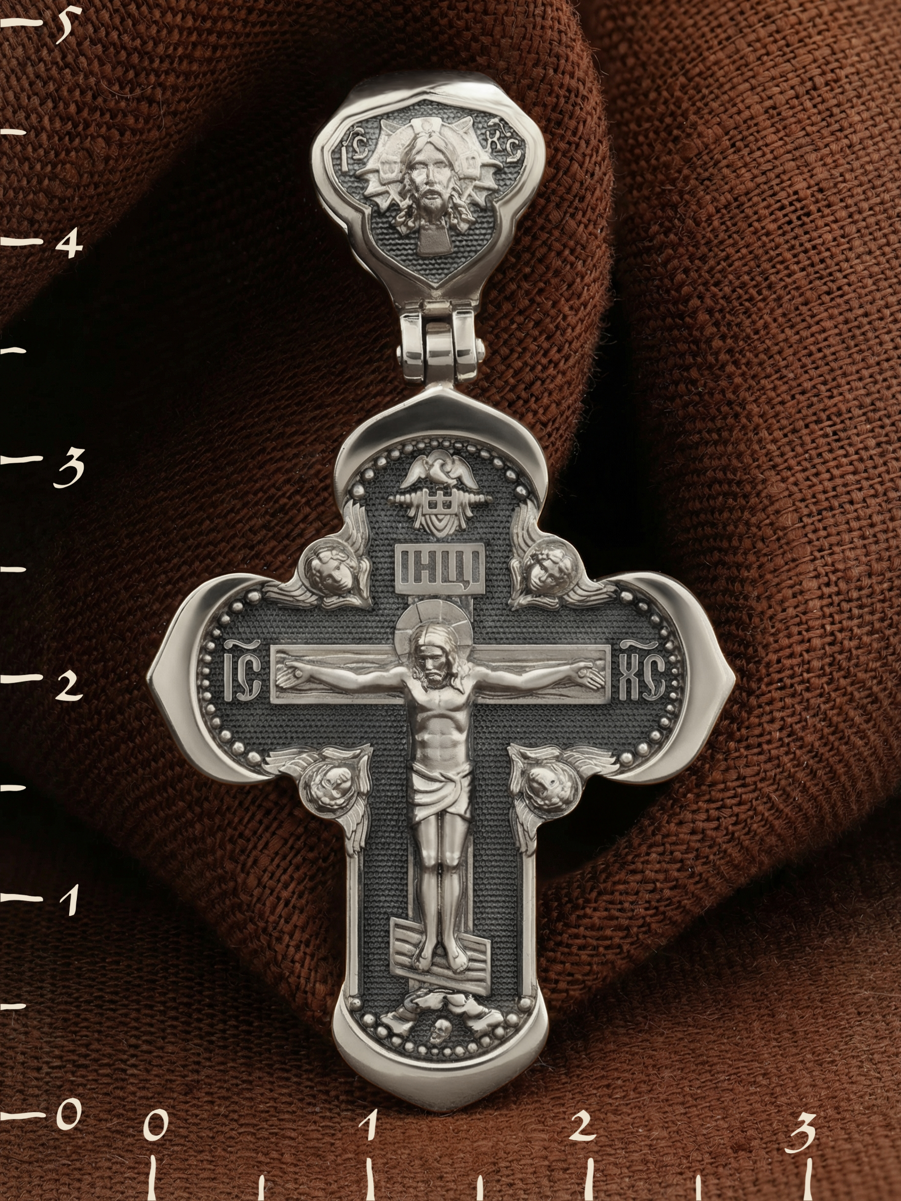 На лицевой стороне креста изображено Распятие Господа и Спасителя нашего Иисуса Христа, отдавшего Себя на смерть, для искупления грехов мира. Крест является символом жертвенной любви Всеблагого Бога к падшим людям, всепобеждающим духовным оружием христиан, основанием и средоточием церковной жизни. Господь сказал: «кто хочет идти за Мною, отвергнись себя, и возьми крест свой, и следуй за Мною». (Мк. 8: 34). На верхней табличке, выше головы Иисуса, расположена надпись, составленная Понтием Пилатом — «IНЦI». Она означает «Иисус Назорей, Царь Иудейский». Надпись «IC» «ХC», означает Иисус Христос, помещается на разных сторонах поперечной перекладины креста. Крест стоит на горе камней, символизирующих Голгофу. В ее основании различается череп– это голова Адама. На кулонном кольце изображен Нерукотворный образ Господа и Спасителя нашего Иисуса Христа, чудесно отпечатавшийся на плате, которым Христос вытер свой лик.