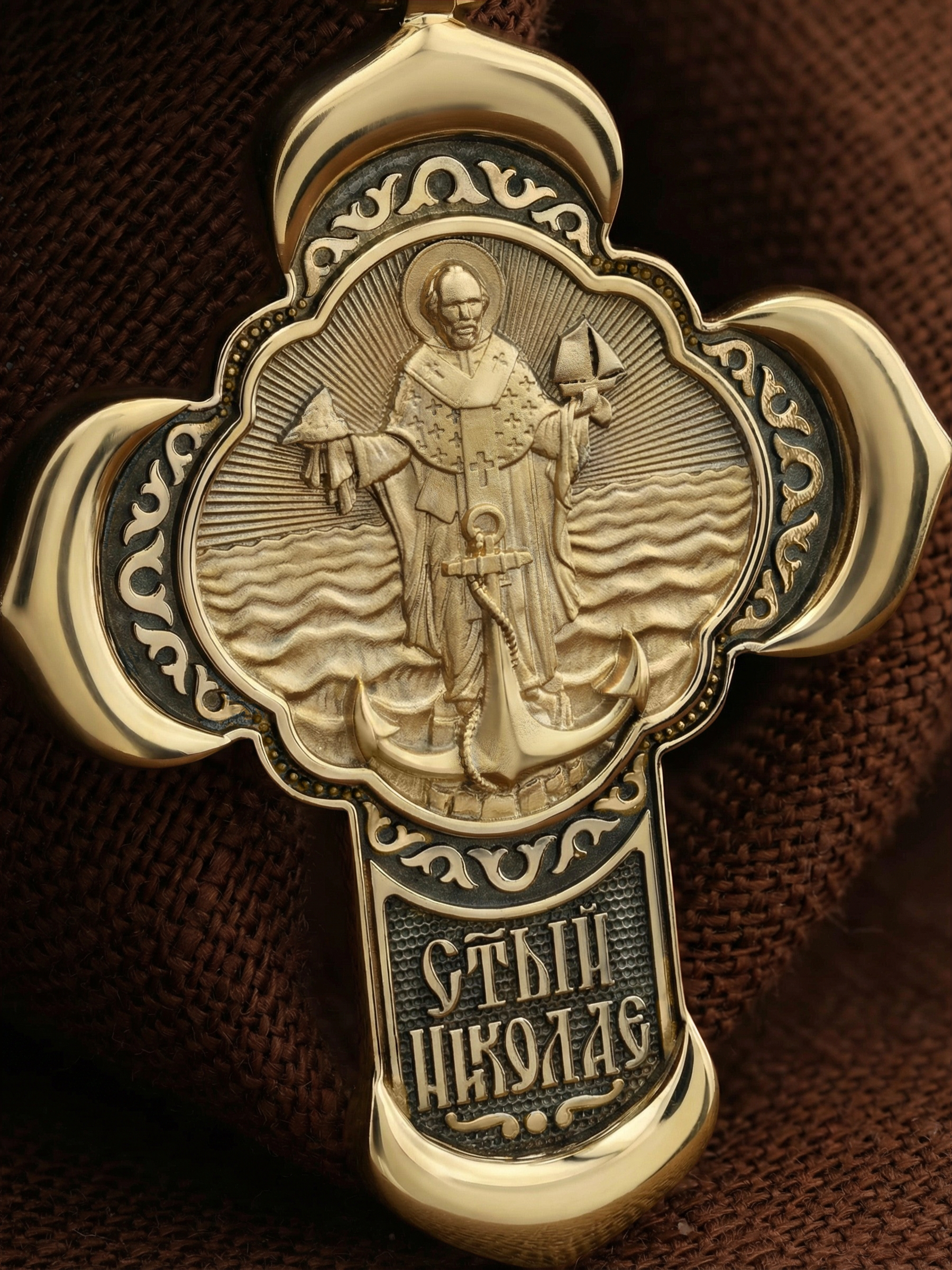 На оборотной стороне креста изображена икона Святителя Николая архиепископа Мир Ликийских, Чудотворца. В правой руке Святителя Николая изображен мыс Горн, а в левой — корабль. Он стоит на возвышенности среди бушующих волн и впереди изображен большой якорь. Эта икона была написана путешественником и священником Фёдором Конюховым. Во время одного из своих кругосветных путешествий, проходя пролив Дрейка, Фёдор, понимая, что выжить в такой бушующей стихии невозможно, стал молиться Святителю Николаю Чудотворцу. Он мысленно пообещал себе: «если пройду мыс Горн, то построю часовню Николаю Чудотворцу»… И в следующий миг, совсем неожиданно — волны утихли. Яхта Конюхова благополучно прошла опасный участок пути. Вернувшись домой, Фёдор Конюхов построил часовню в благодарность за свое спасение. Святитель Николай является одним из самых известных на Руси святых, издревле считающийся помощником и молитвенником за всех, притекающих к нему. Николай Чудотворец подавал многим исцеления в болезнях и телесных недугах, обогащал бедствующих в крайней нищете, подавал голодным пищу, спасал от потопления, освобождал из плена и избавлял от смерти. Чудес его исчислить невозможно.