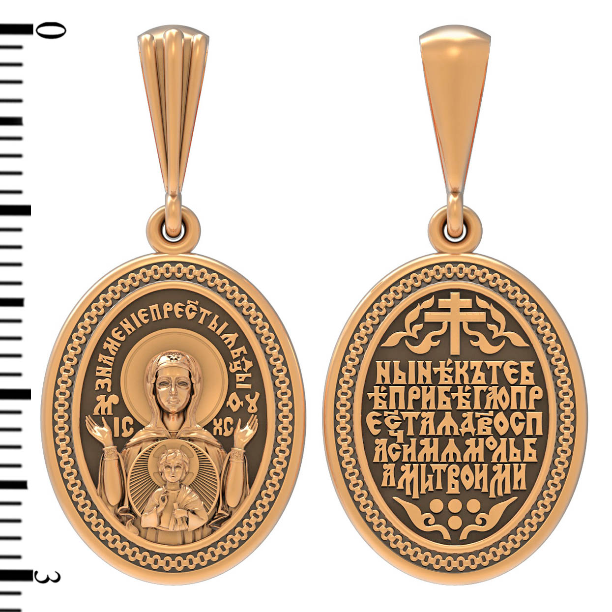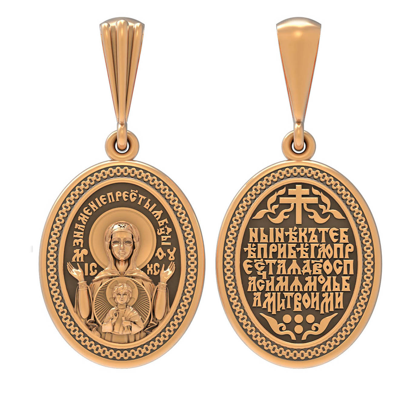 В центр образка помещен образ Божией Матери «Знамение», прославившийся многими чудесами в Новгороде в XII веке. Икона эта чтится как одна из самых великих святынь Русской земли. Молитвенно воздетые руки Богородицы означают заступничество за людей пред Богом. Рядом с Ней, на фоне круглого щита, — благословляющий Божественный Младенец — Спас-Эммануил.