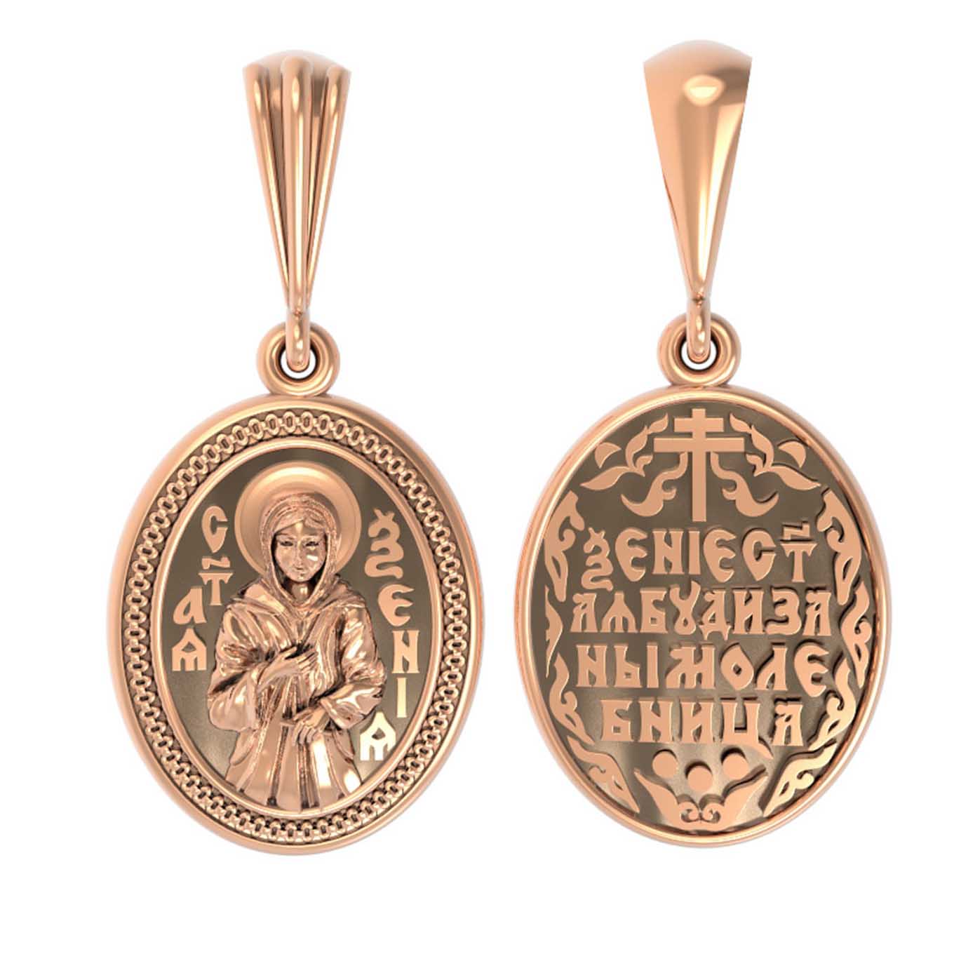 На лицевой стороне образка изображена Святая блаженная Ксения Петербургская, в миру Ксения Григорьевна Петрова.