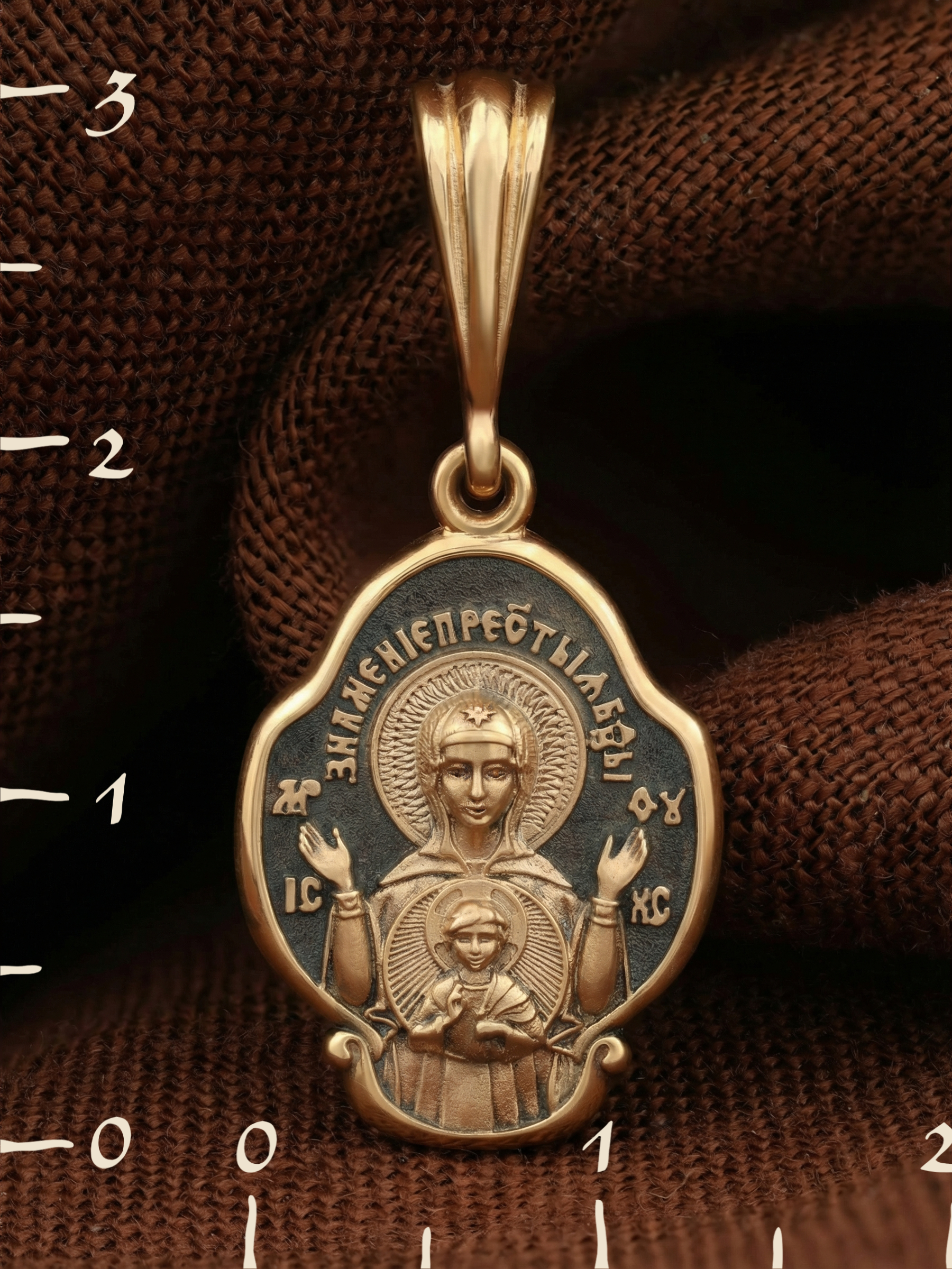 В центр образка помещен образ Божией Матери «Знамение», прославившийся многими чудесами в Новгороде в XII веке. Икона эта чтится как одна из самых великих святынь Русской земли. Молитвенно воздетые руки Богородицы означают заступничество за людей пред Богом. Рядом с Ней, на фоне круглого щита, — благословляющий Божественный Младенец — Спас-Эммануил.