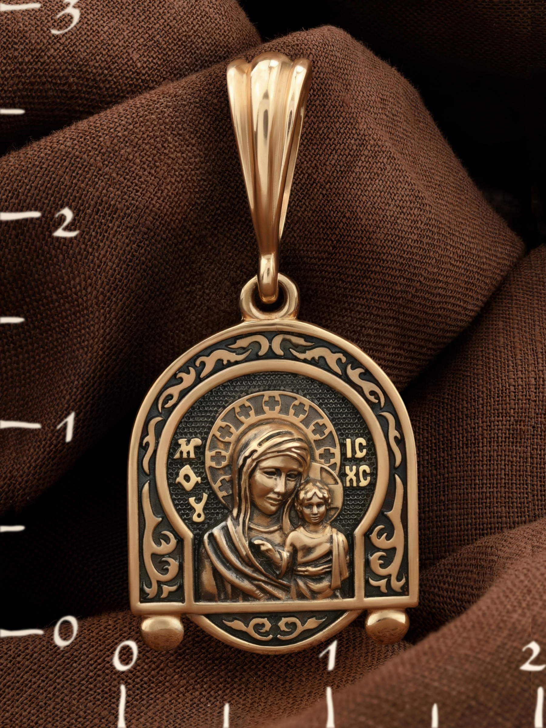 На лицевой части образка изображена Казанская икона Божией Матери — одна из самых почитаемых в России чудотворных икон Богородицы. Богословское значение Казанской иконы — указать верующим истинный Путь к спасению, который лежит через Христа. Только Божия Матерь имеет настолько сильное дерзновение к Спасителю, что может ходатайствовать перед Ним за всех верных. Именно этот образ дарится новой повенчанной паре, как хранитель очага и семейная реликвия. Молитва перед Казанской иконой Божьей Матери помогает во всех сложных случаях жизни, в болезнях, во всех печалях, невзгодах, скорбях. Уникальная история появления, чудеса, случившиеся по молитвам православных людей возле образа — все это делает Казанскую Богородицу особенной, среди тысяч других икон.