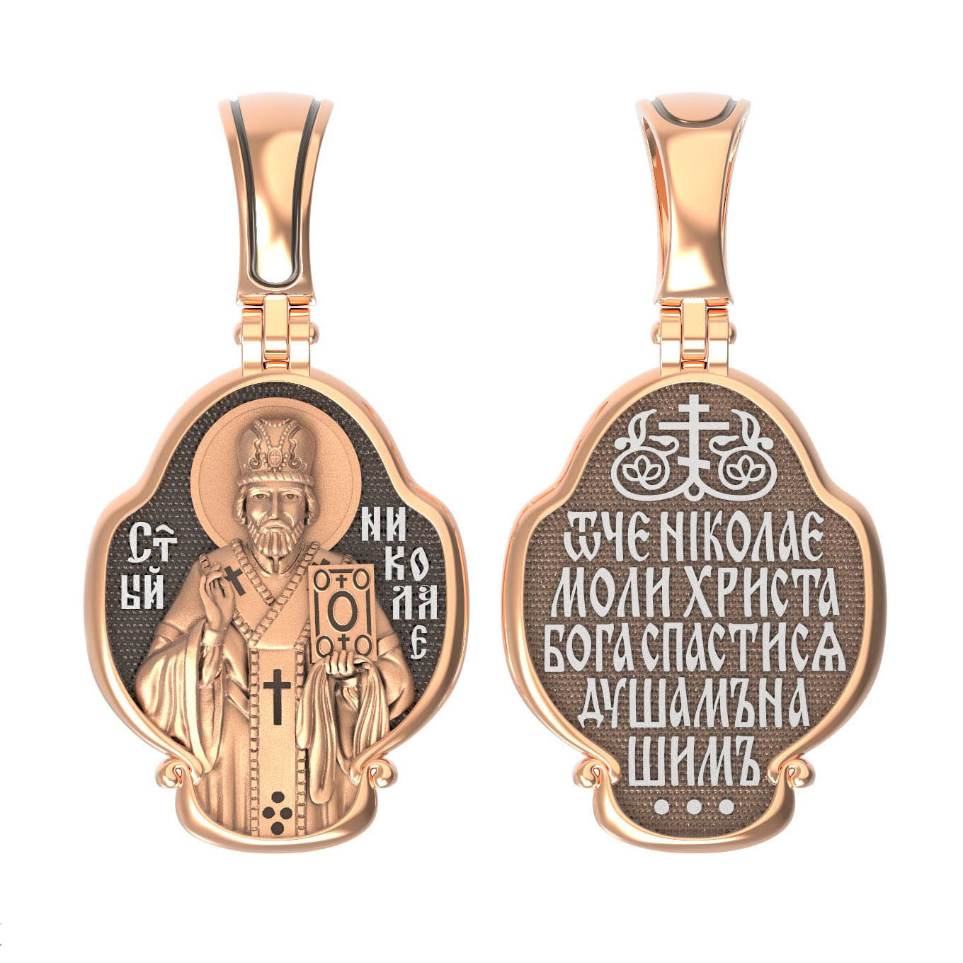Лицевую сторону возглавляет икона святителя Николая Чудотворца. Святитель Николай родился во второй половине III века в Малой Азии в Ликийском городе Патары. С рождения Божий Угодник проявлял необыкновенные дарования. Сохранилось Предание, что во время крещения он, никем не поддерживаемый, простоял в купели три часа. С детства святитель избегал пустых развлечений, любил молитву, прекрасно учился и проводил свободное время за чтением Священного Писания. По достижении зрелого возраста жители Патар выбрали его своим пресвитером. Несколько лет спустя св. Николай стал епископом в городе Миры, столице Ликии.