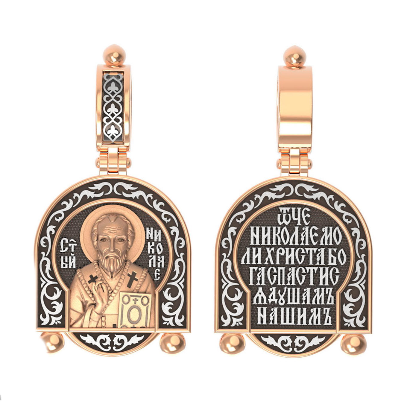 На лицевой стороне образка изображен Святитель Николай архиепископ Мир Ликийских, Чудотворец. Он является одним из самых почитаемых святых в православном мире. Святитель Николай родился во второй половине III века в Малой Азии в Ликийском городе Патары. С рождения Божий Угодник проявлял необыкновенные дарования. Сохранилось Предание, что во время крещения он, никем не поддерживаемый, простоял в купели три часа. Приняв сан священника, святитель Николай стал проводить еще более строгую подвижническую жизнь. Избранник Божий Николай стал вершиной всех добродетелей, поднятой до райской высоты. С кем из величайших праведников не сравнялся он образом духовной красоты, кому из них не последовал в своих деяниях и чудотворениях? Вся жизнь святого Николая — это служение Богу. Много великих и преславных чудес сотворил великий Святитель Николай Угодник. Он помогал сущим в бедах, укрощал штормы, спасал от потопления и выносил на сушу из глубины морской, освобождал из плена и приносил освобожденных домой, избавлял от уз и темницы, защищал от посечения мечом, освобождал от смерти и подавал многим различные исцеления: слепым — прозрение, хромым — хождение, глухим — слух, немым — дар слова.