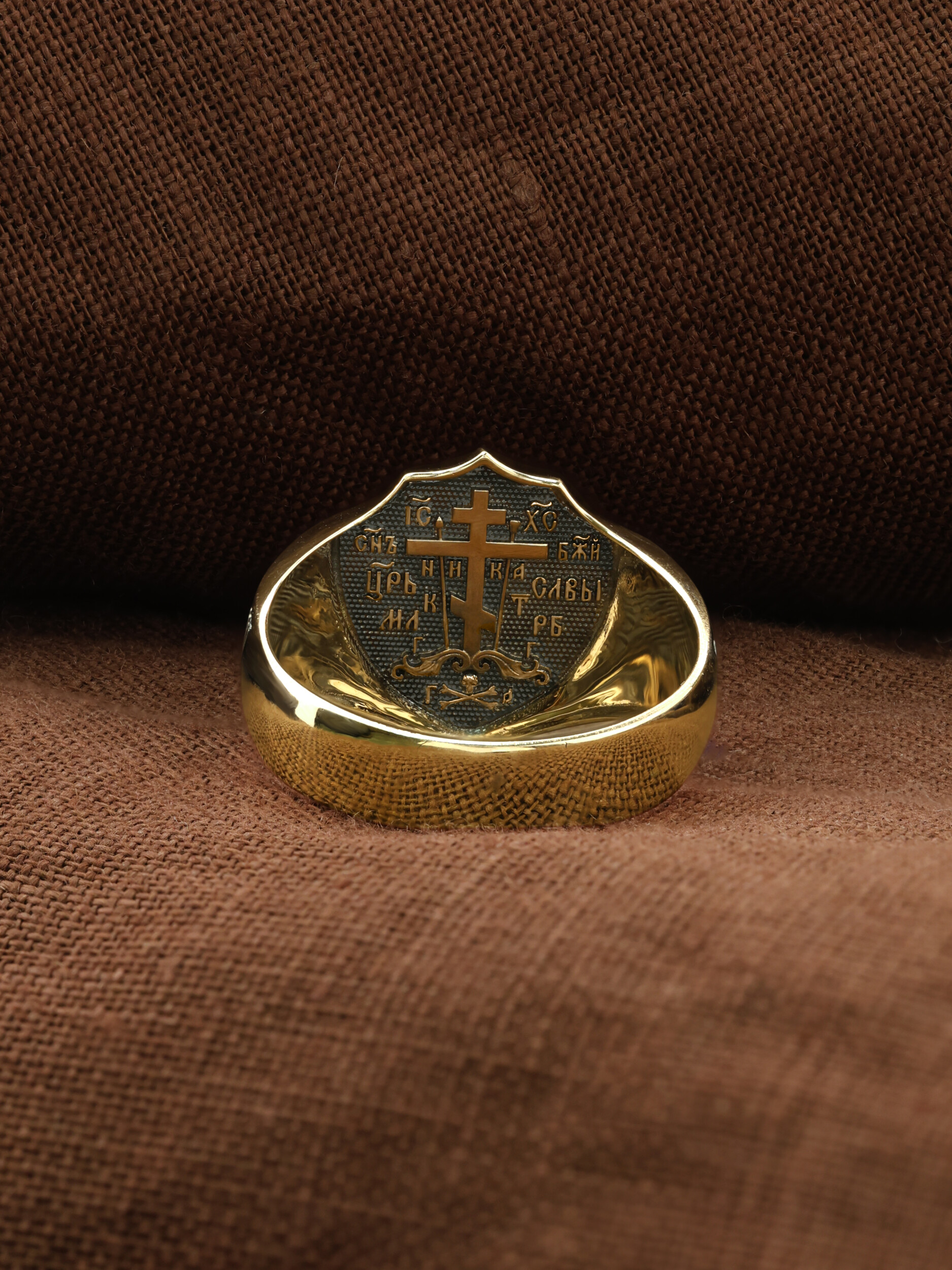 С внутренней стороны кольца изображен «Голгофский крест». Центральным и главным элементом композиции лицевой стороны является восьмиконечный крест — образ Честного и Животворящего Креста Господня, установленного на горе Голгофе. В основании креста изображена гора Голгофа, на которой был распят Спаситель и череп Адама, чьи кости по приданию омыла кровь Иисуса Христа. Перед головой располагаются лежащие кости рук, изображаются правая на левой, как при погребении или причащении. В XVI веке на Руси около изображения Голгофы появились обозначения «М.Л.Р.Б.» — Место Лобное Рай Бысть (Голгофа в переводе с еврейского — Лобное место). Чуть ниже справа и слева буквы «Г.Г.» — гора Голгофа.