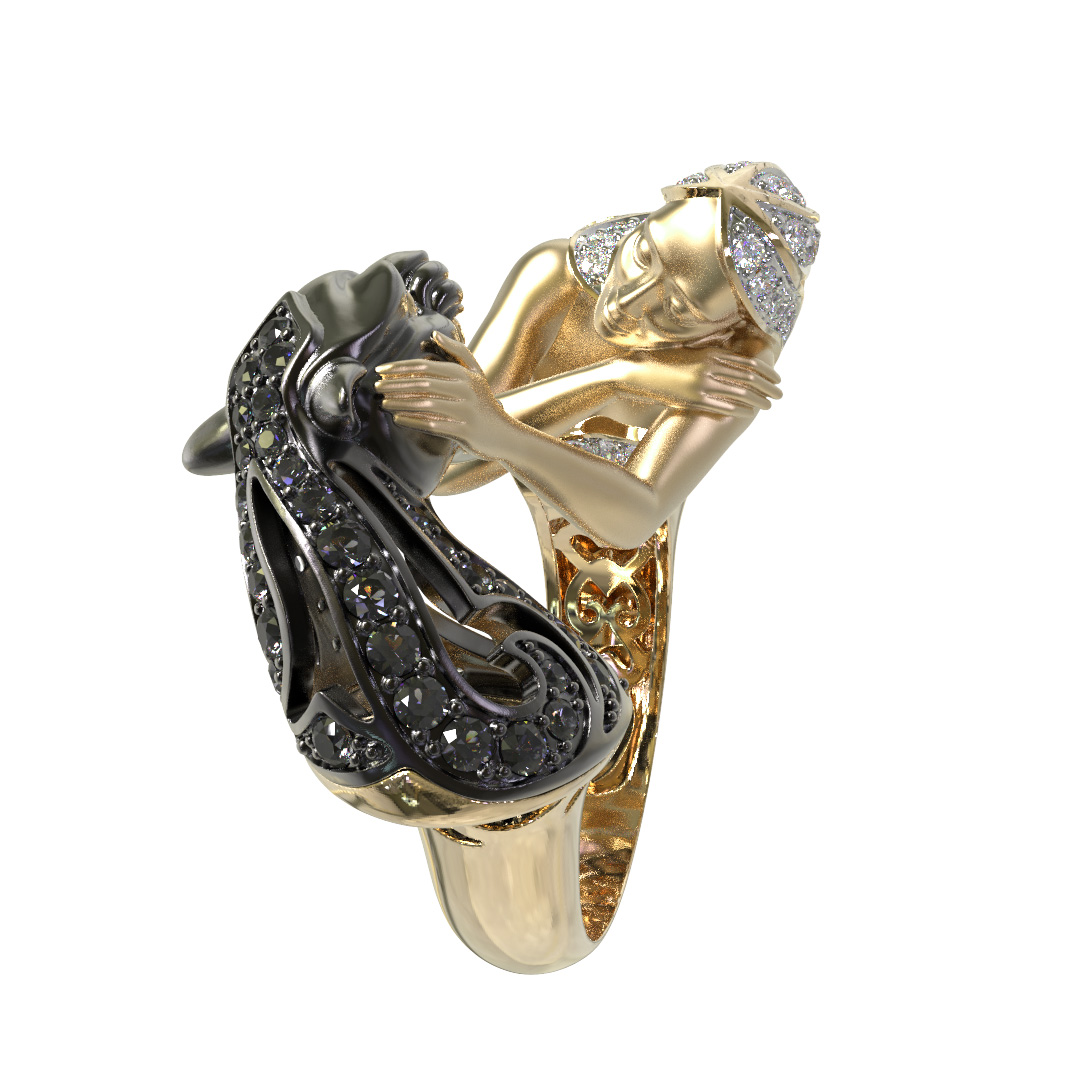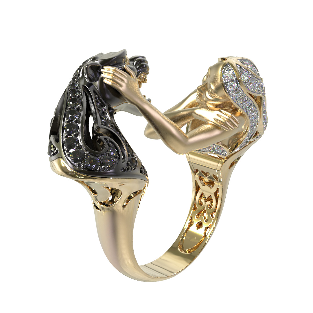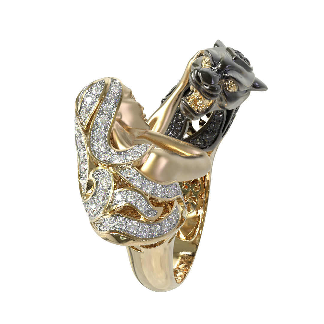 Особую выразительность модели придают 116 вставок из фианитов круглой формы. Контрастное сочетание черного цвета вставок и сияющего металла создает динамичный и глубокий образ, который притягивает взгляд. Ювелиры тщательно проработали каждую линию, чтобы подчеркнуть детализированный дизайн кольца.