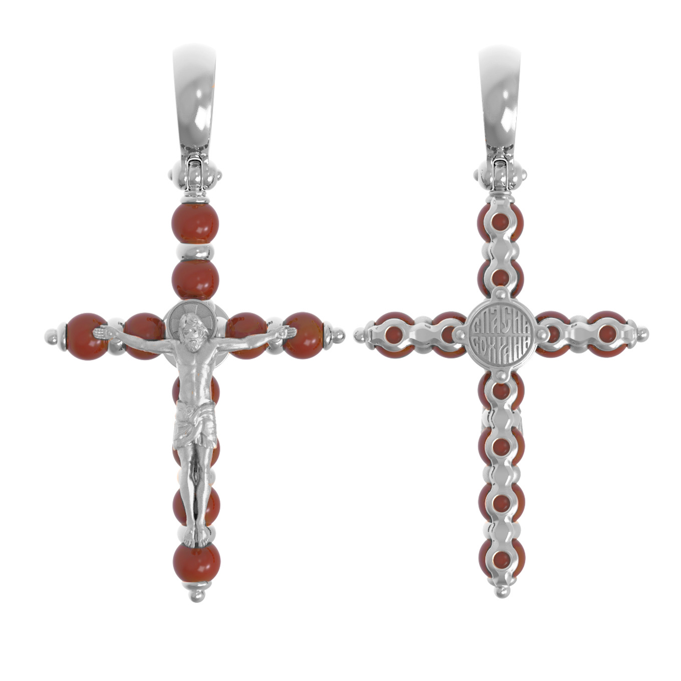 Крест из белого золота 585 пробы c кораллом