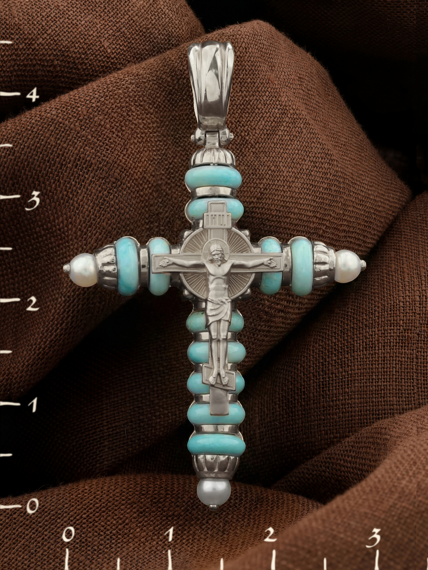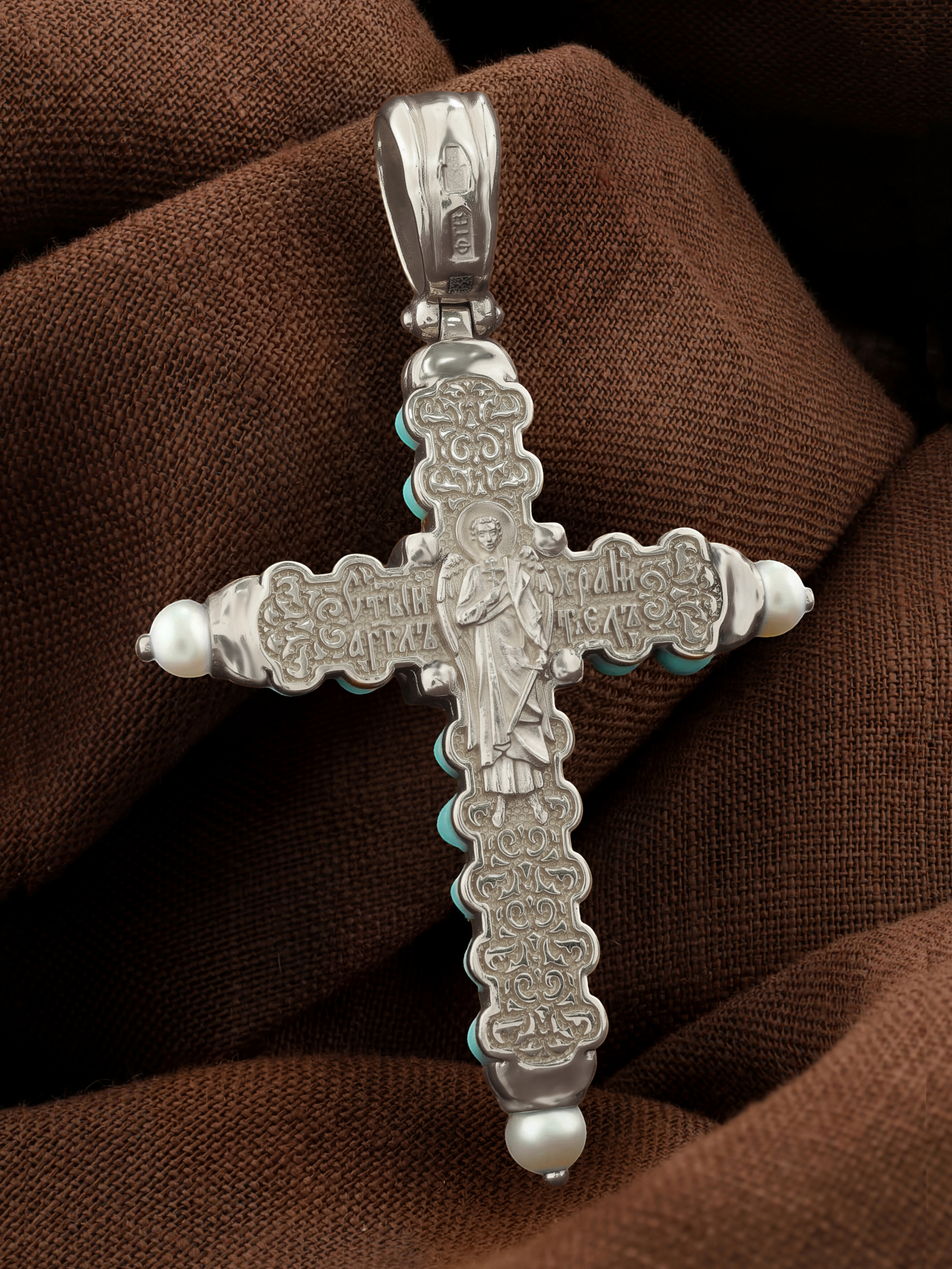 Крест из белого золота c жемчугом и бирюзой