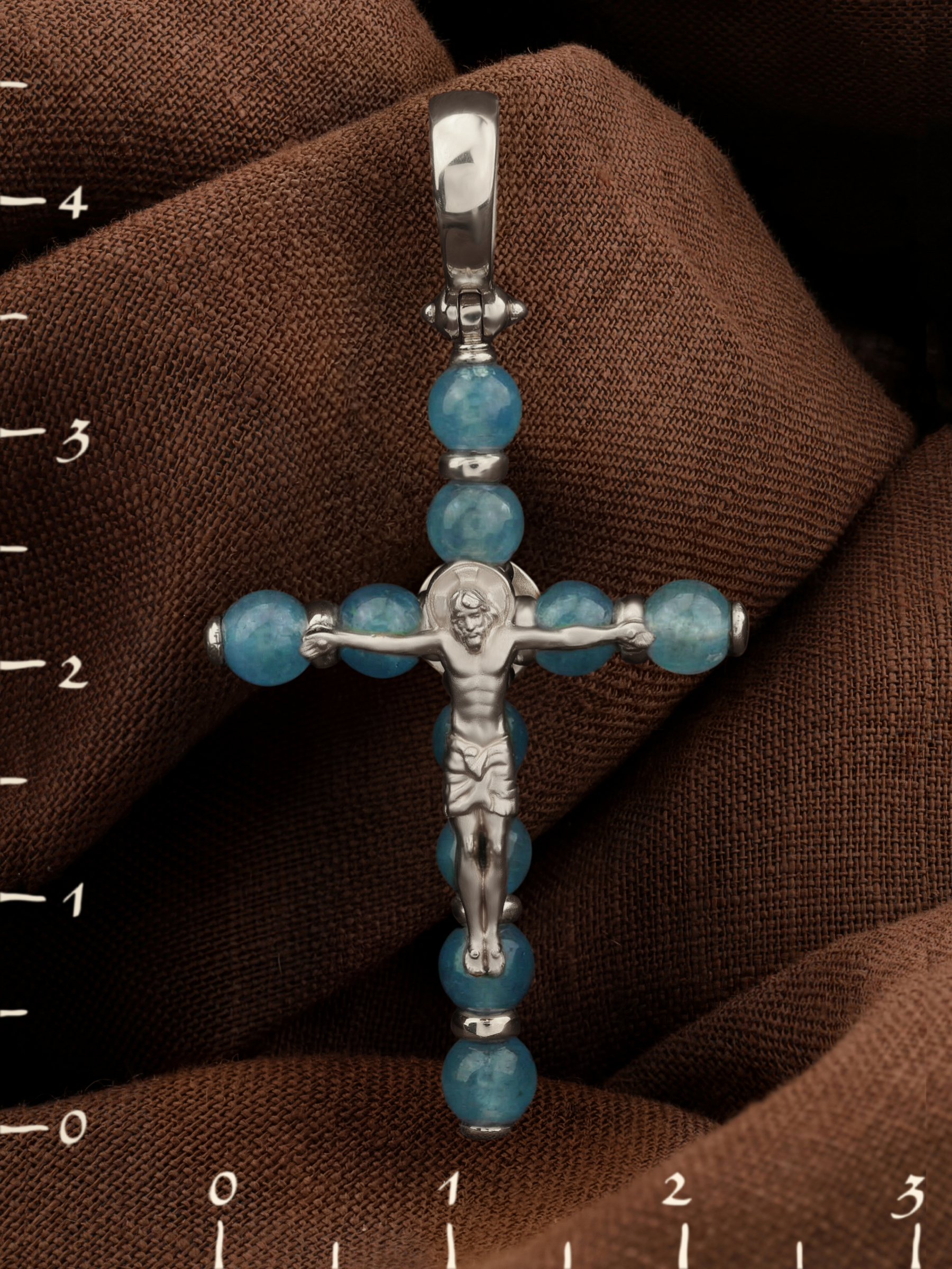 На лицевой стороне креста изображено Распятие Господа и Спасителя нашего Иисуса Христа. Своими крестными страданиями Господь смыл наши грехи, покрыл наш долг перед Богом или, на языке Писания, нас «искупил». В Голгофе сокрыта непостижимая тайна бесконечной правды и любви Бога. Крест стал символом победы добра над злом, жизни над смертью, напоминанием бесконечной Божьей любви, предметом радости. Воплотившийся Сын Божий Своею кровью освятил крест и сделал его проводником Своей благодати, источником освящения верующих. На верхней табличке, выше головы Иисуса, расположена надпись, составленная Понтием Пилатом — «IНЦI». Она означает «Иисус Назорей, Царь Иудейский». Надпись «IC» «ХC», означает Иисус Христос, помещаются на разных сторонах поперечной перекладины креста. Христос в Своей Божественной любви, над которой смерть не властна и которая, страдая, и не страдает в обычном смысле, простирает к людям со Креста Свои объятия, в которые призывается и привлекается весь мир. Поэтому Тело Его не висит, а торжественно покоится на Кресте.