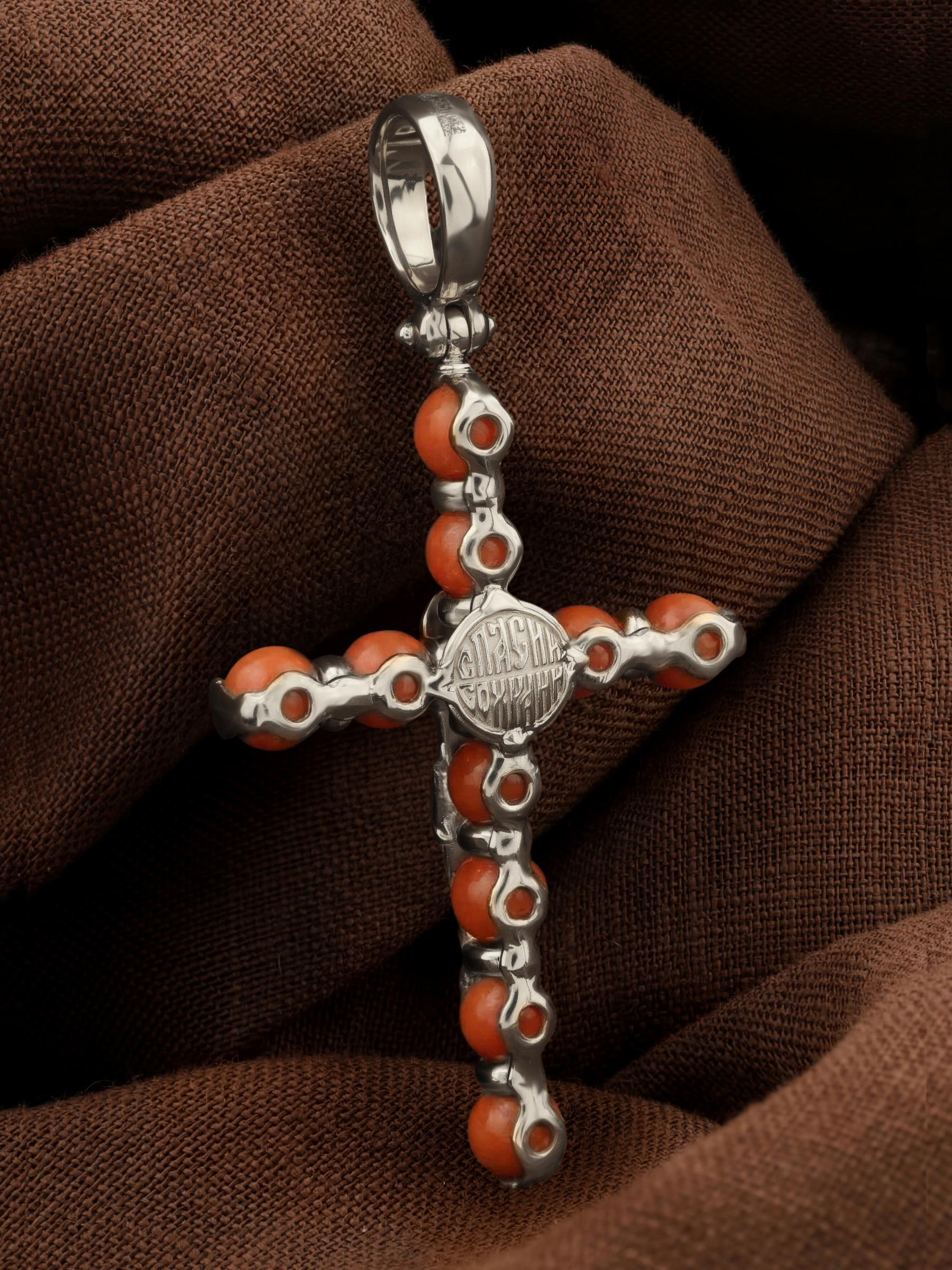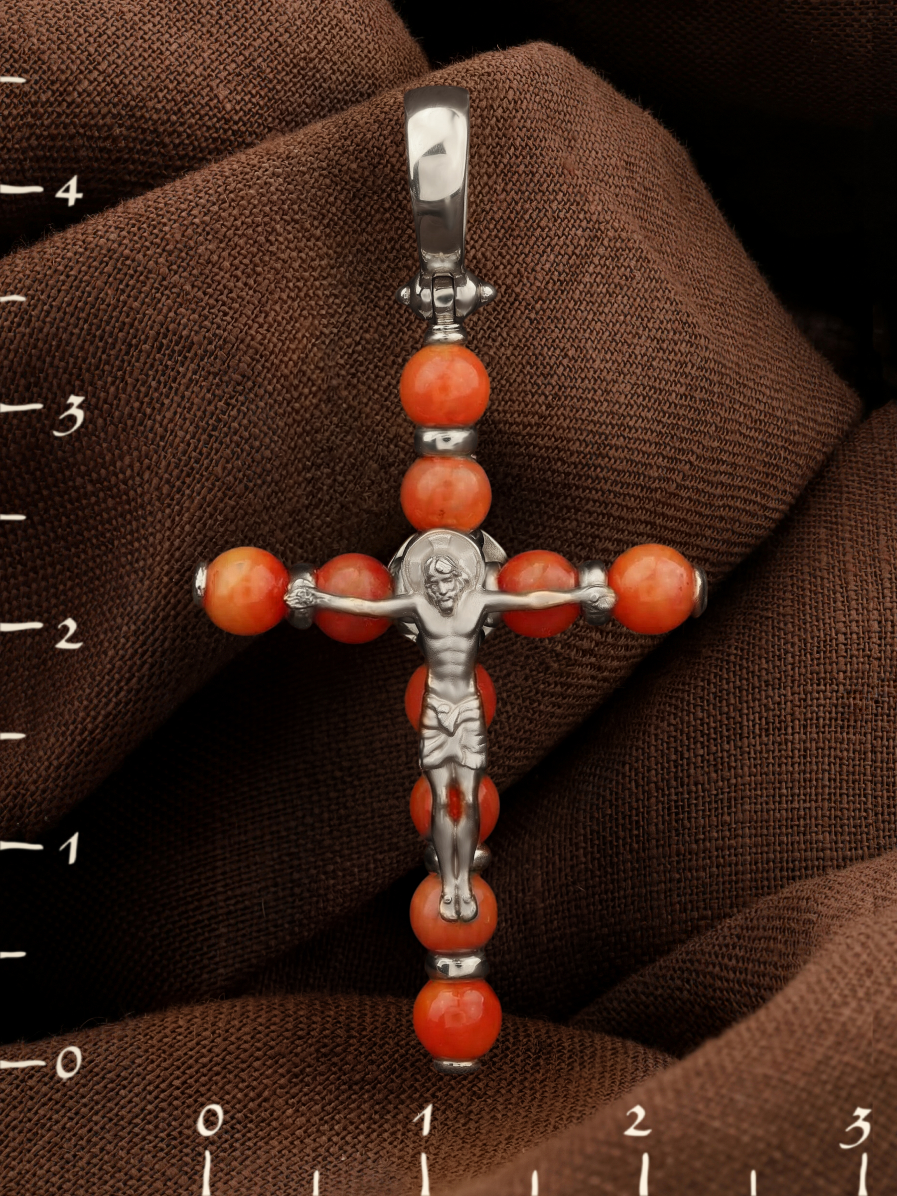 На лицевой стороне креста изображено Распятие Господа и Спасителя нашего Иисуса Христа. Своими крестными страданиями Господь смыл наши грехи, покрыл наш долг перед Богом или, на языке Писания, нас «искупил». В Голгофе сокрыта непостижимая тайна бесконечной правды и любви Бога. Крест стал символом победы добра над злом, жизни над смертью, напоминанием бесконечной Божьей любви, предметом радости. Воплотившийся Сын Божий Своею кровью освятил крест и сделал его проводником Своей благодати, источником освящения верующих. На верхней табличке, выше головы Иисуса, расположена надпись, составленная Понтием Пилатом — «IНЦI». Она означает «Иисус Назорей, Царь Иудейский». Надпись «IC» «ХC», означает Иисус Христос, помещаются на разных сторонах поперечной перекладины креста. Христос в Своей Божественной любви, над которой смерть не властна и которая, страдая, и не страдает в обычном смысле, простирает к людям со Креста Свои объятия, в которые призывается и привлекается весь мир. Поэтому Тело Его не висит, а торжественно покоится на Кресте.