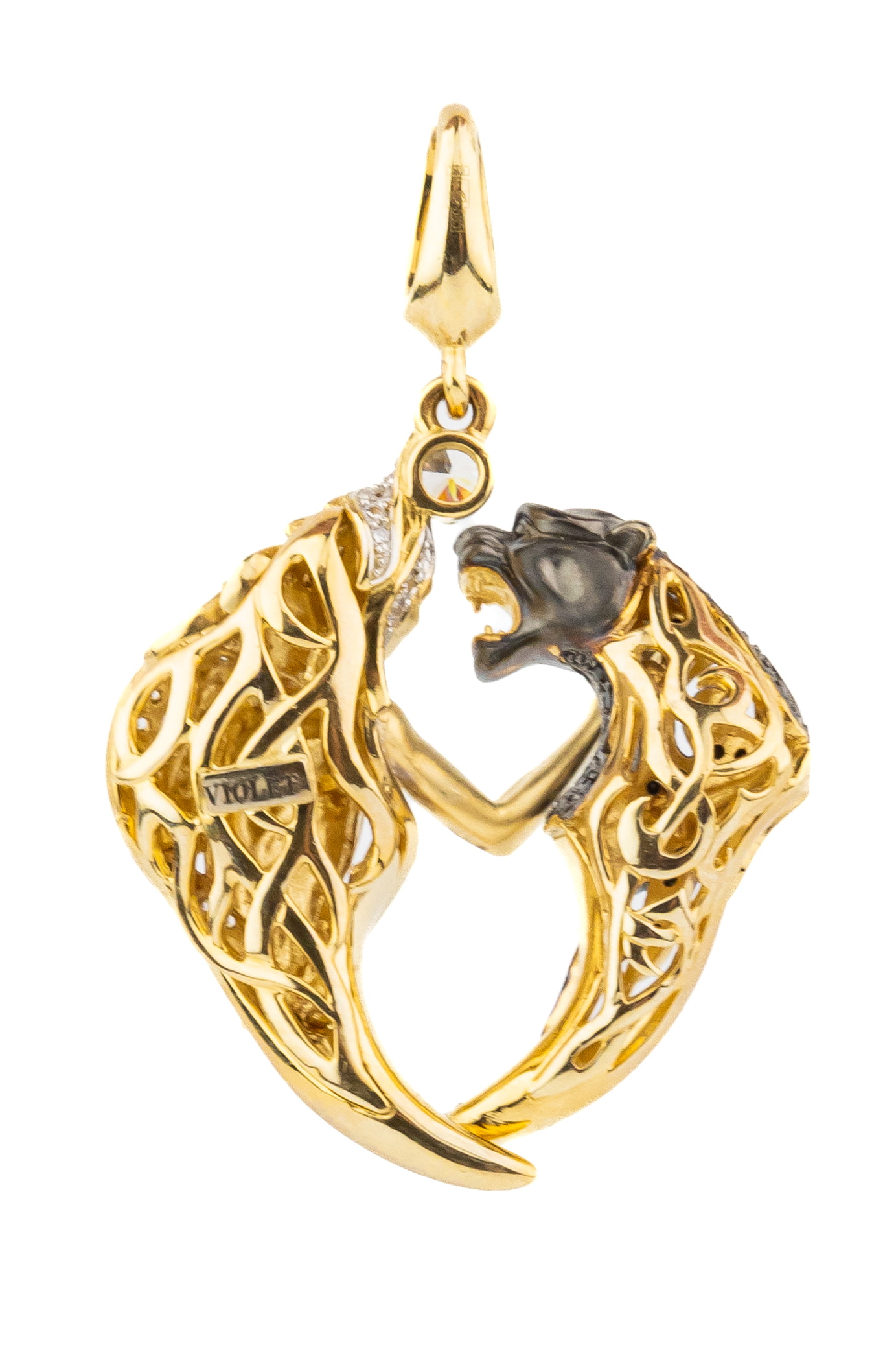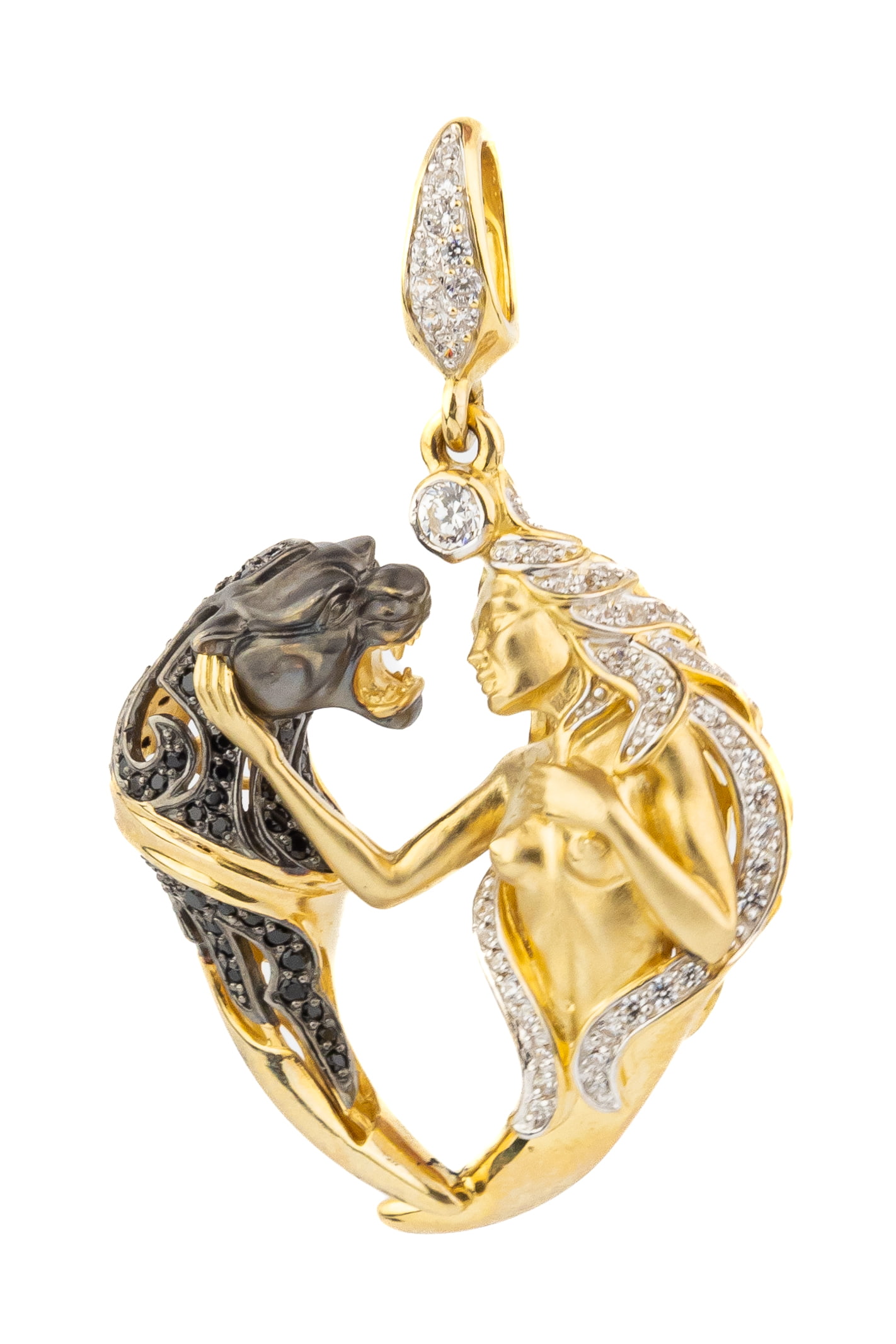 Роскошная подвеска из коллекции De Luxe — Мифология воплощает в себе магию мифологических сюжетов и безупречное ювелирное мастерство. Это украшение выполнено из лимонного золота 585 пробы, чей благородный солнечный оттенок идеально подчеркивает художественную сложность композиции. Дизайн изделия отсылает к древним легендам: изящный силуэт героини, выполненный в металле, гармонично сочетается с образом грациозного хищника, создавая эффектный и выразительный контраст.